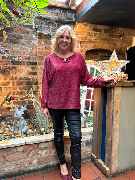 Wine Button Sleeve Shimmer Top Stevie