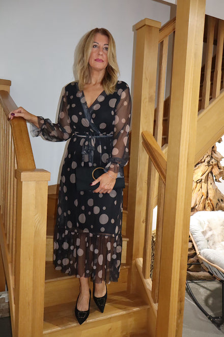 Chocolate Polka Dot Belted Mesh Dress Alana