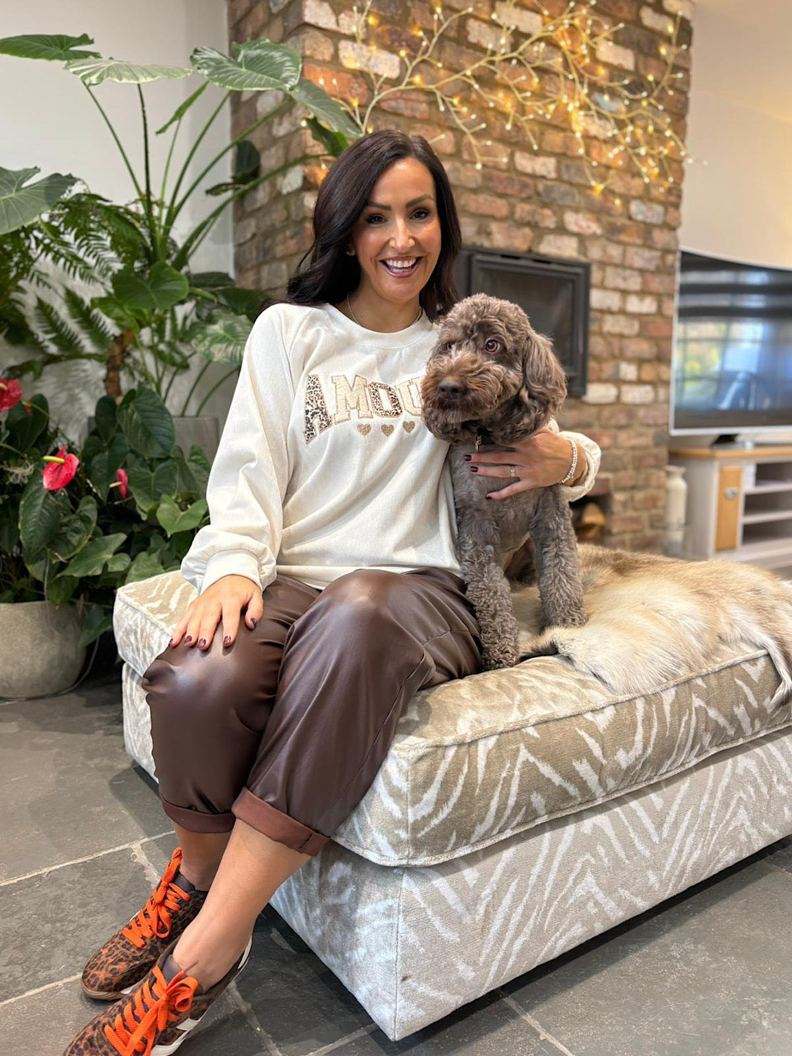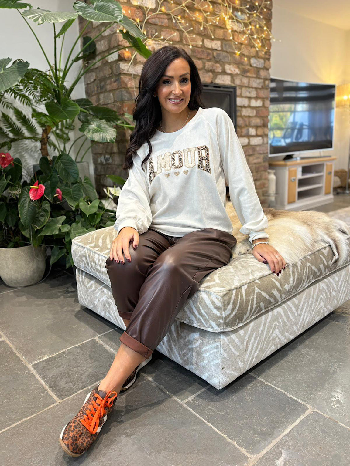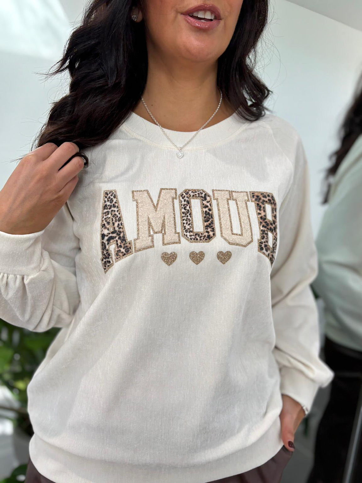 Introducing the Amour Sweatshirt Odette—a luxurious piece that combines comfort with timeless elegance. Crafted from soft brushed velour, this sweatshirt feels wonderfully gentle against your skin. The charming design of multi texture wording is elevated with delicate gold foil detailing and tiny diamantes that catch the light beautifully, adding a touch of sparkle to your everyday wardrobe. Perfect for those moments when you want to feel both cosy and special, this sweatshirt effortlessly transitions from relaxed loungewear to a statement piece worth showing off.
