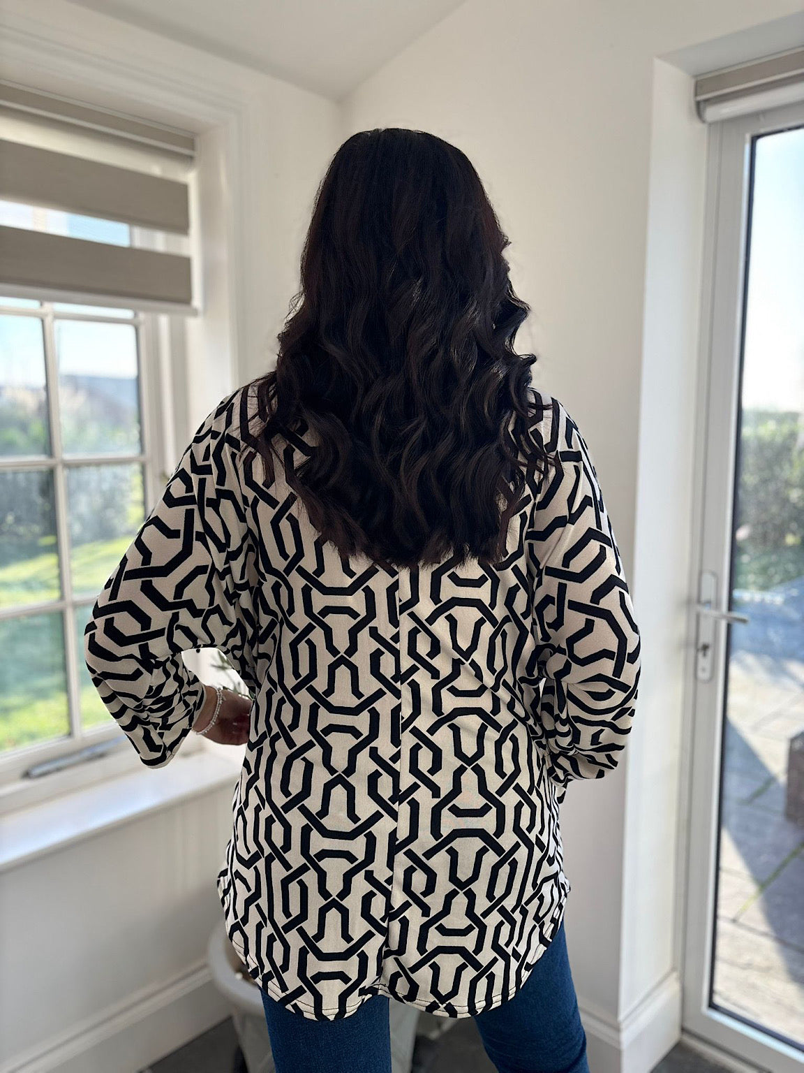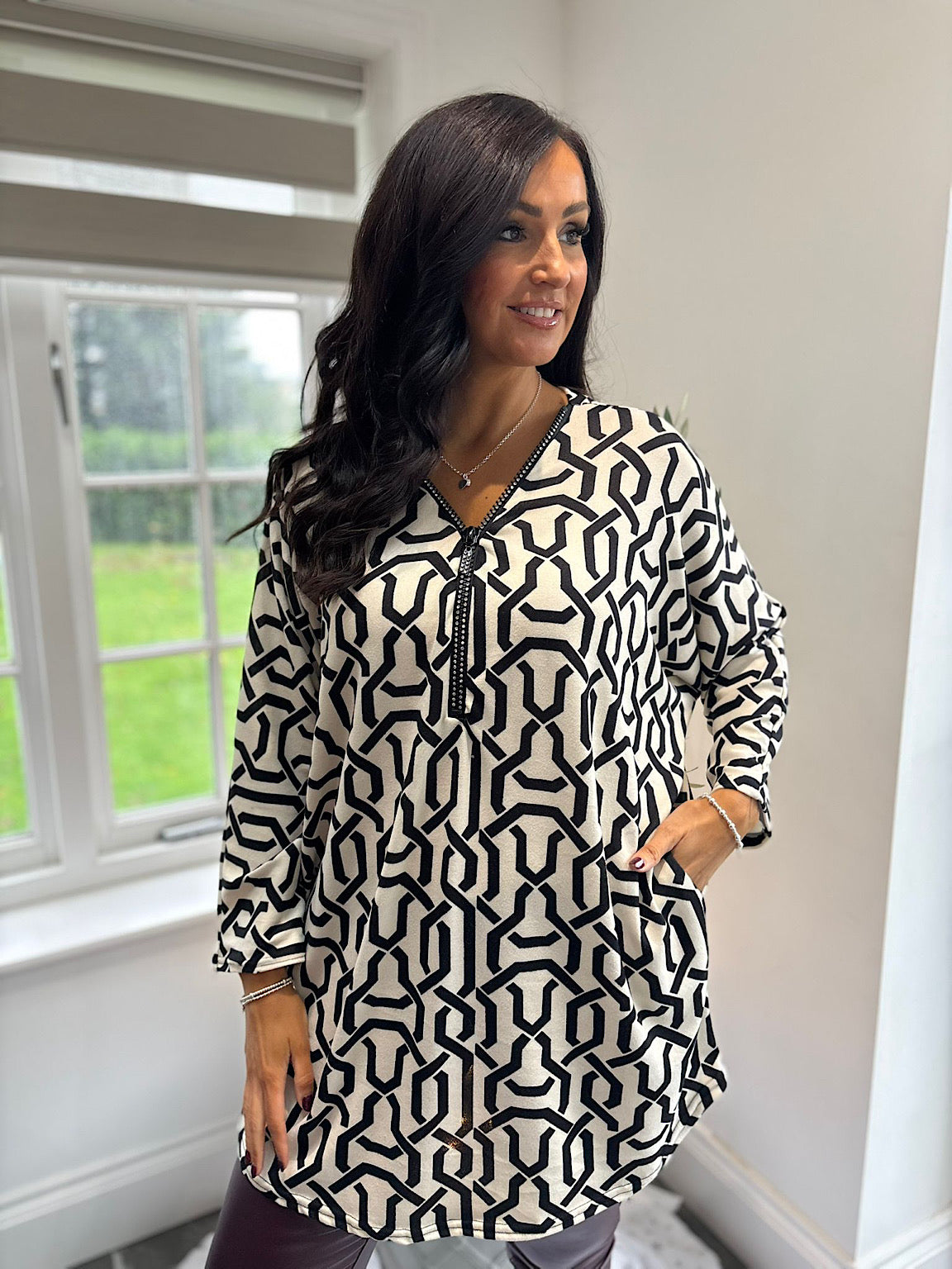 This Longline Patterned Zip Top Cassie combines style with comfort, featuring a soft fabric that feels gentle against your skin. Its longline cut offers flattering coverage, while the elegant diamante zip adds a touch of sparkle and ease for dressing. Perfect for layering or wearing on its own, this top supports your look with both subtle charm and practical design.