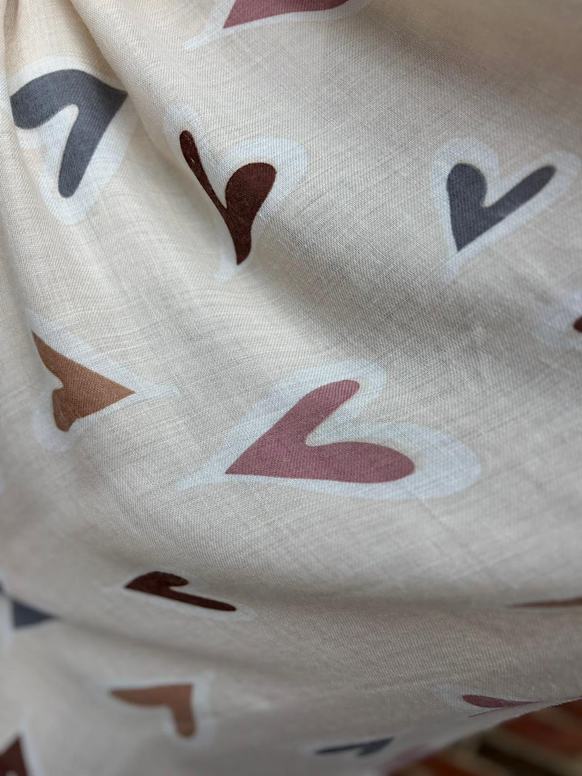 Wrap yourself in gentle warmth with the Graphic Heart Scarf. Featuring a soft raw edge design and a charming multi heart pattern, this scarf adds a delicate touch to any outfit while keeping you cosy. Its subtle cream shade pairs effortlessly with both casual and dressy looks, making it a versatile accessory that supports your style every day.