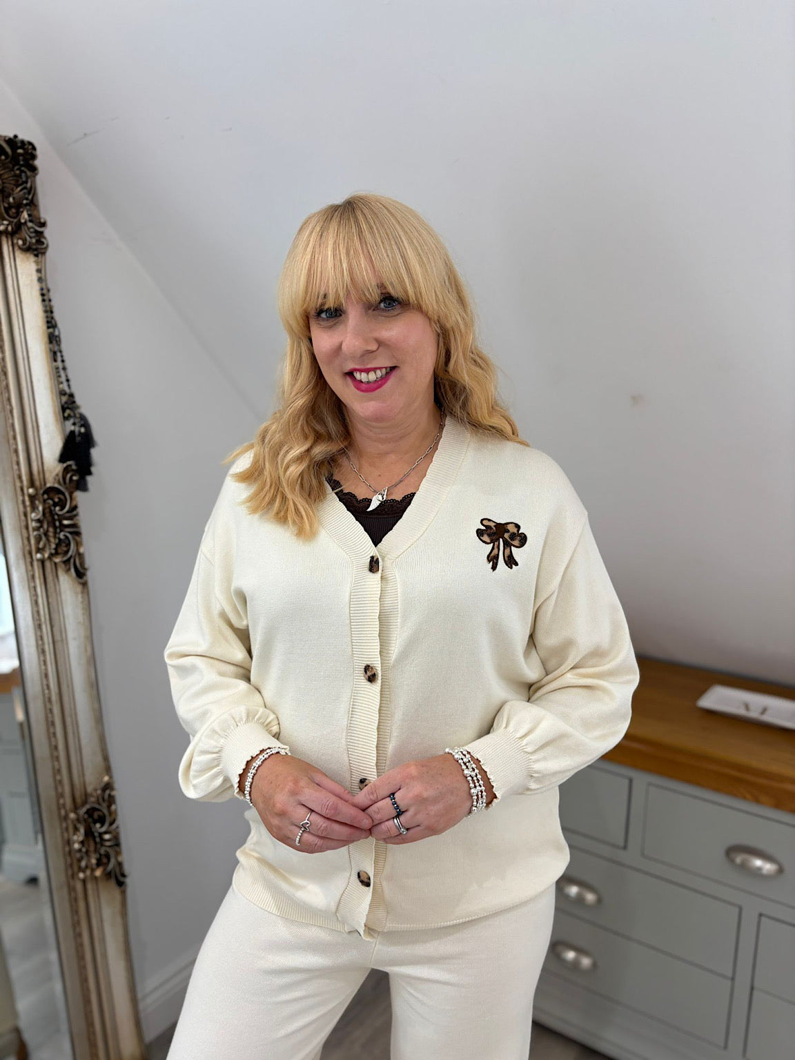 The Leopard Bow Cardi Georgina is made from quality fabric for a comfortable and durable wear. It features a button fastening for easy wear, complemented by an embroidered leopard print bow with gold fleck accents, adding a touch of stylish elegance. This cardigan is designed to support your wardrobe with both practicality and a refined look. Pair with our Georgina Trousers for a complete look.