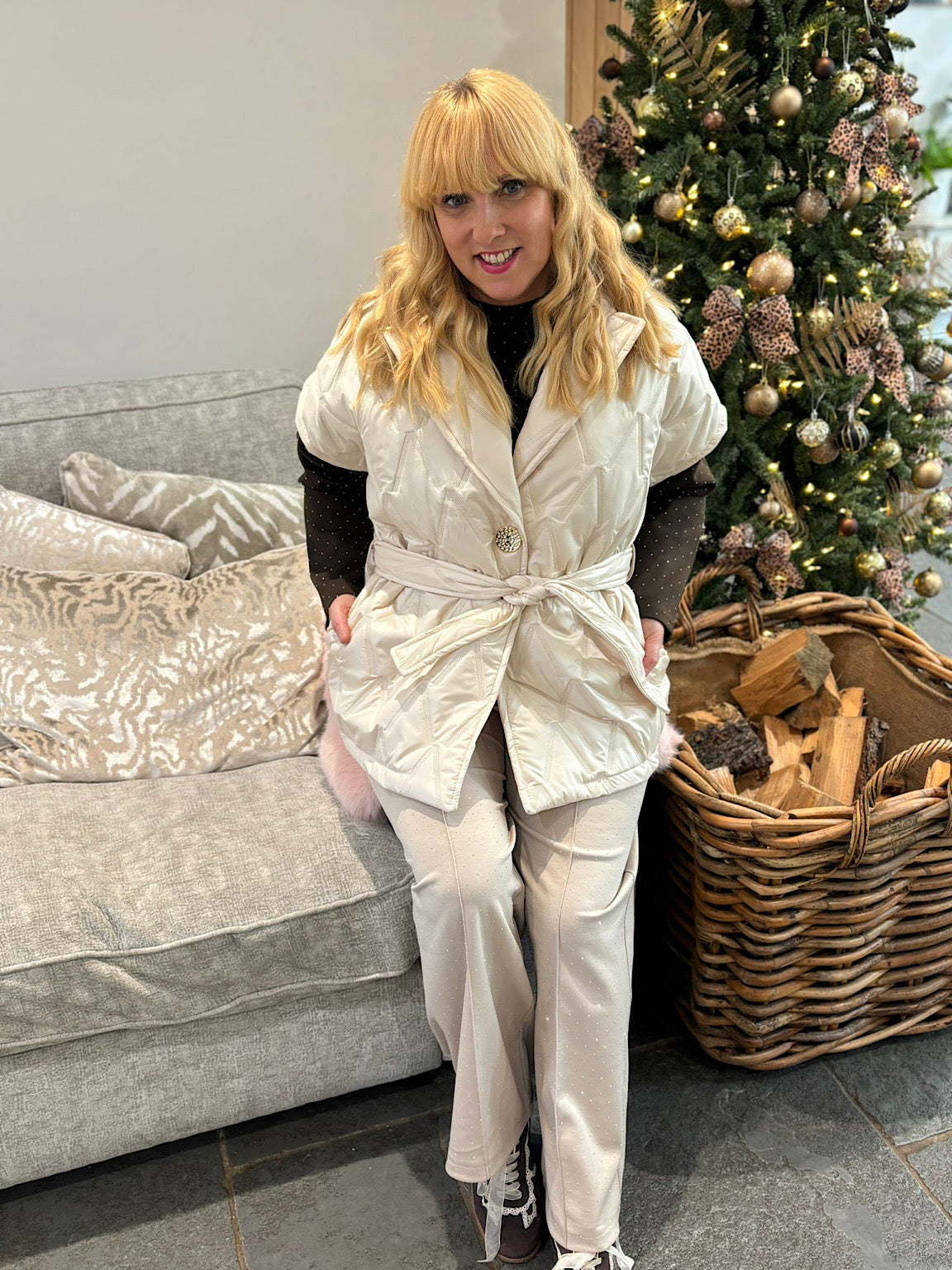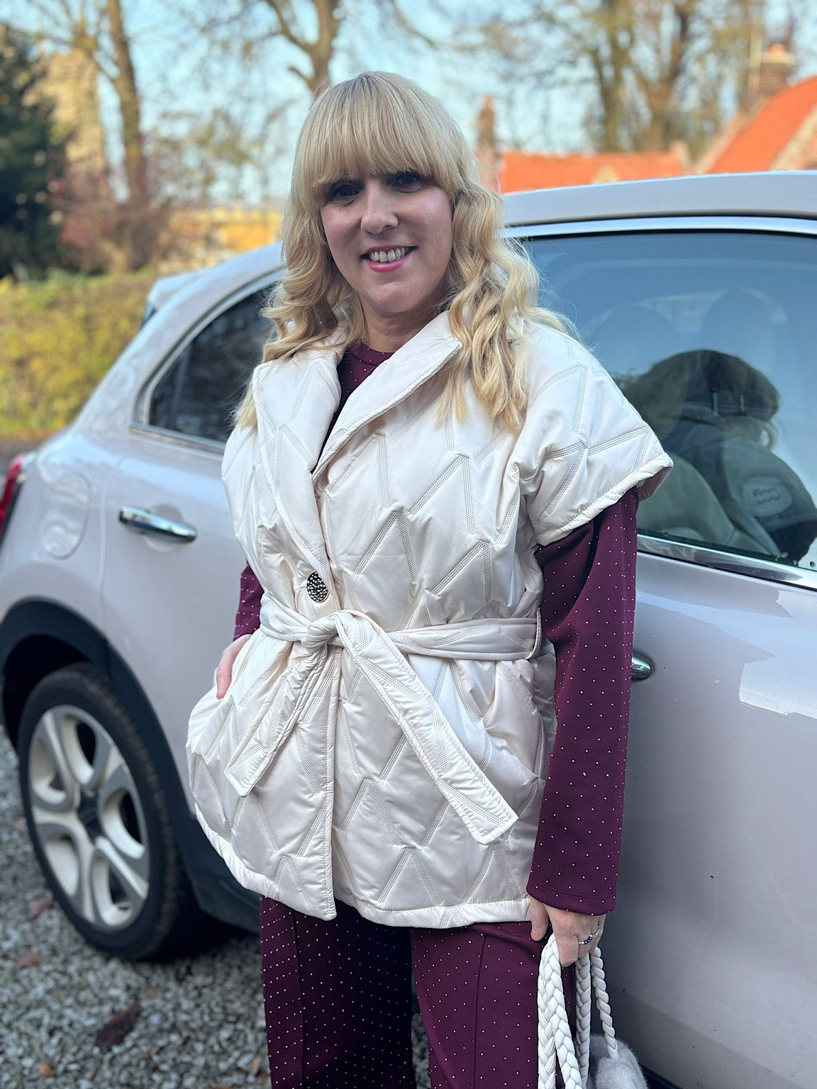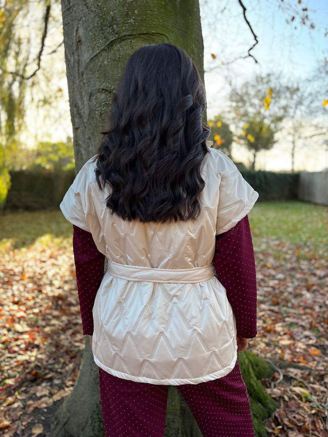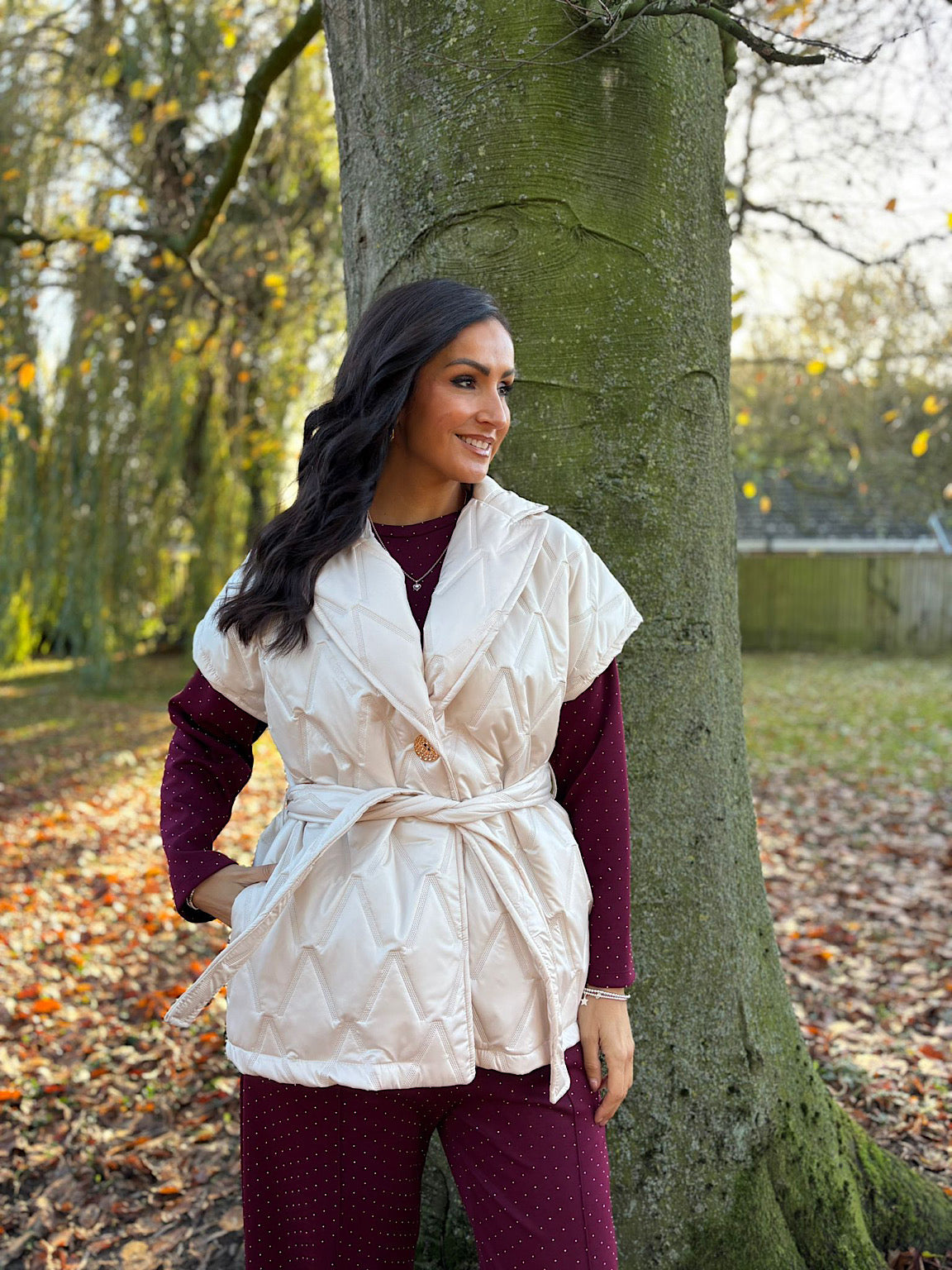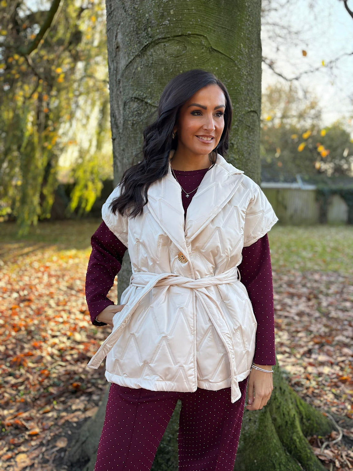 Elevate your layering game with the Quilted Gilet Hollie, designed to keep you warm and stylish. The quilted construction offers lightweight insulation perfect for transitional weather, while the elegant V-neckline flatters any frame. A striking hammered gold button provides a refined finishing touch, and the detachable matching belt gives you the freedom to cinch and shape as you please. Whether you're dressing up or keeping it casual, this versatile gilet works beautifully with everything in your wardrobe.