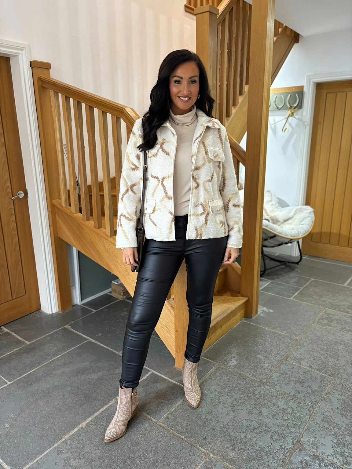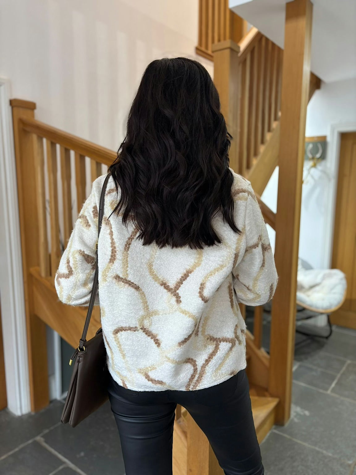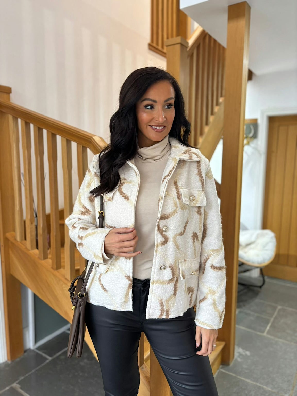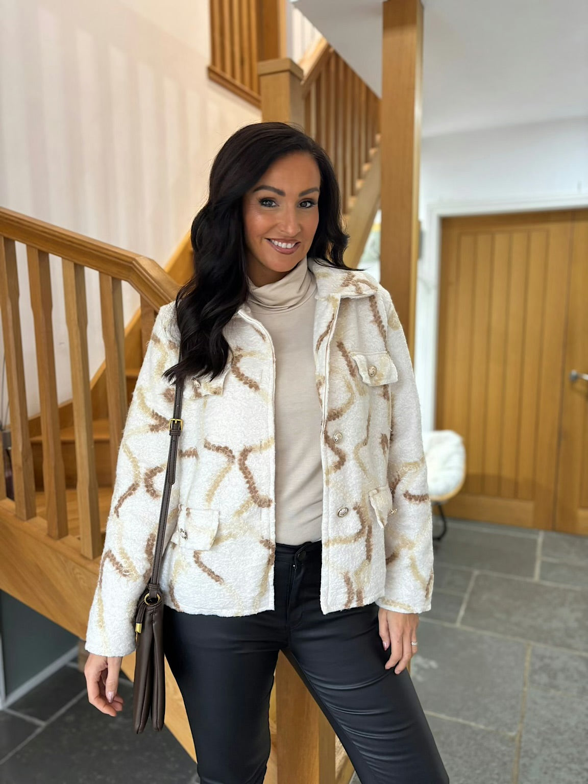 Meet the Swirl Pattern Coat Elsa—a timeless piece designed to elevate your everyday style. Featuring a beautifully soft fabric adorned with an elegant swirl pattern, this coat offers both visual appeal and tactile comfort. The thoughtfully designed false pockets create a streamlined look, whilst distinctive gold button accents provide a sophisticated finishing touch. Versatile enough for any occasion, this coat supports your personal style with quality construction and enduring elegance.