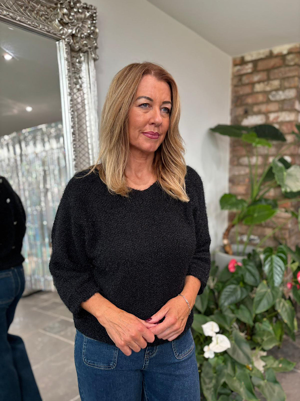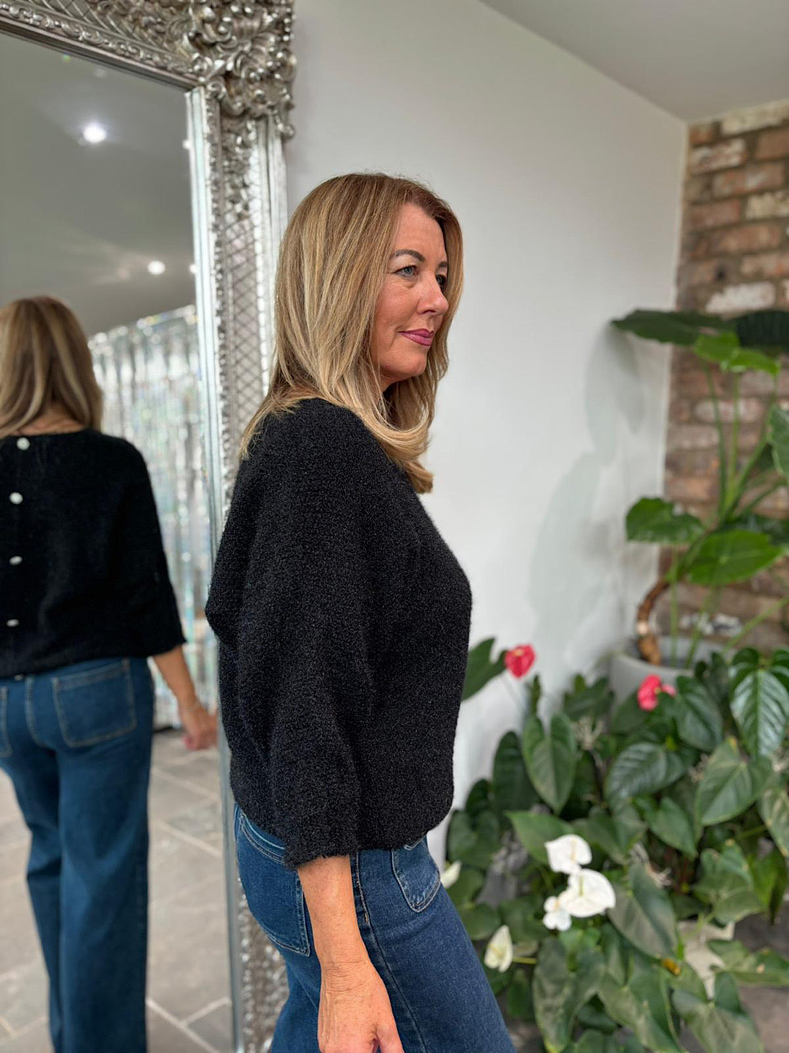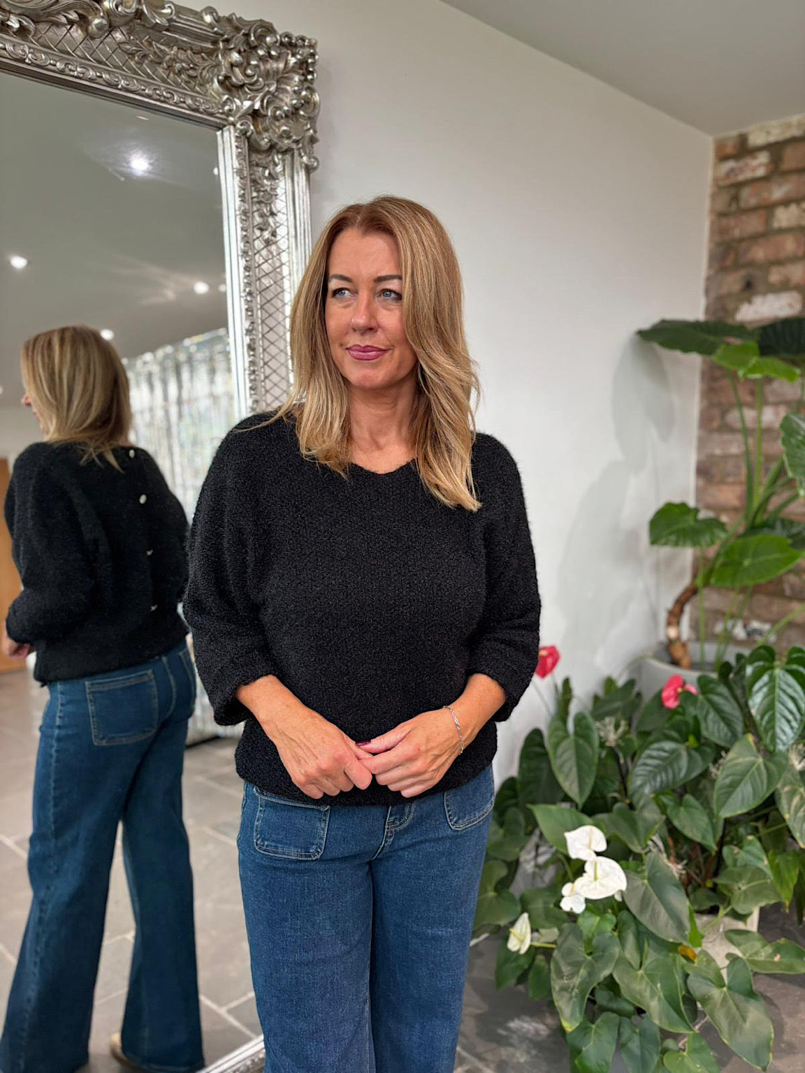 The Back Detail Knit Top Billie features elegant batwing sleeves and delicate button detailing along the back, adding a sophisticated touch to your outfit. Crafted from subtly shimmering fabric, this top brings a soft glow to your look, perfect for both day and evening wear. Comfortable and stylish, it supports your confident, graceful style effortlessly.