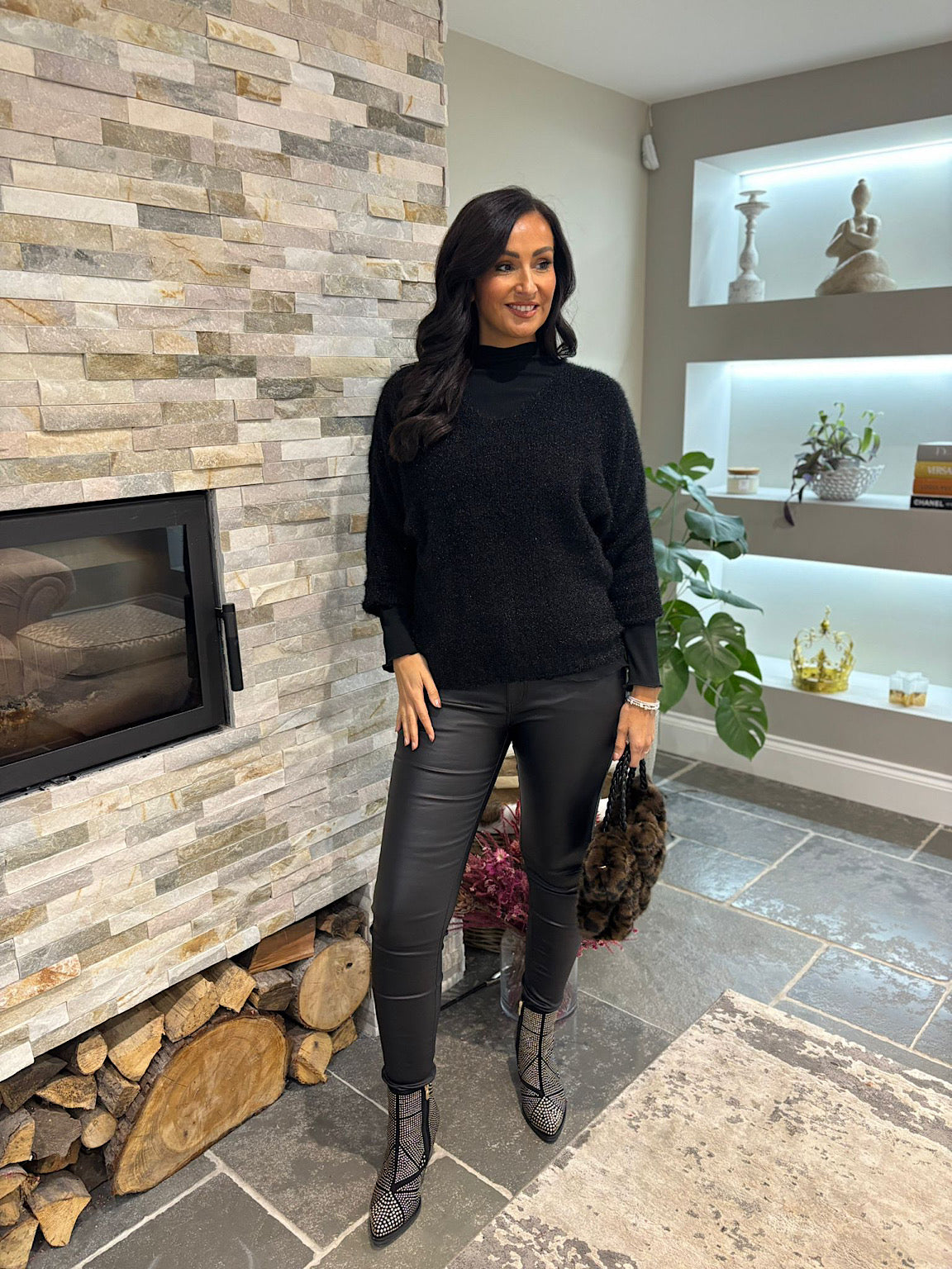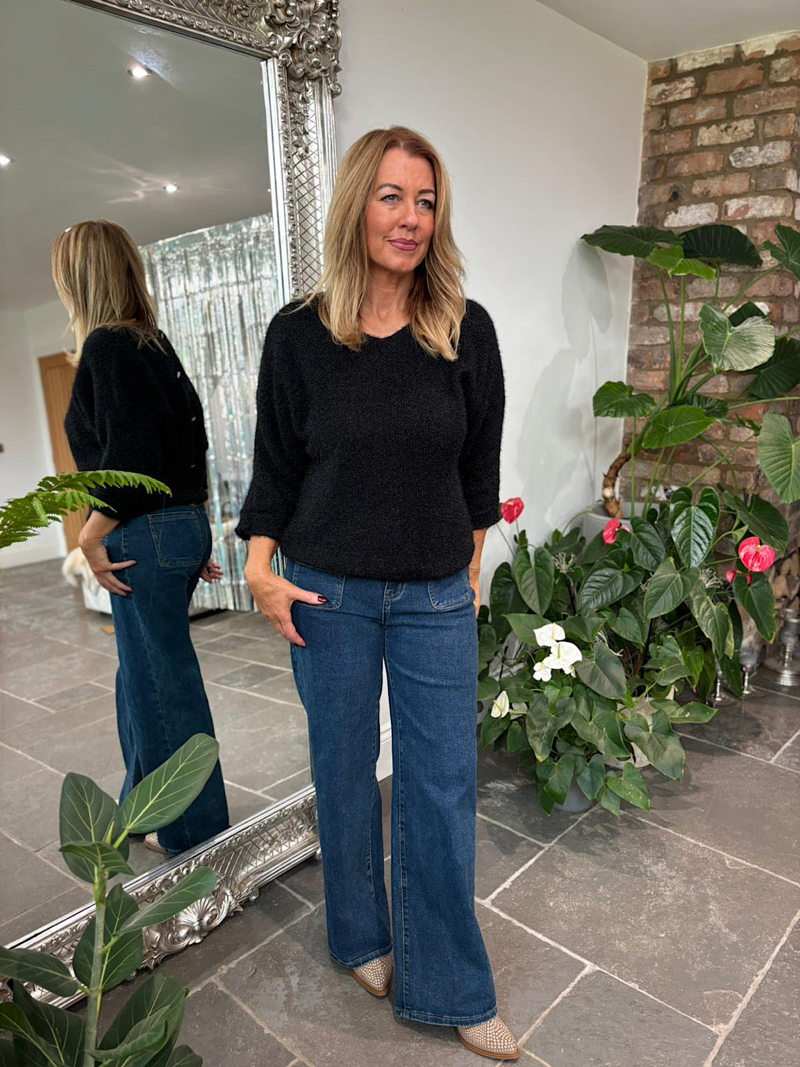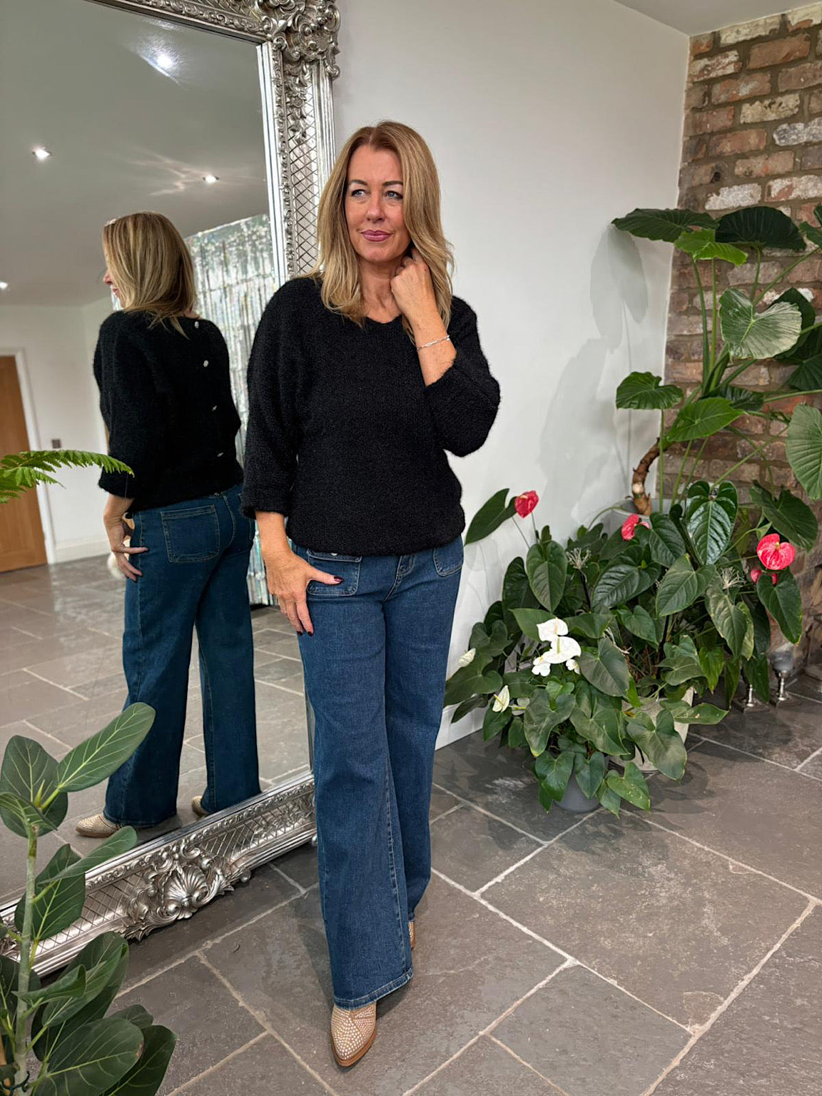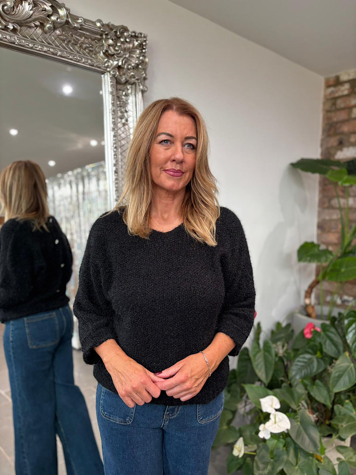The Back Detail Knit Top Billie features elegant batwing sleeves and delicate button detailing along the back, adding a sophisticated touch to your outfit. Crafted from subtly shimmering fabric, this top brings a soft glow to your look, perfect for both day and evening wear. Comfortable and stylish, it supports your confident, graceful style effortlessly.