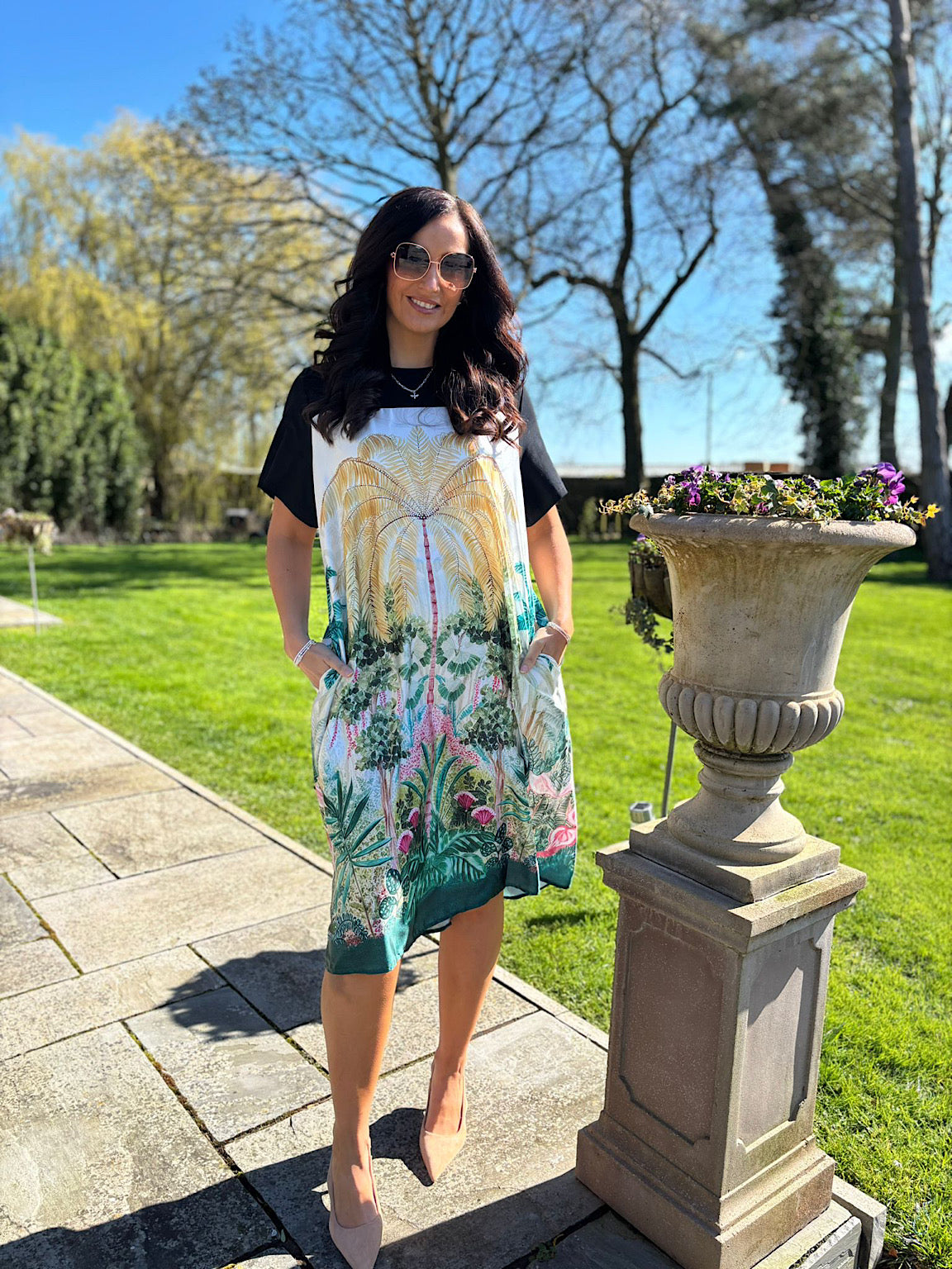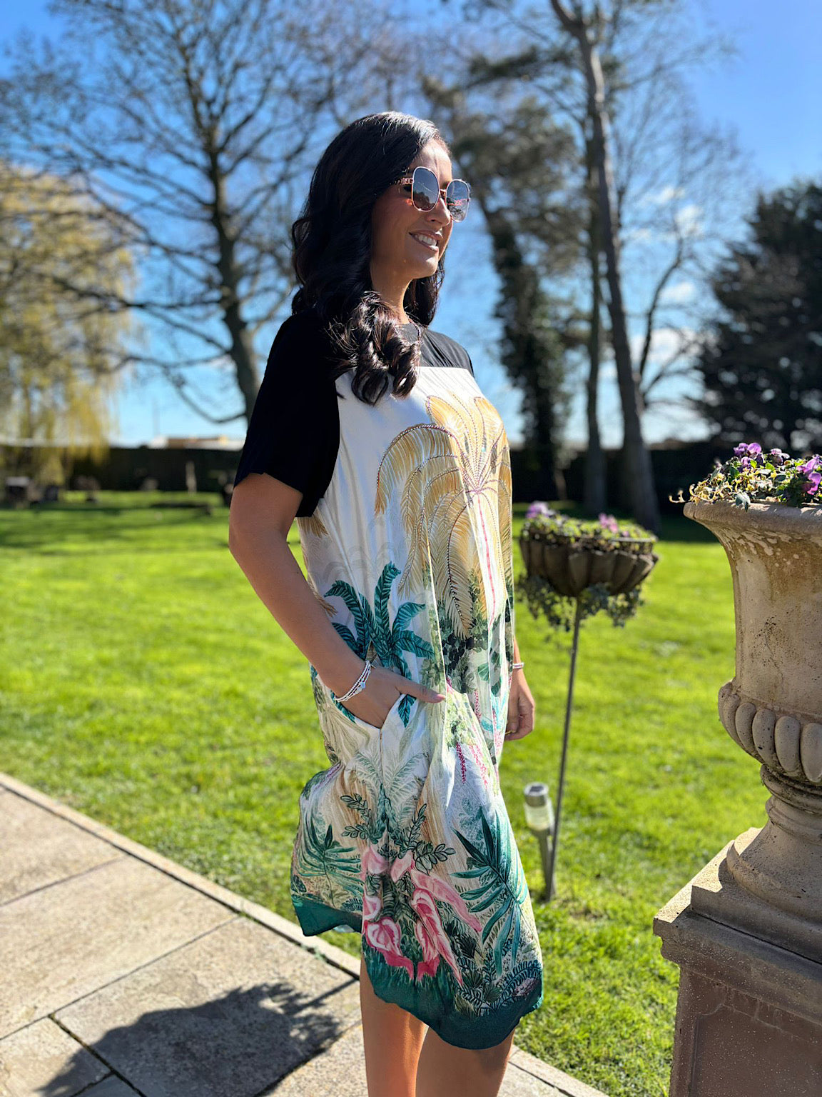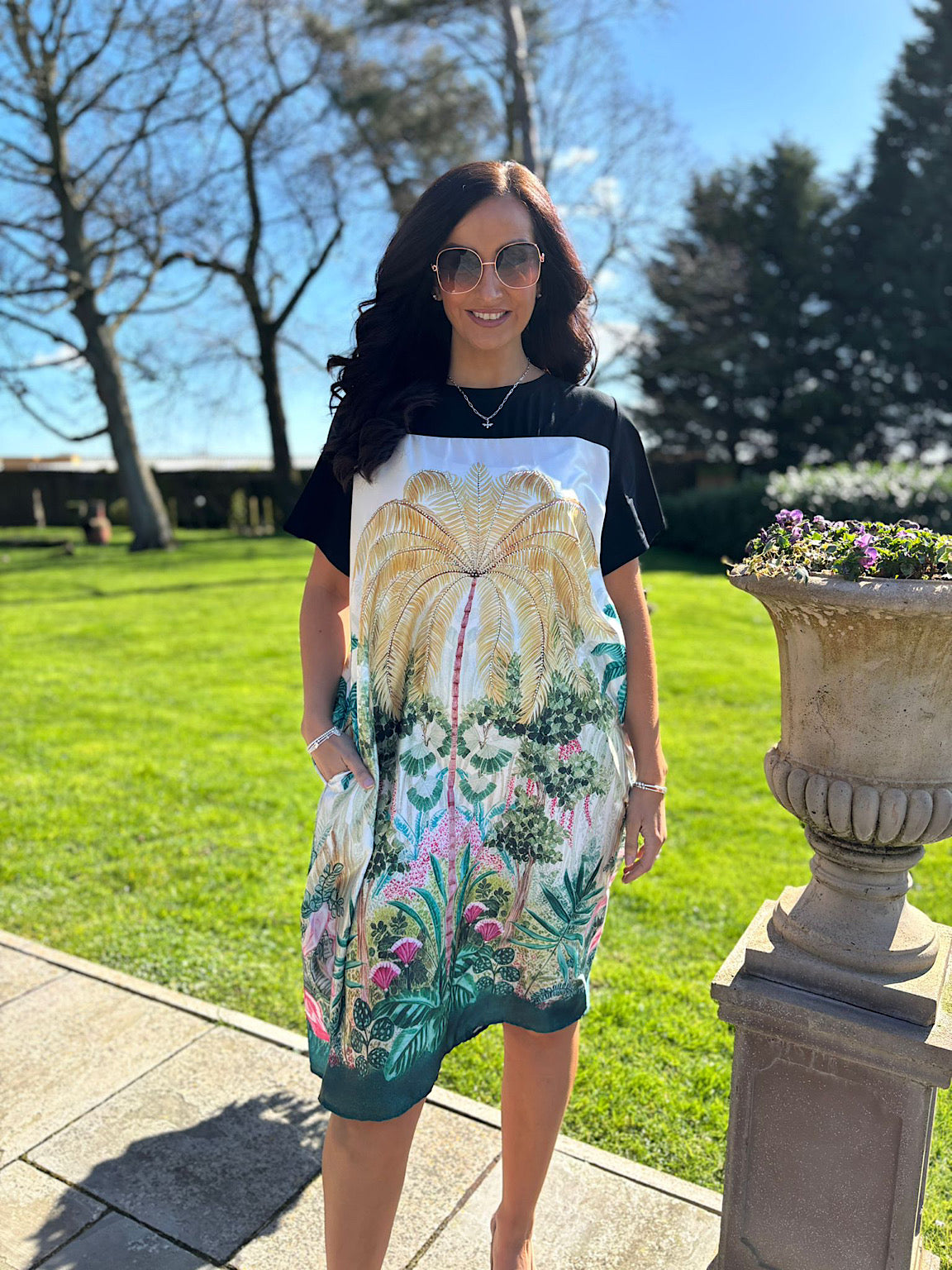 Absolutely stunning, this Black Botanical Palm T-Shirt Dress Luna combines comfort with elegance. The soft t-shirt fabric across the top transitions seamlessly into a luxurious satin-style body, adorned with delicate diamantes that catch the light beautifully. The tropical palm tree design shines with every movement, while the flowing silhouette creates an effortlessly graceful look. Perfect for those who want to make a statement with understated sophistication.