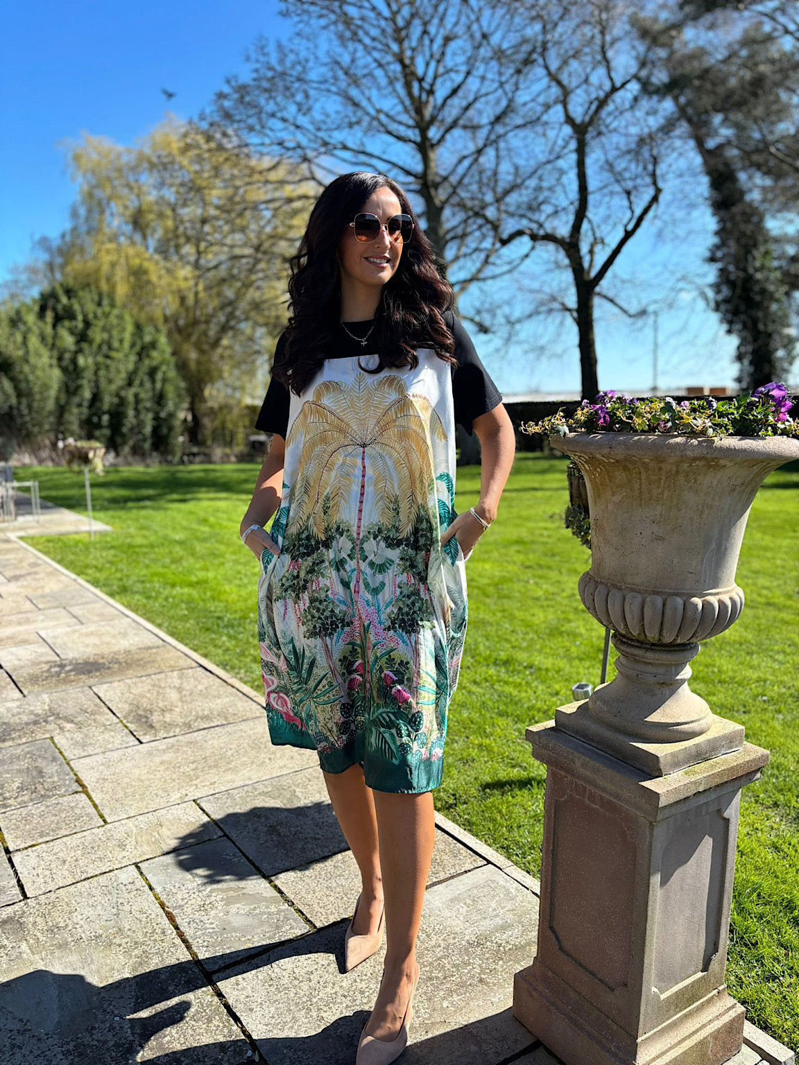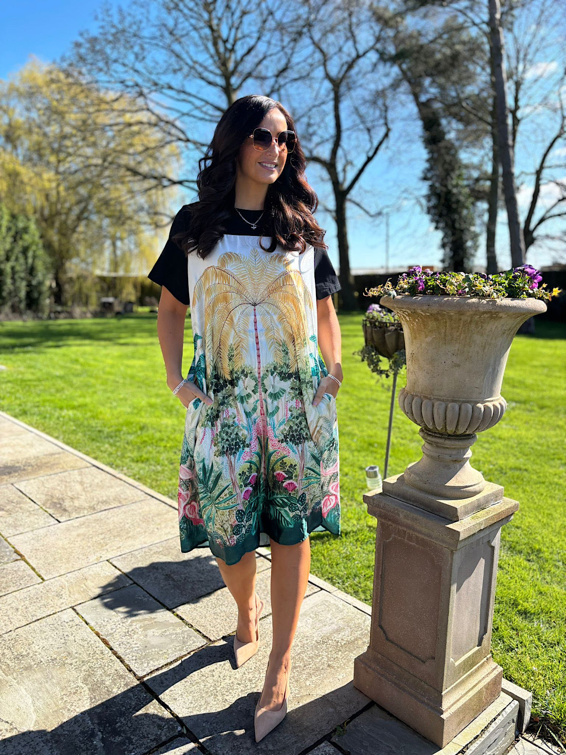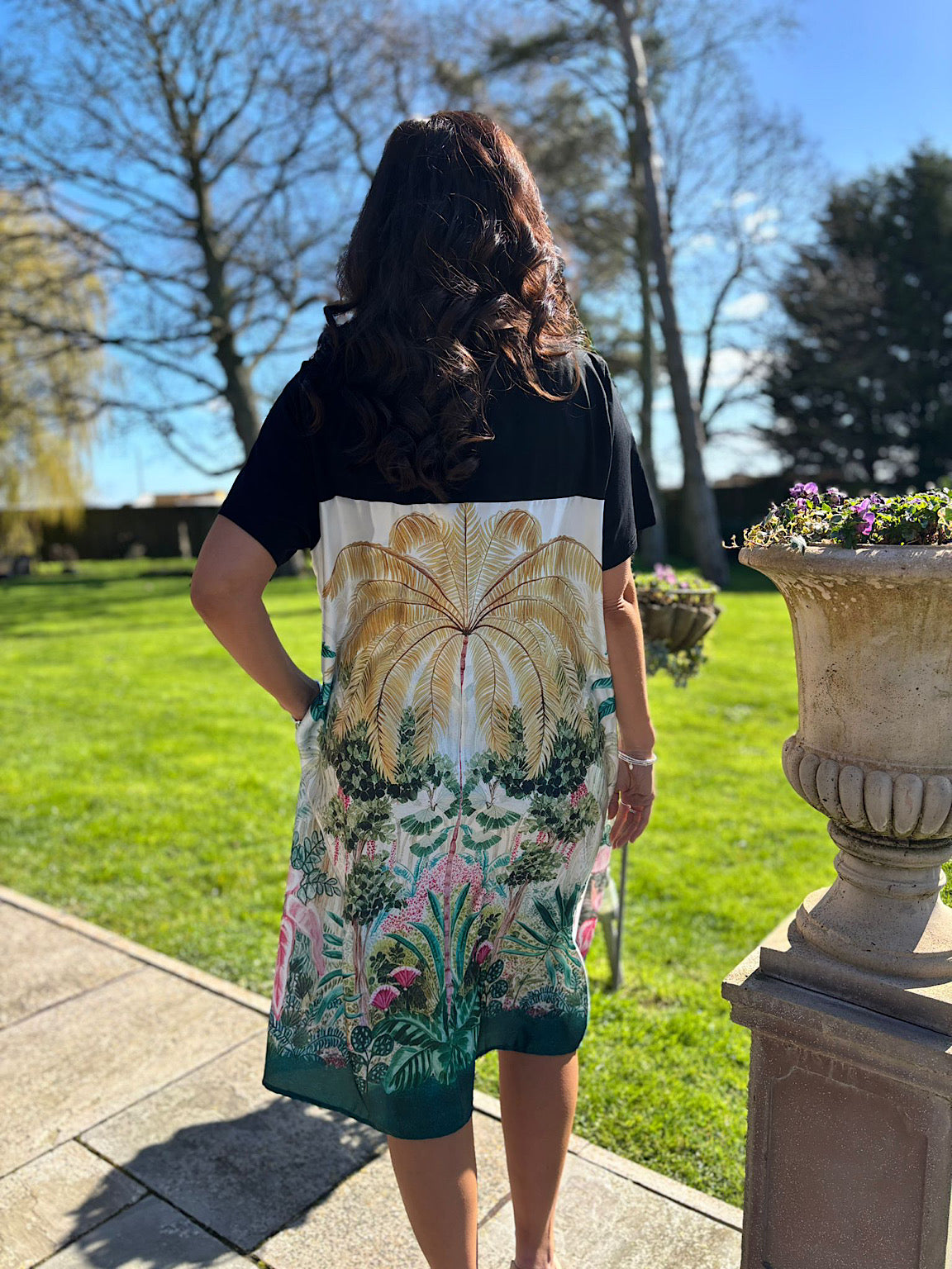 Absolutely stunning, this Black Botanical Palm T-Shirt Dress Luna combines comfort with elegance. The soft t-shirt fabric across the top transitions seamlessly into a luxurious satin-style body, adorned with delicate diamantes that catch the light beautifully. The tropical palm tree design shines with every movement, while the flowing silhouette creates an effortlessly graceful look. Perfect for those who want to make a statement with understated sophistication.