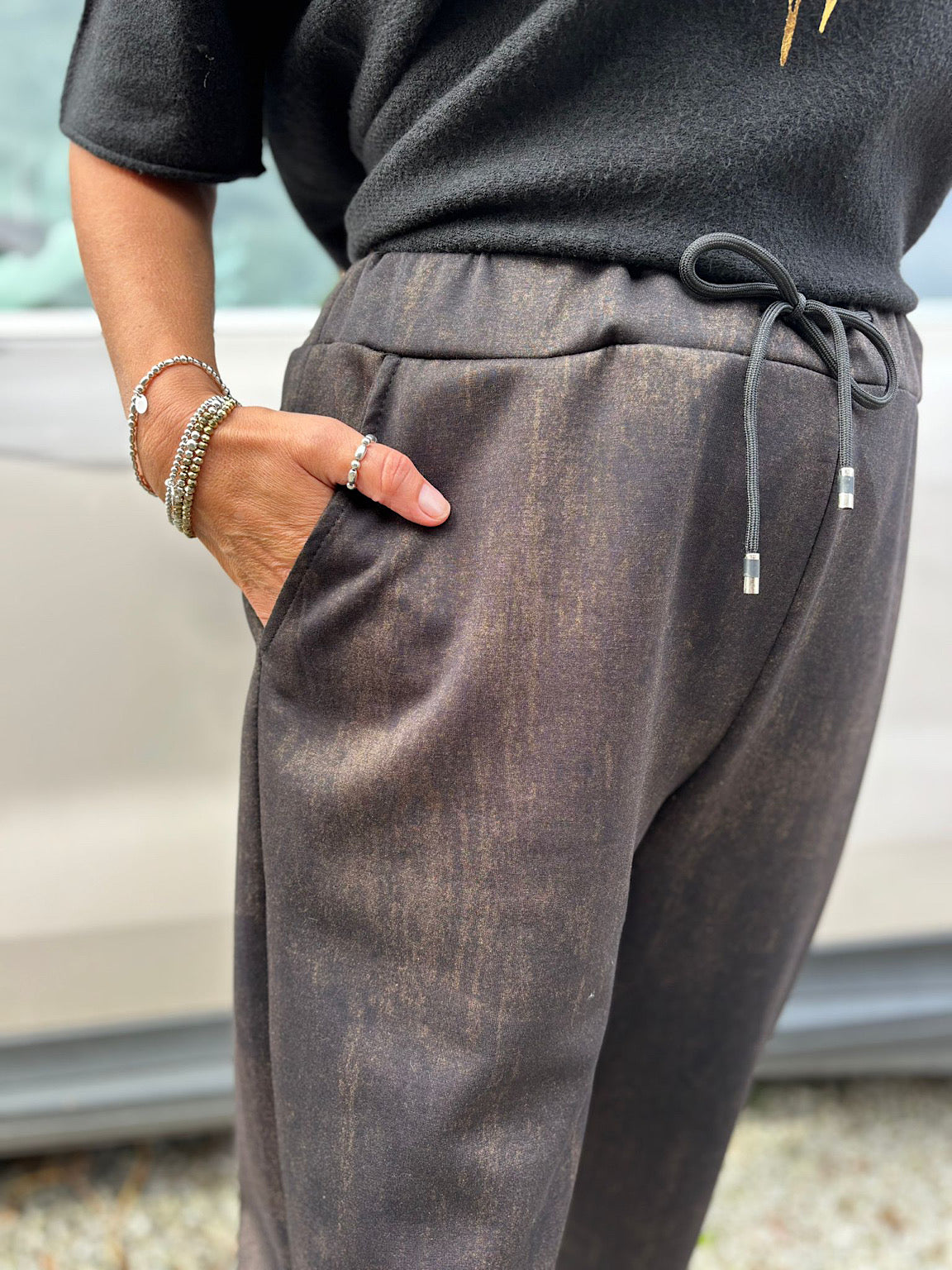 These Brushstroke Shimmer Joggers offer a relaxed fit with a soft brushed pattern highlighted by a subtle gold shimmer. Featuring a drawstring elasticated waist, they provide adjustable comfort and style perfect for your everyday casual looks. Pair with our Natalia Sweatshirt for a complete look.