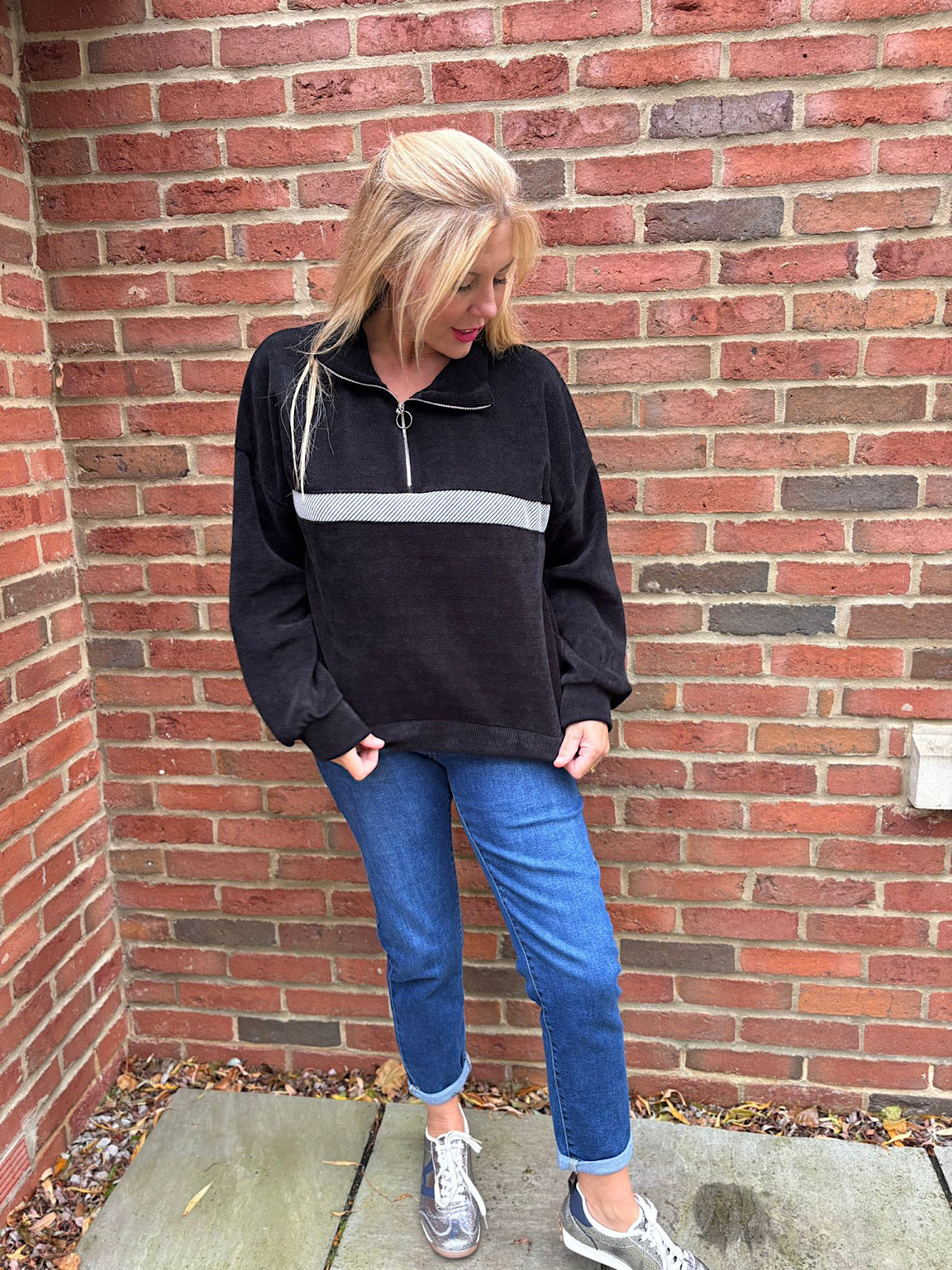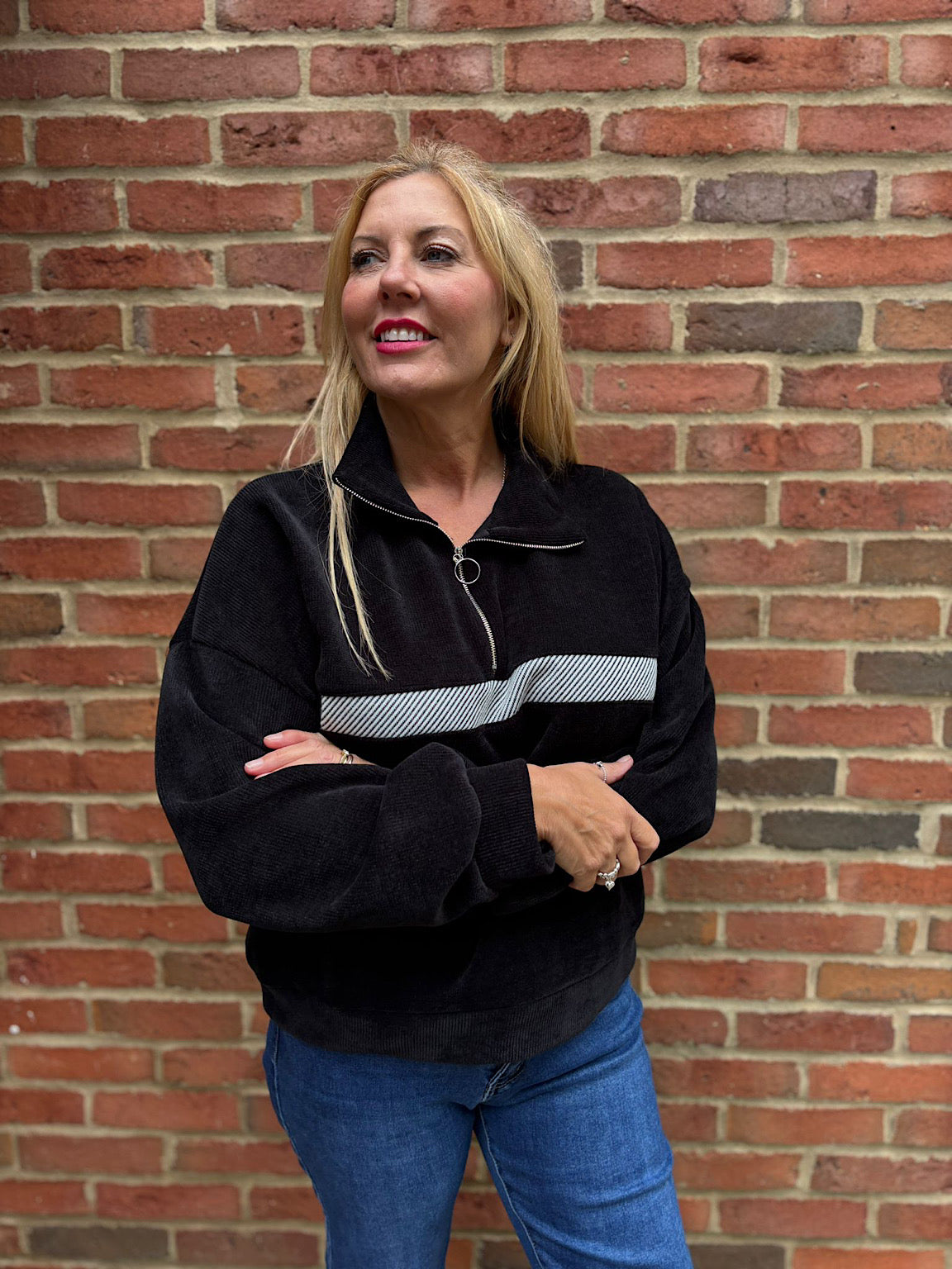 Embrace cosy comfort with this Chenille Half Zip Jumper Hazel. Crafted from luxuriously soft chenille fabric, it features a practical half zip design for easy layering and temperature control. The eye-catching patterned stripe running through the centre adds a touch of visual interest to your everyday wardrobe. Perfect for relaxed days at home or casual outings, this jumper combines tactile softness with effortless style.