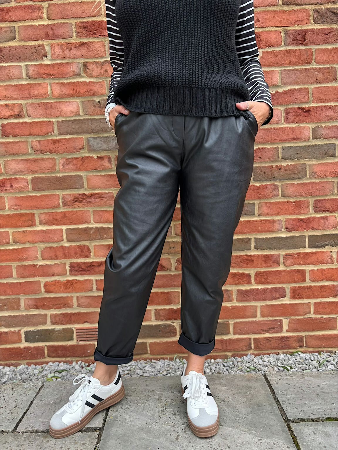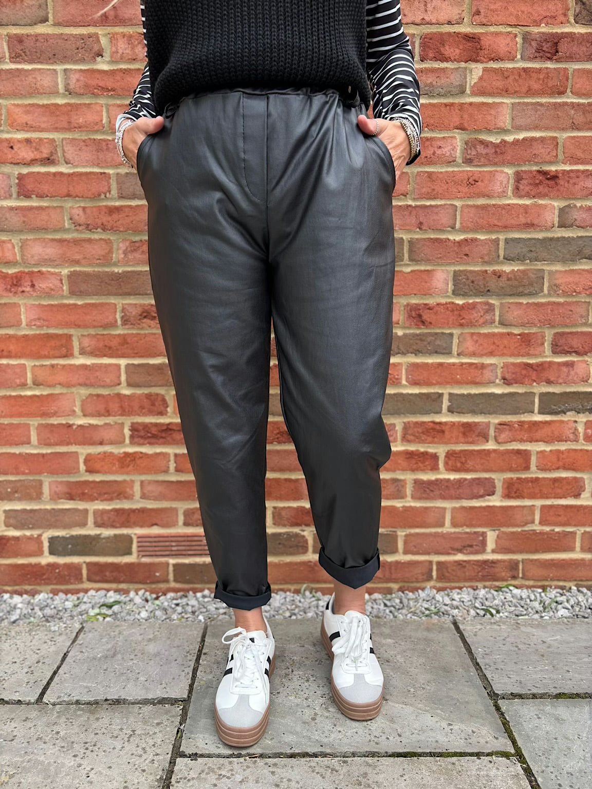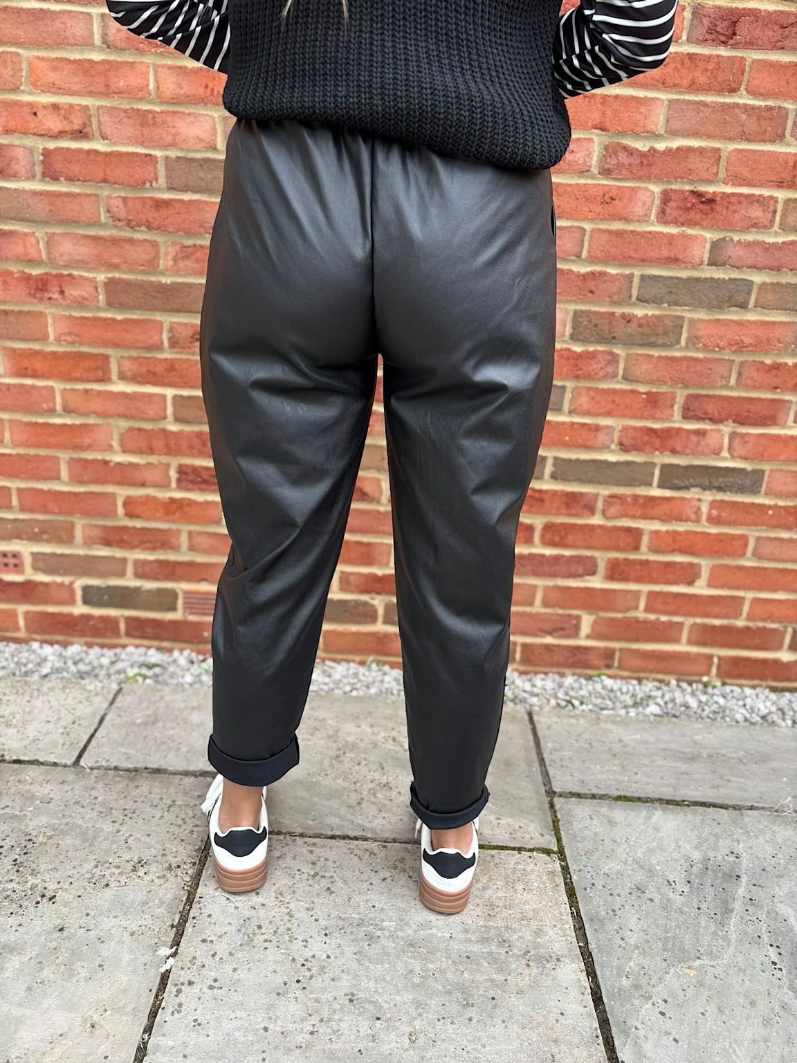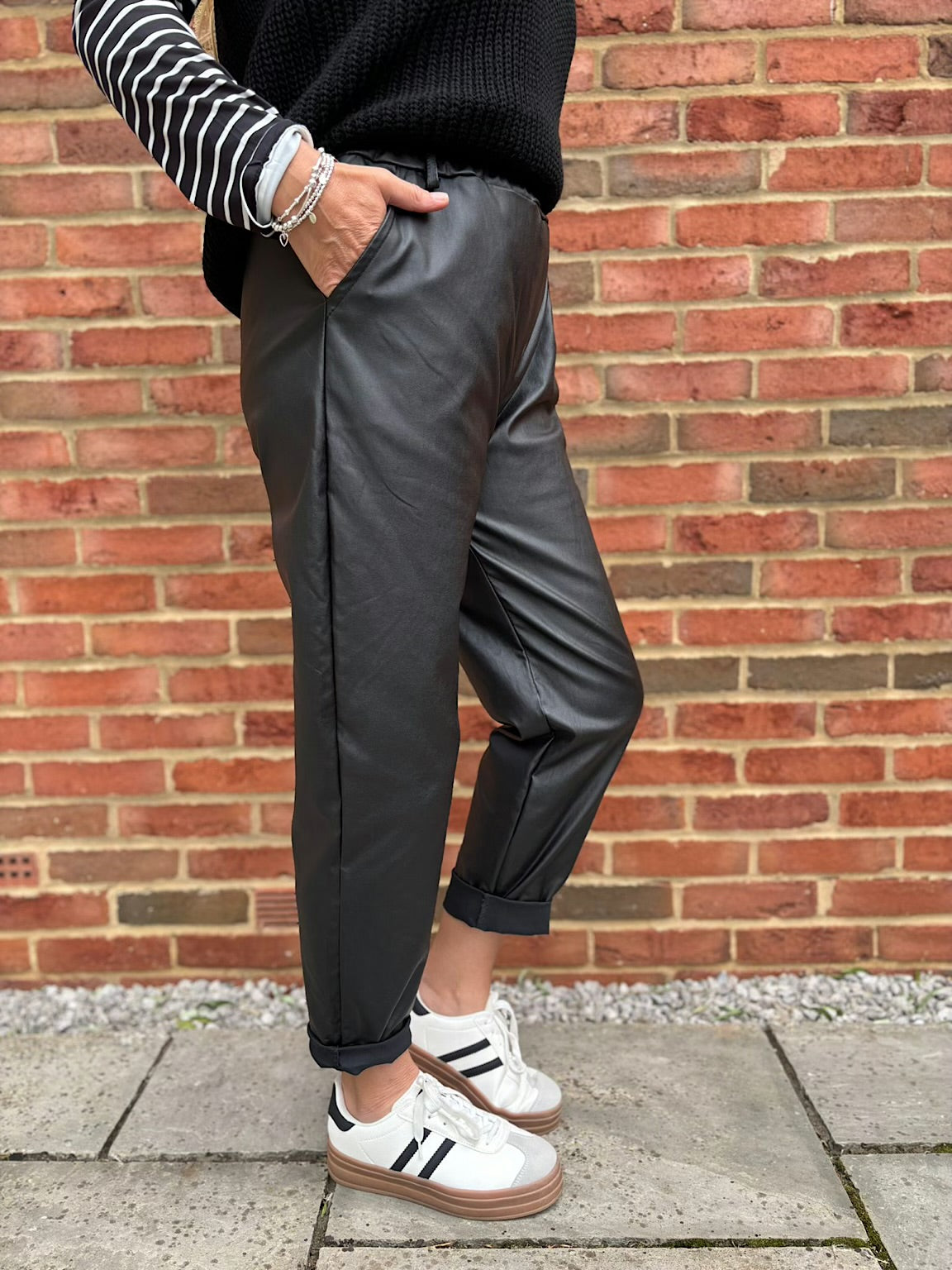 Crafted with a coated finish, these Coated Turn Up Trousers feature an elasticated waist with belt loops for a comfortable, adaptable fit. Their wide leg design and turn-up option allow you to customize your style effortlessly while enjoying all-day ease and confidence.