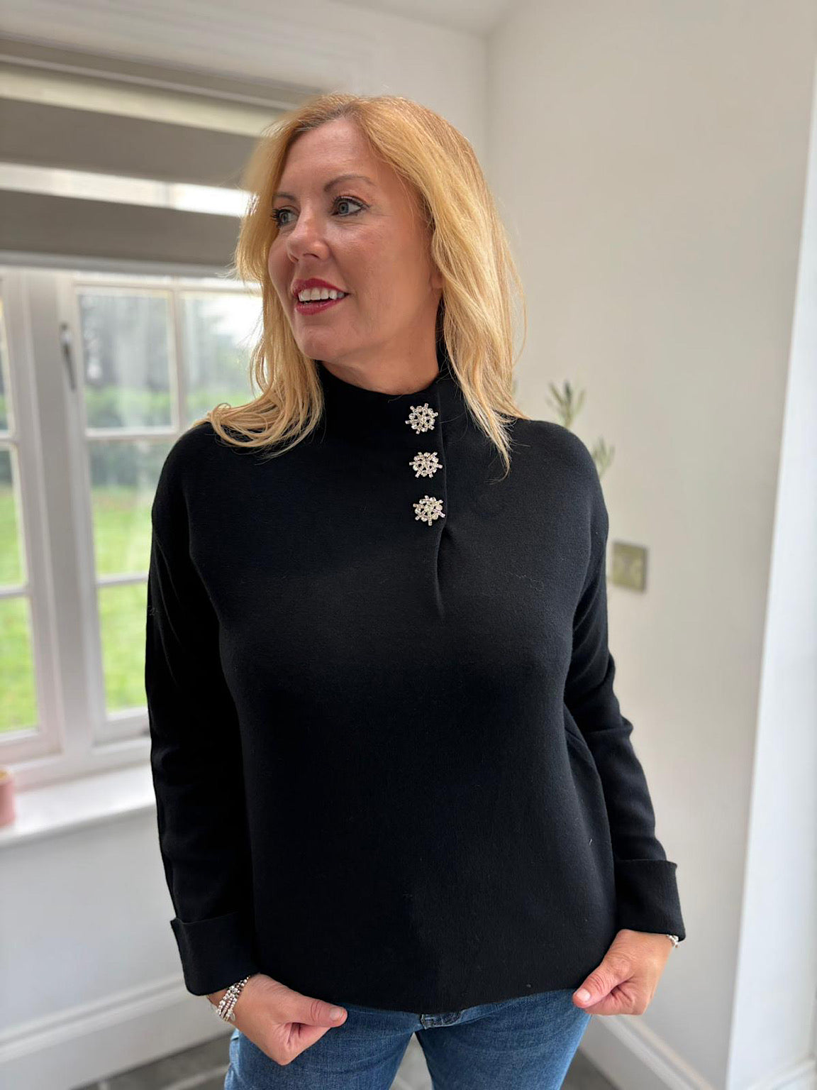 Diamante Button High Neck Frankie Elevate your wardrobe with this sophisticated piece featuring a luxurious high-quality fabric that feels as good as it looks. The standout high neck design showcases fixed diamantes along the neckline, adding a touch of glamour to your everyday style. Turned-up cuffs complete the polished look, making this versatile top perfect for both casual outings and special occasions. A timeless addition to any collection.