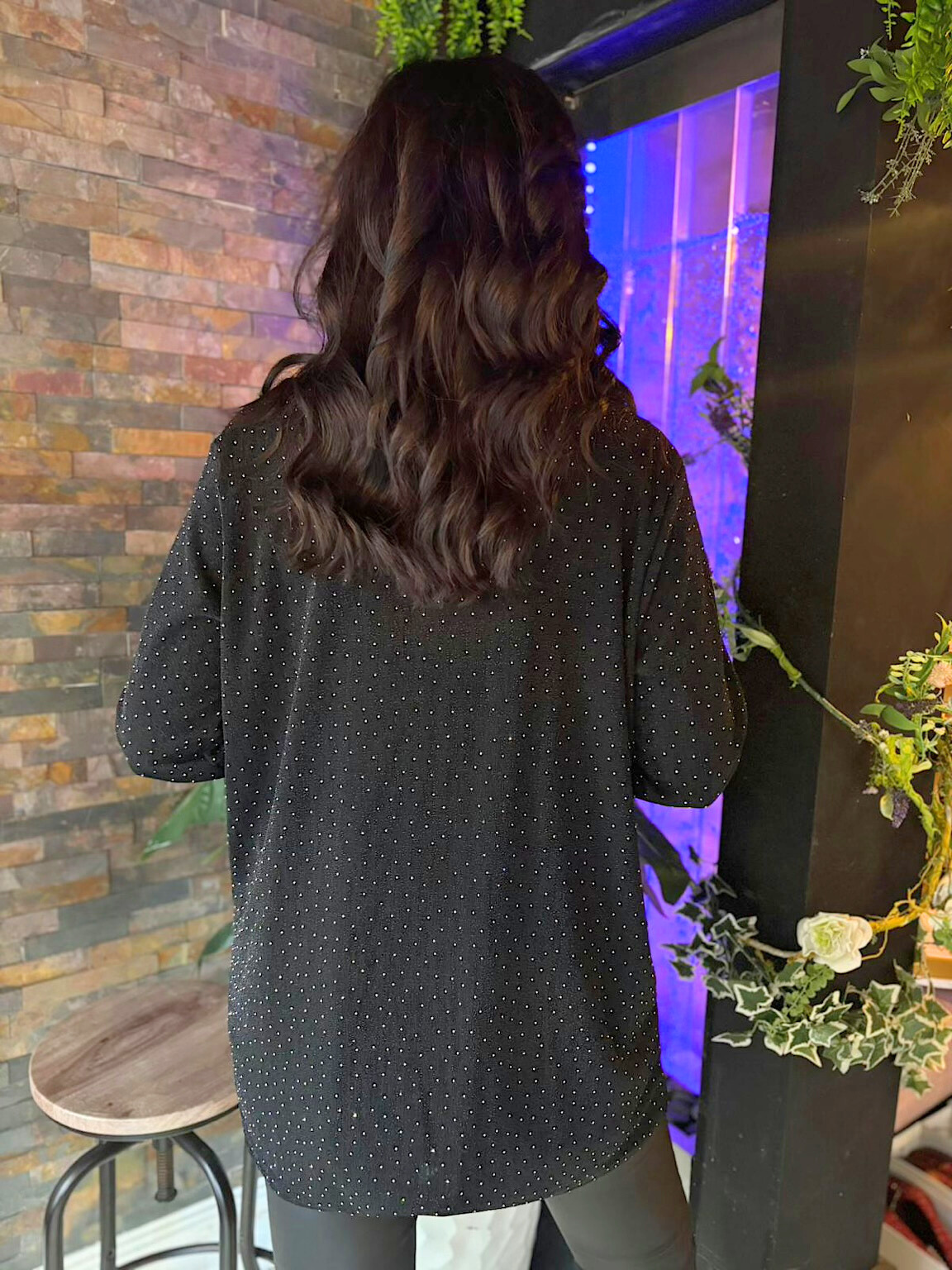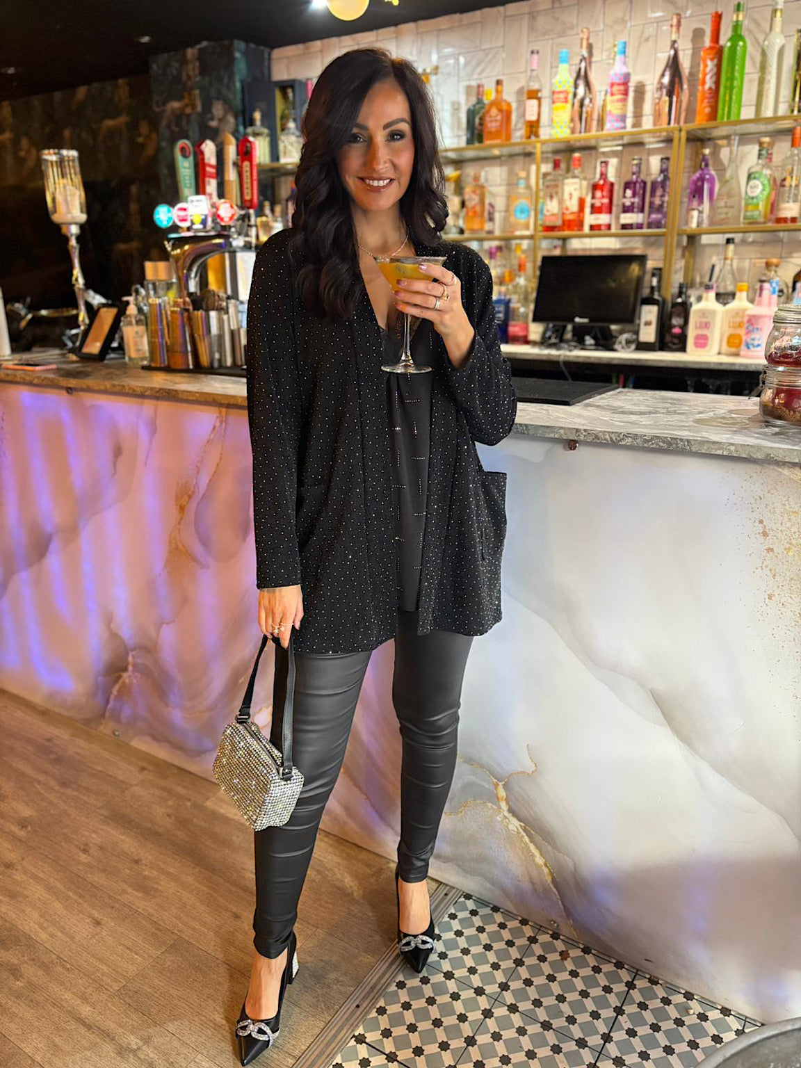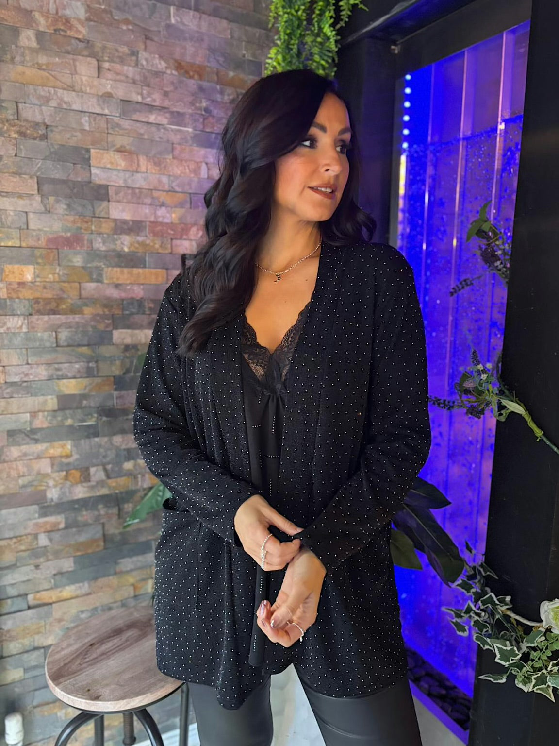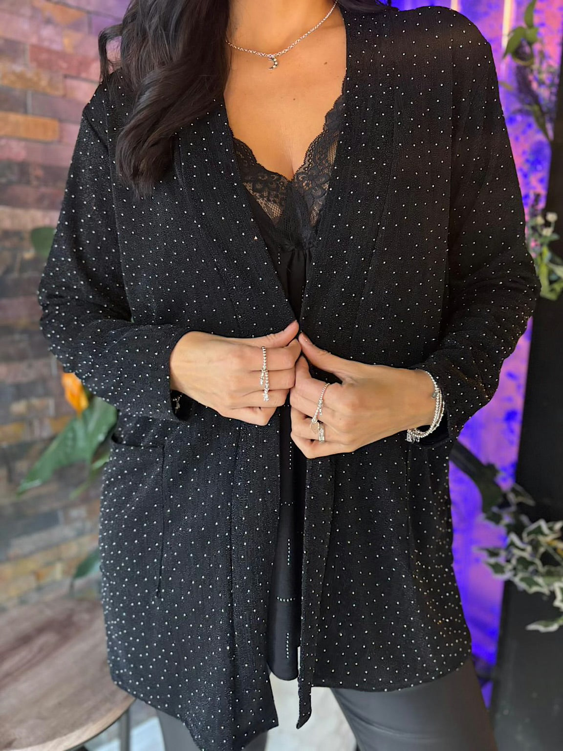 This lightweight Diamante Shimmer Jacket Hazel adds a touch of sparkle to any outfit while keeping you comfortable. Featuring practical front pockets, it combines style with convenience, perfect for layering on cooler days or evenings. Its subtle shimmer enhances your look effortlessly without feeling heavy.