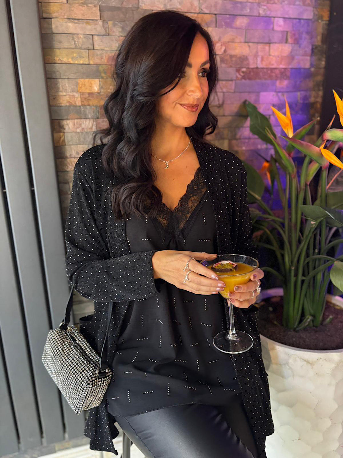 Styled with.....>Black Lace Trim Diamante Vest Amber/ Black Diamante Block Heel Shoes/ Black Rhinestone Clutch Bag/ Black Coated Trousers