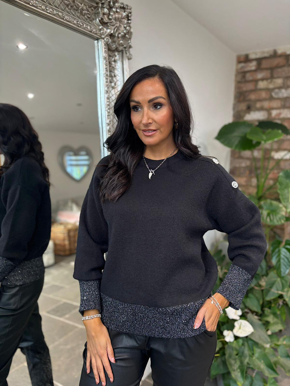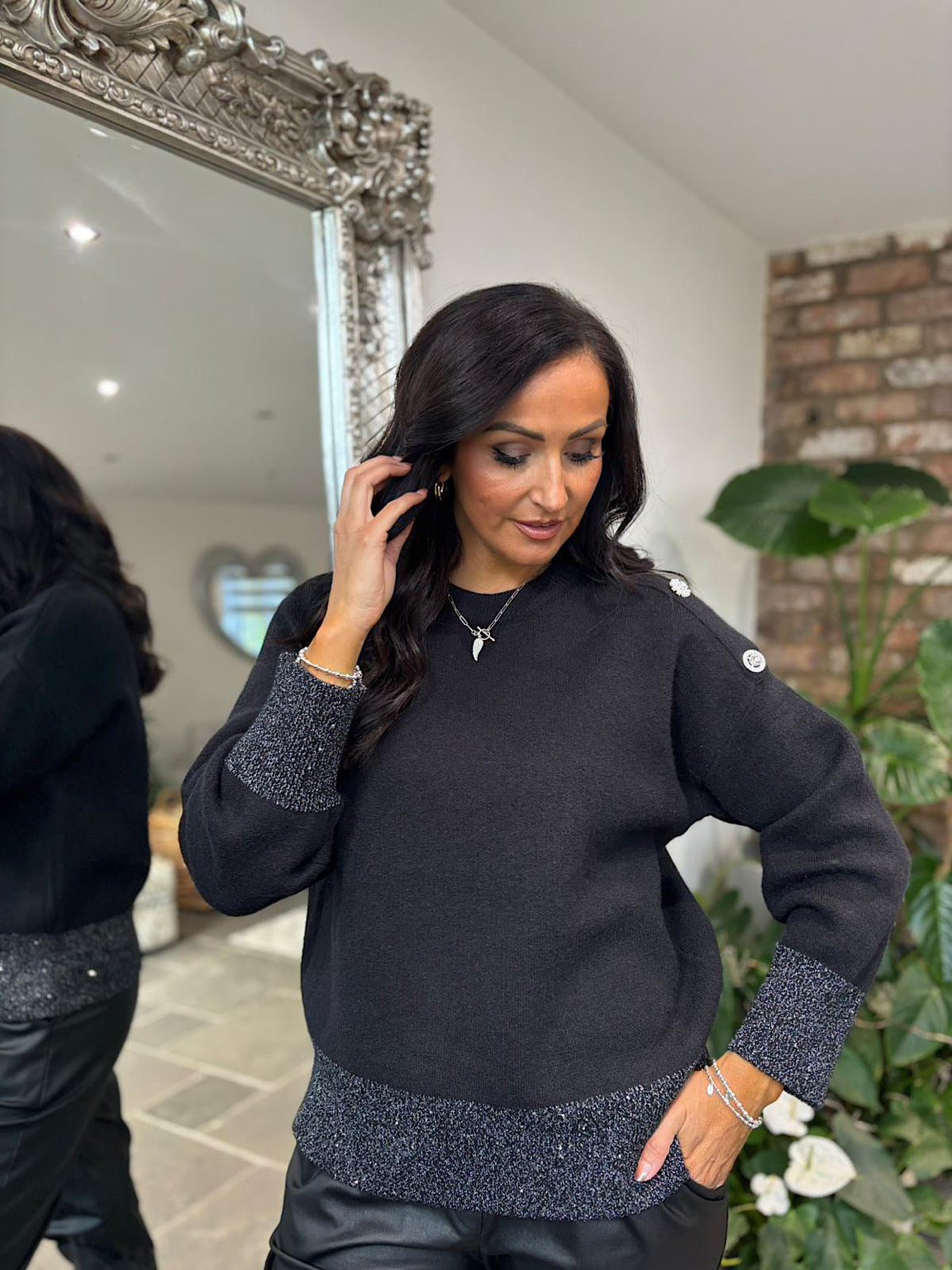 Elevate your everyday wardrobe with this stunning knit, crafted from premium materials for a luxurious feel. The Maddie features exquisite diamante button detailing along the shoulder, creating an eye-catching focal point that transforms a classic silhouette into something truly special. Delicate lurex threading runs through the hem, adorned with tiny sequins that catch the light beautifully. Perfect for adding a touch of sparkle to your day, whether you're dressing up or keeping it casual.