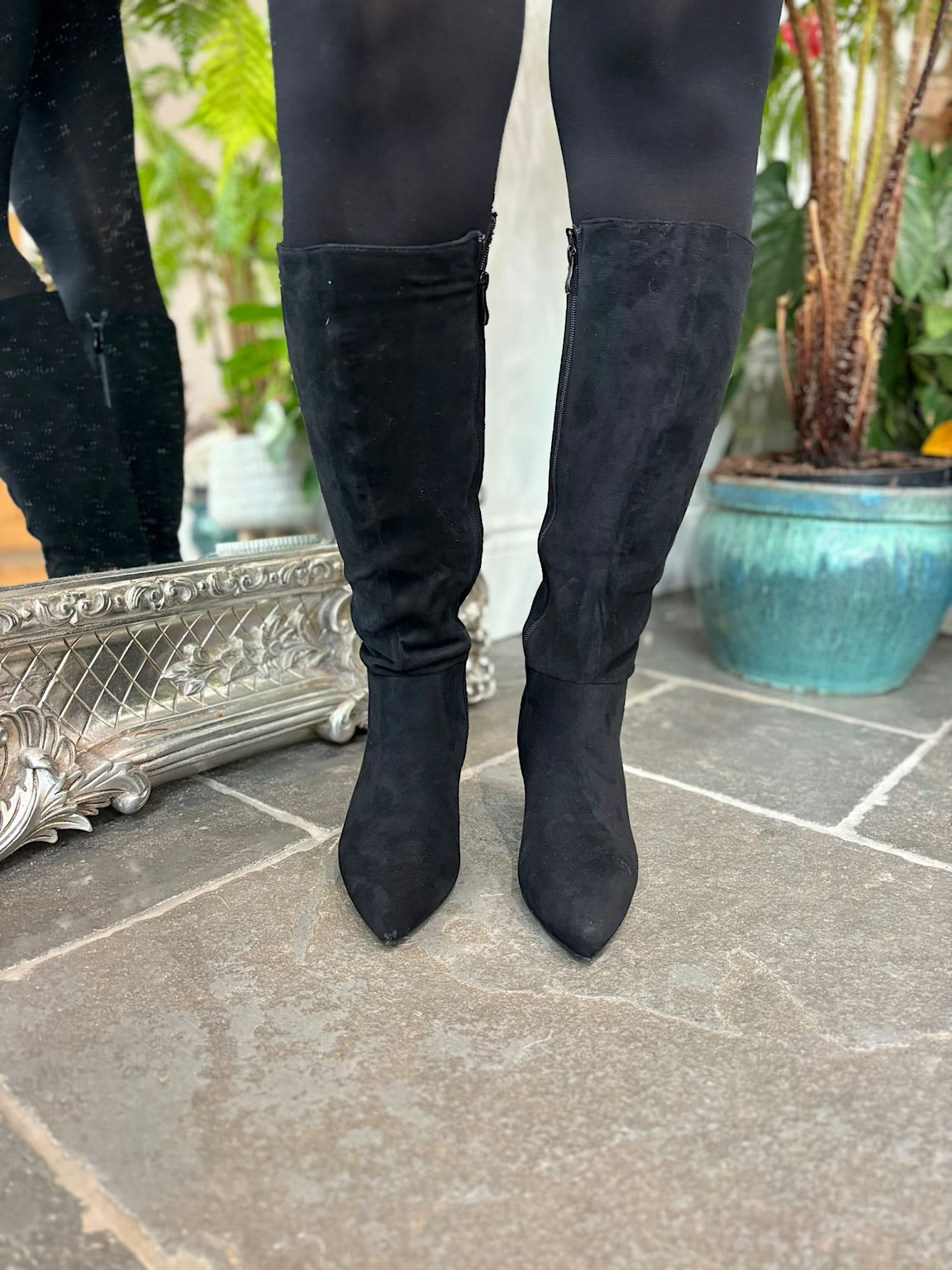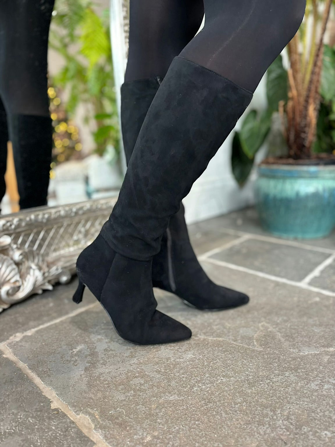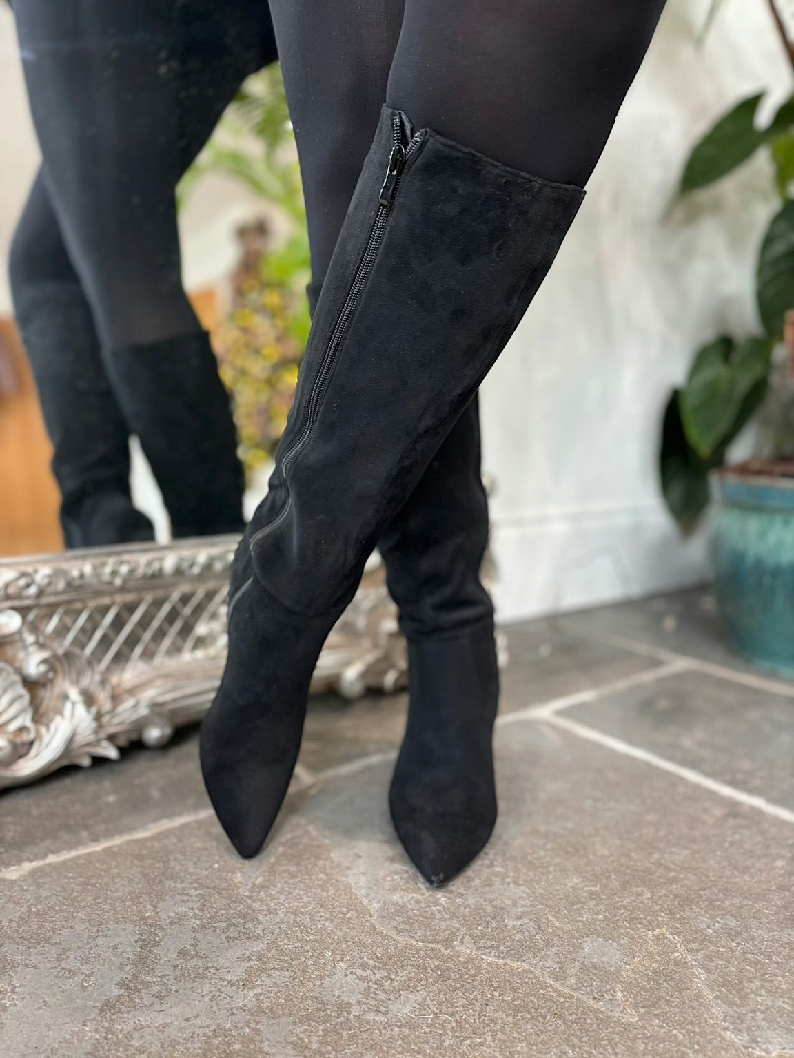 Black Faux Suede Pointed Knee High Boots