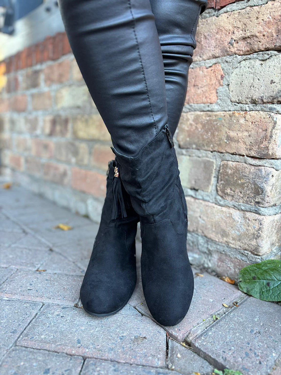 Elevate your footwear collection with these Faux Suede Slouch Boots. Featuring elegant tassel details and subtle gold accents on the heel, they combine stylish flair with comfortable slouch design. Perfect for adding a refined touch to any outfit while ensuring all-day wearability.