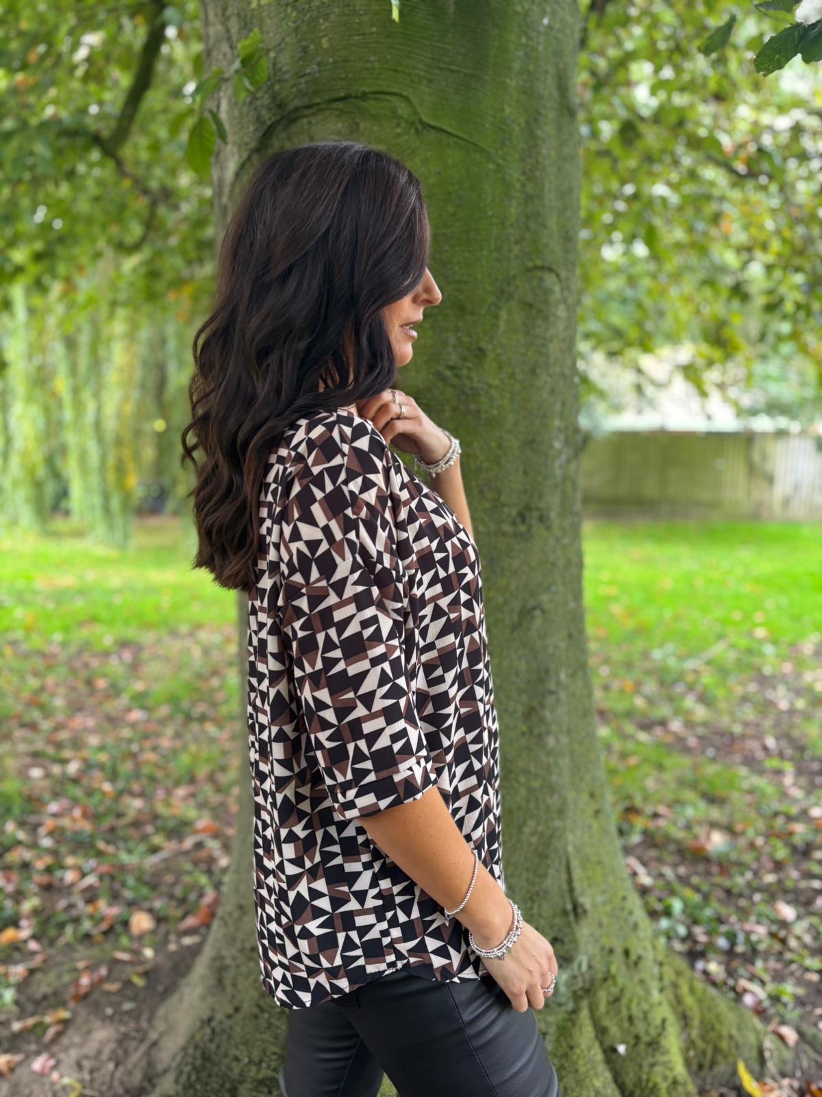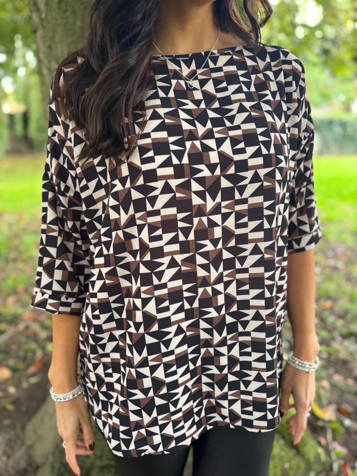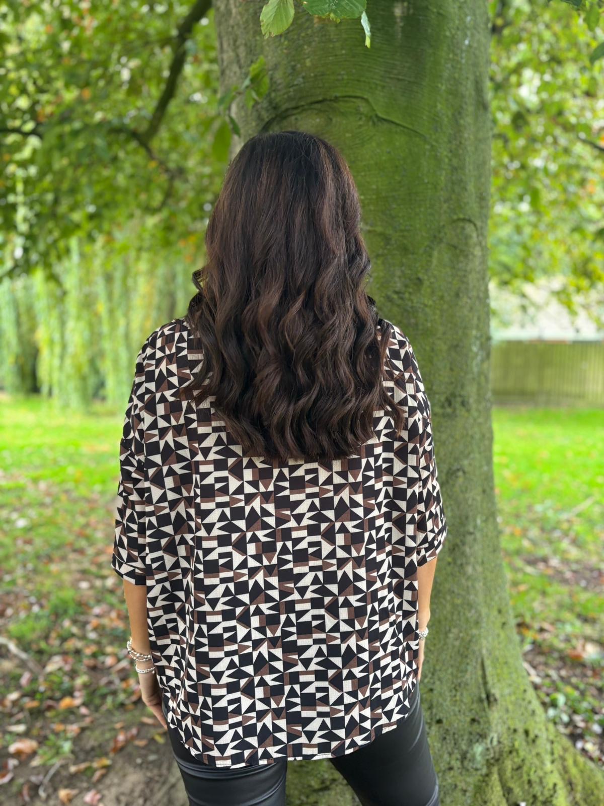 Elevate your wardrobe with the Geometric Print Top Ayla, featuring a refined geometric pattern that adds subtle sophistication to any outfit. Its short sleeves offer comfort and ease, making it perfect for both workdays and casual outings. The elegant design ensures a polished look with minimal effort.