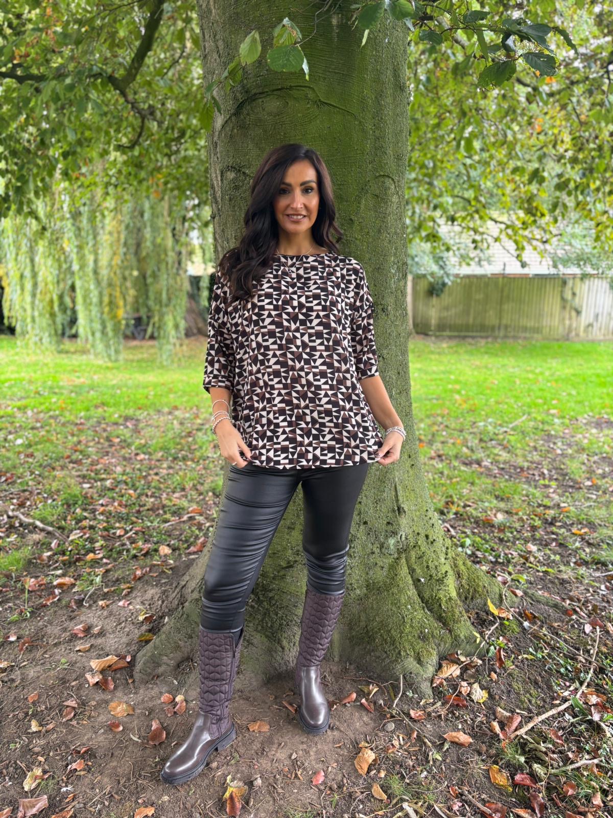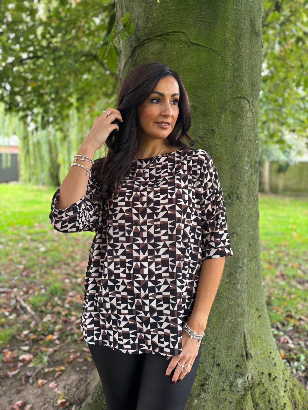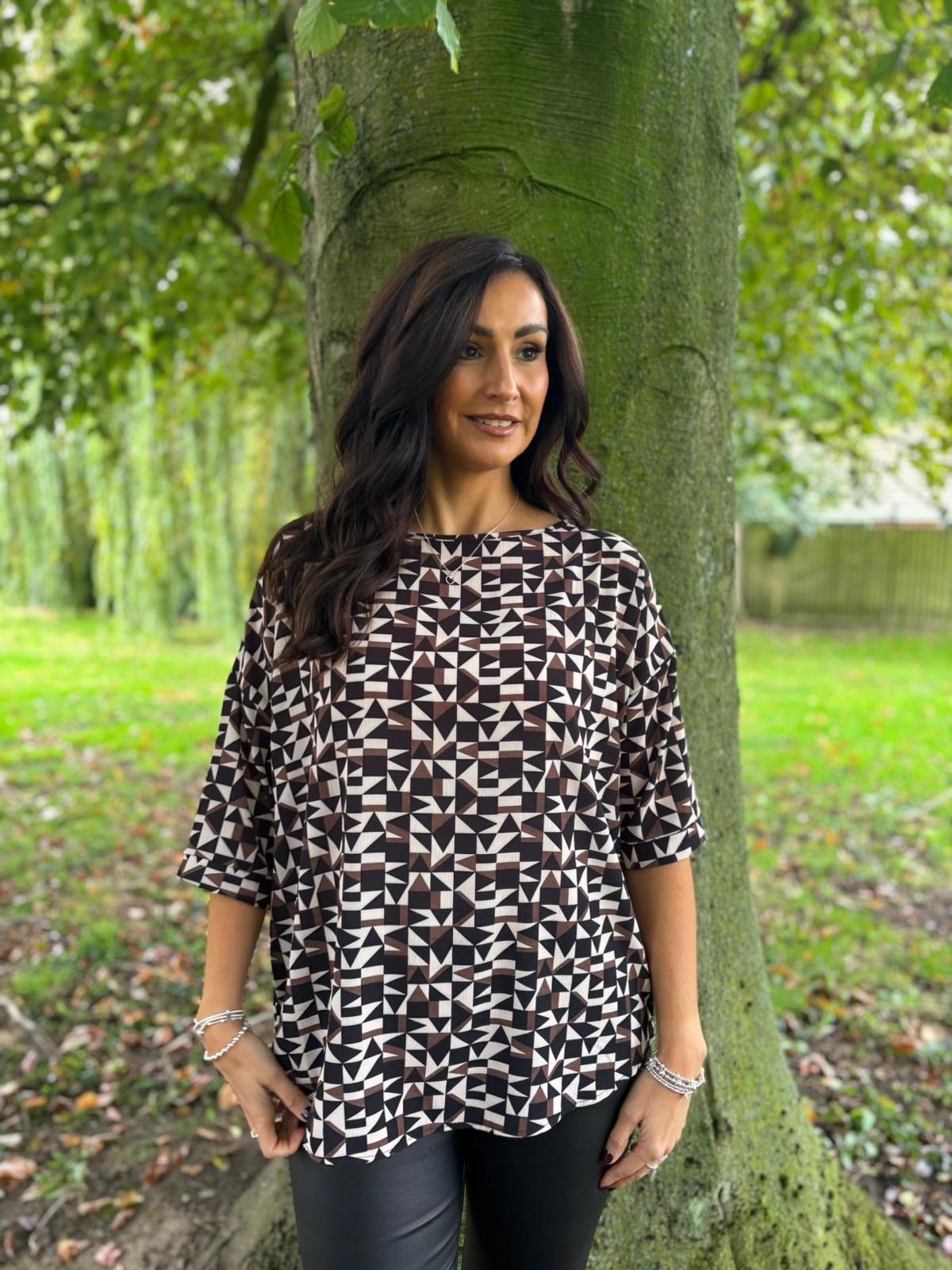 Elevate your wardrobe with the Geometric Print Top Ayla, featuring a refined geometric pattern that adds subtle sophistication to any outfit. Its short sleeves offer comfort and ease, making it perfect for both workdays and casual outings. The elegant design ensures a polished look with minimal effort.