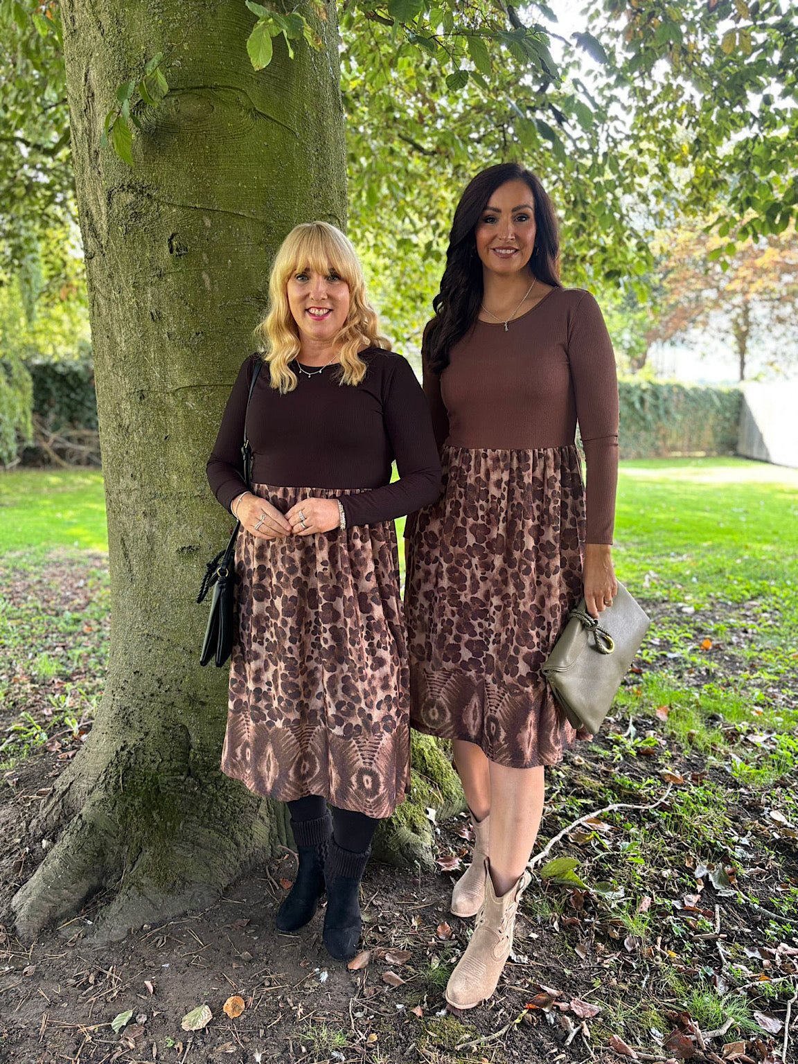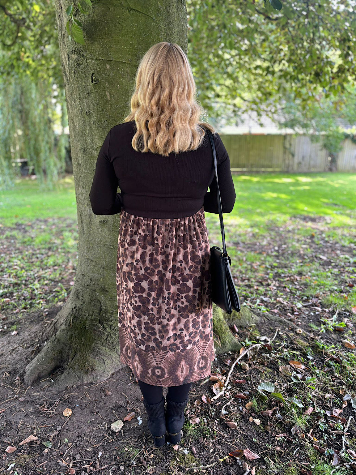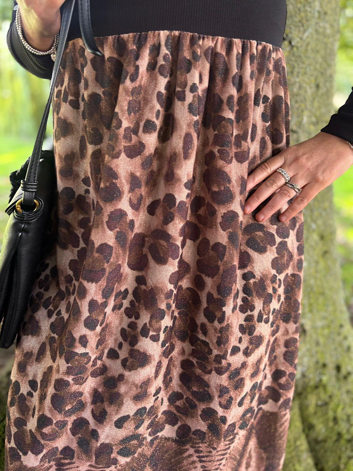 This dress features a ribbed upper half with long sleeves in a sleek block colour, seamlessly transitioning to a shimmering half leopard print design. The subtle shimmer on the leopard pattern adds a sophisticated edge, making it perfect for stylish occasions where understated glamour is key.