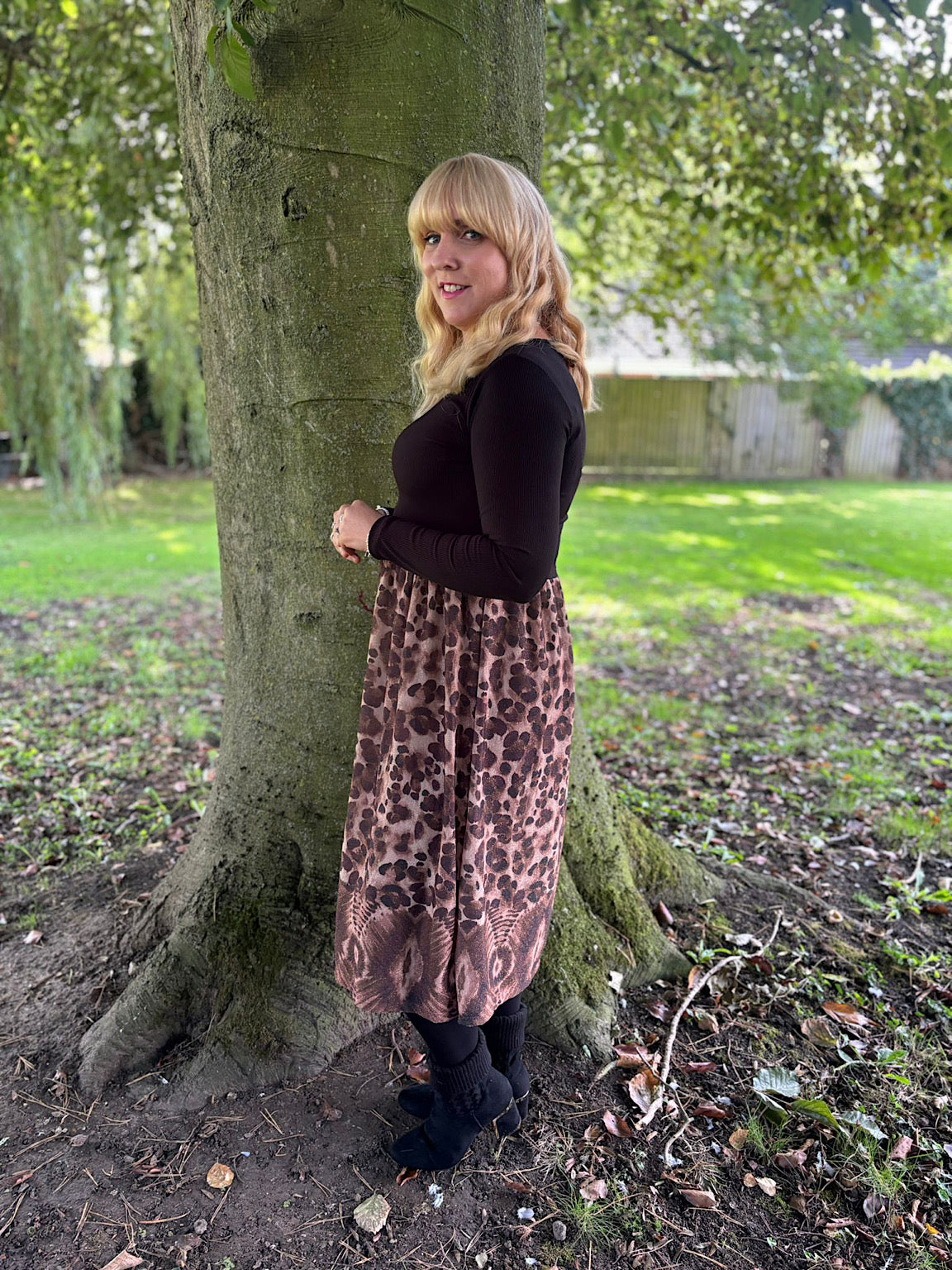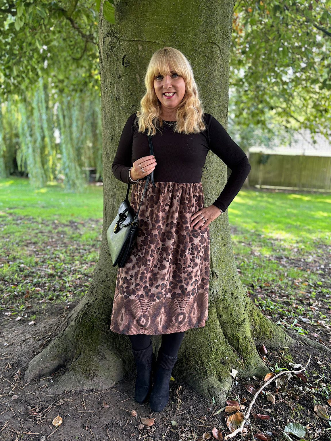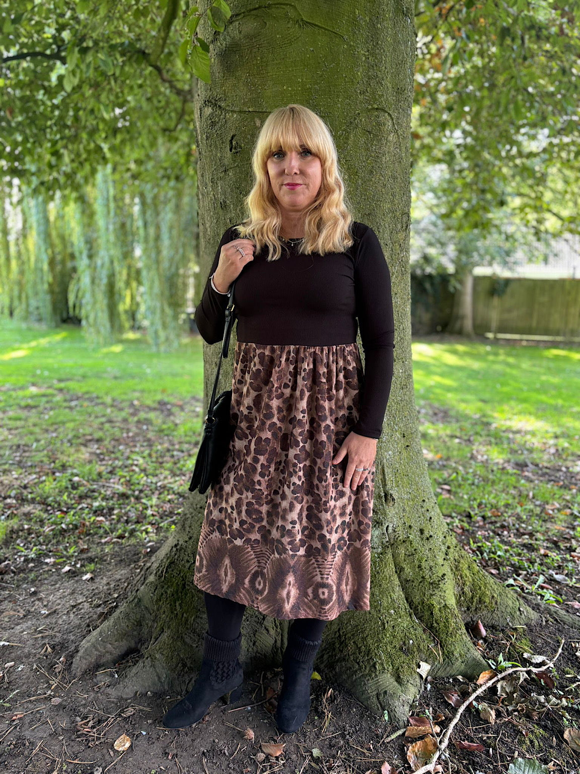 This dress features a ribbed upper half with long sleeves in a sleek block colour, seamlessly transitioning to a shimmering half leopard print design. The subtle shimmer on the leopard pattern adds a sophisticated edge, making it perfect for stylish occasions where understated glamour is key.