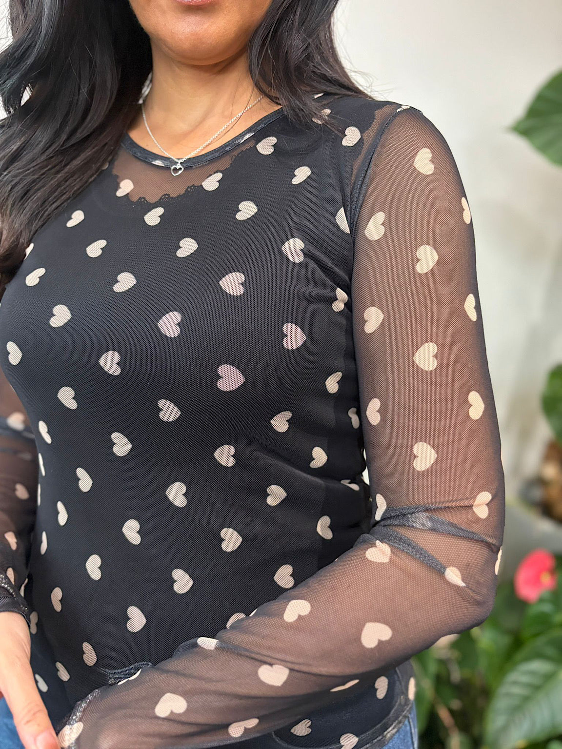 Embrace effortless style with this elegant mesh top, crafted from lightweight mesh fabric adorned with a charming printed heart design. The breathable mesh construction keeps you comfortable throughout the day, while the romantic heart pattern adds a touch of personality to your look. Layer it over your favourite basics for a contemporary, fashion-forward appearance that celebrates your individual style.