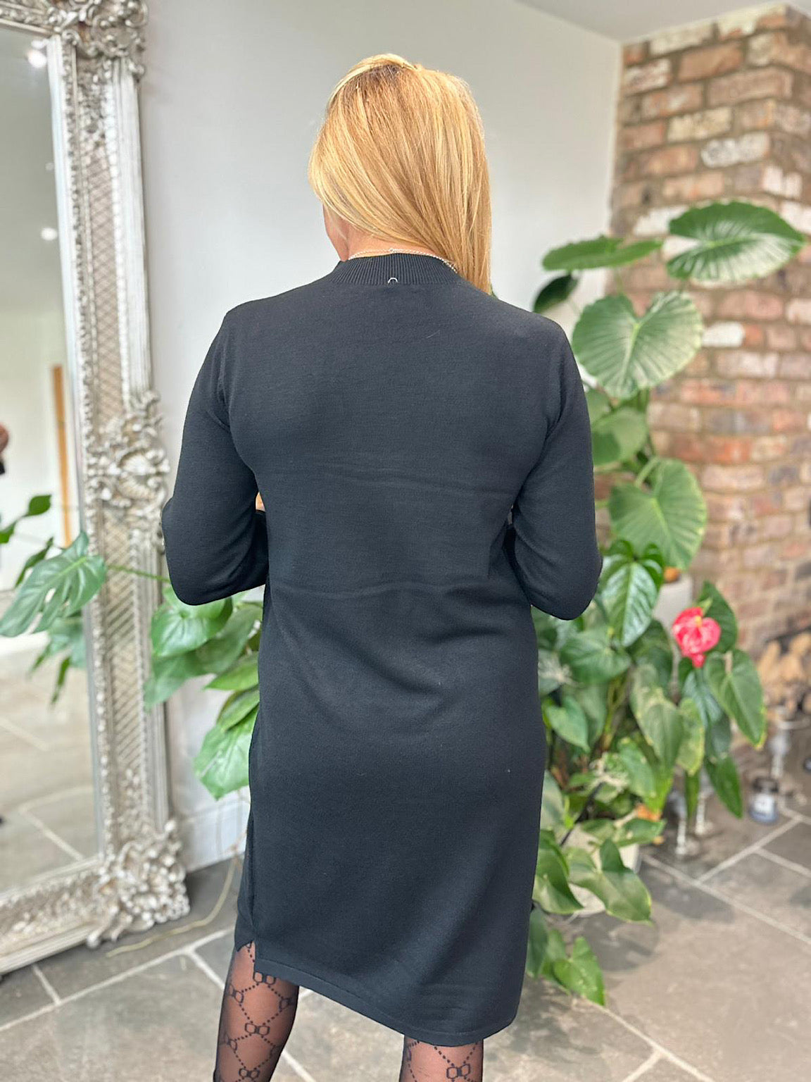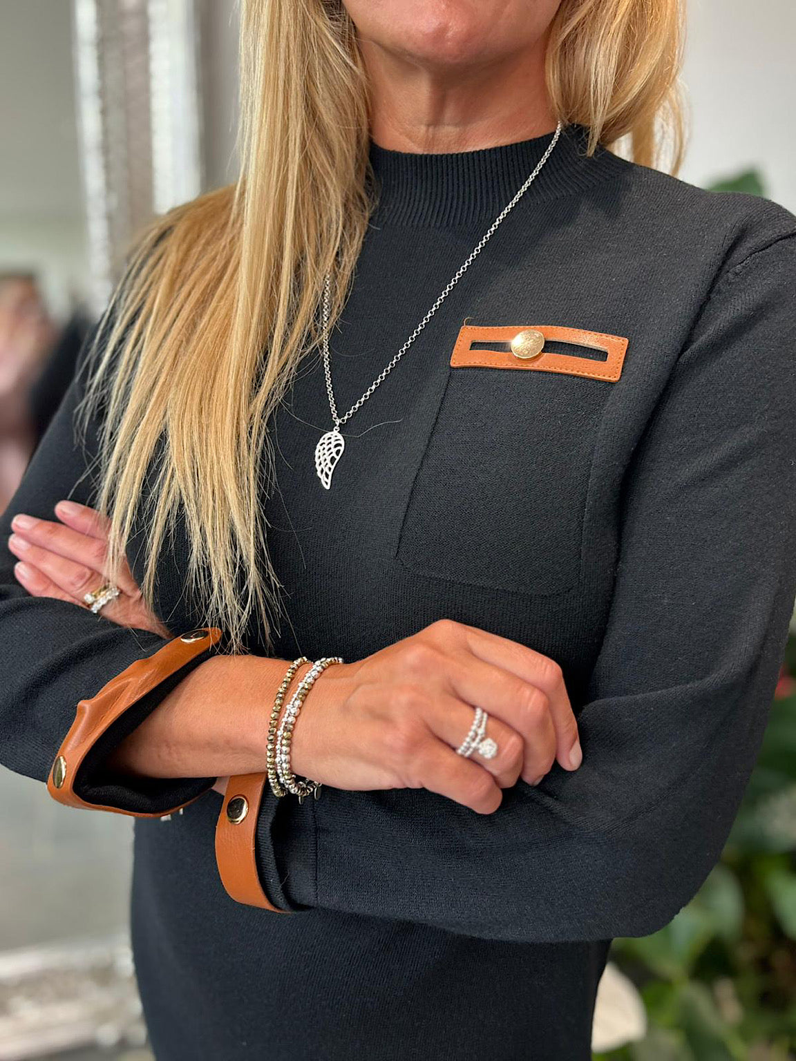 Elevate your wardrobe with this soft knitted crew neck dress, featuring elegant tan faux leather accents on the front and cuffs. Its refined design blends comfort and style seamlessly, making it ideal for sophisticated occasions or polished everyday wear.