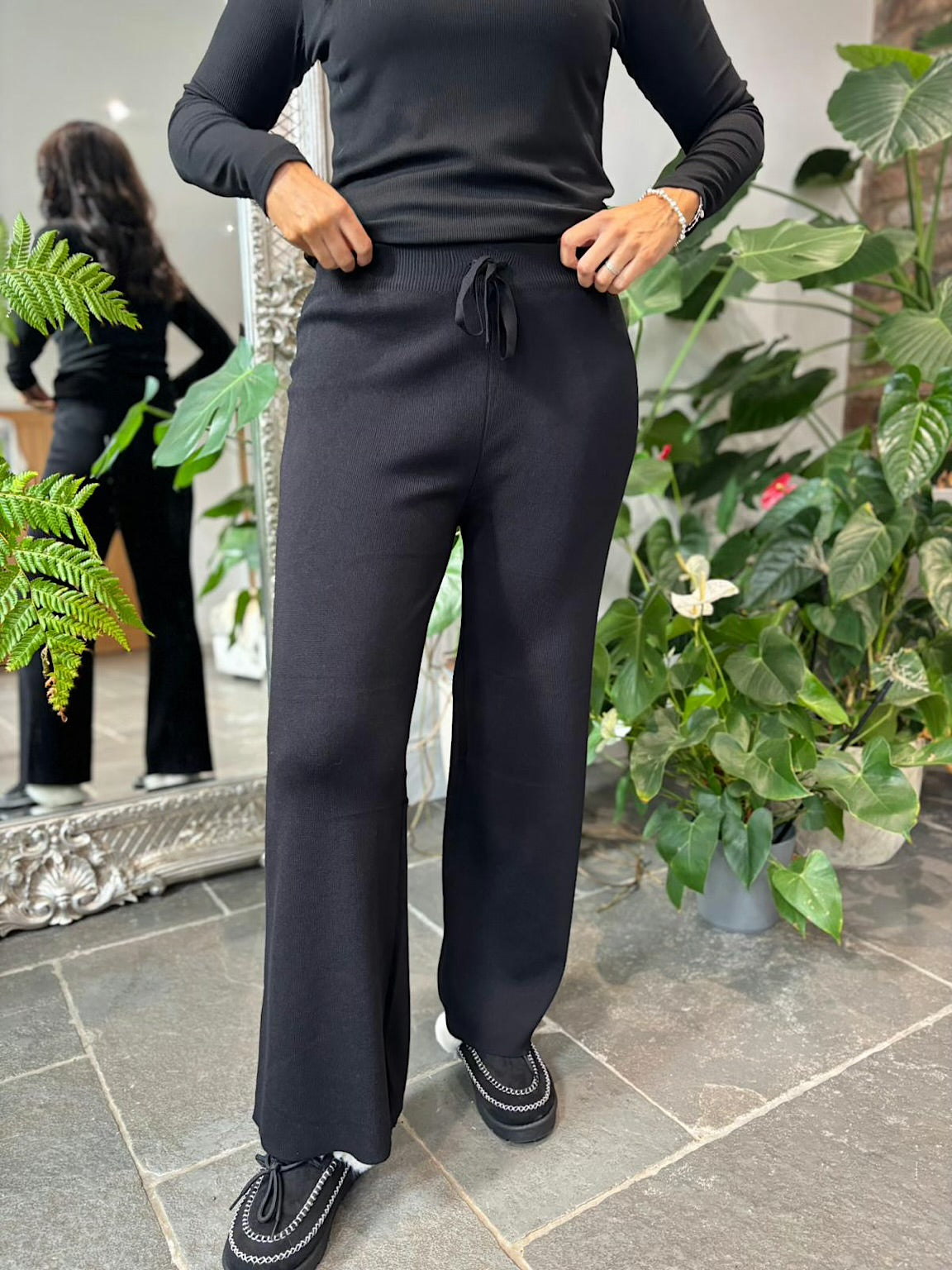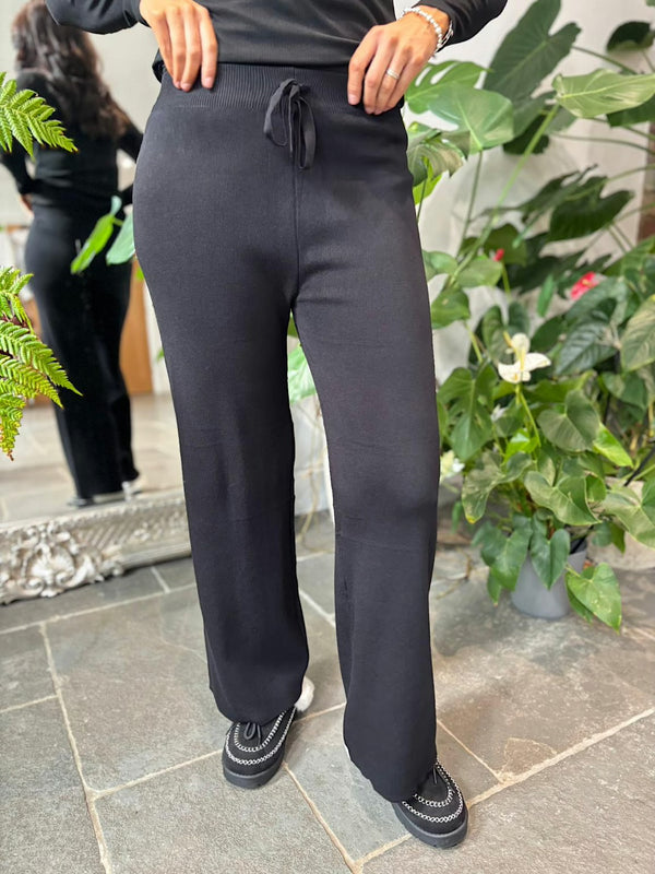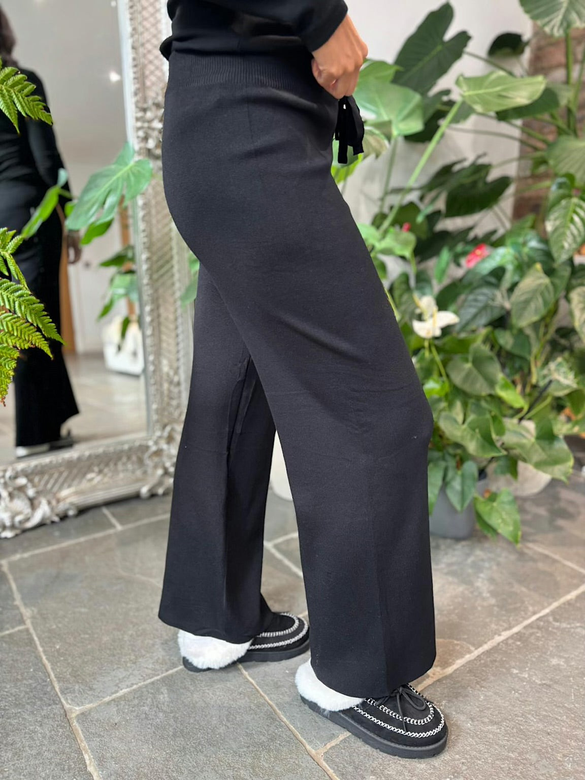 Elevate your wardrobe with the Knitted Trousers Chloe, designed for effortless sophistication. These wide-leg trousers feature a soft knitted fabric, an elasticated waist for comfortable wear, and a decorative tie front that adds a refined finish.
