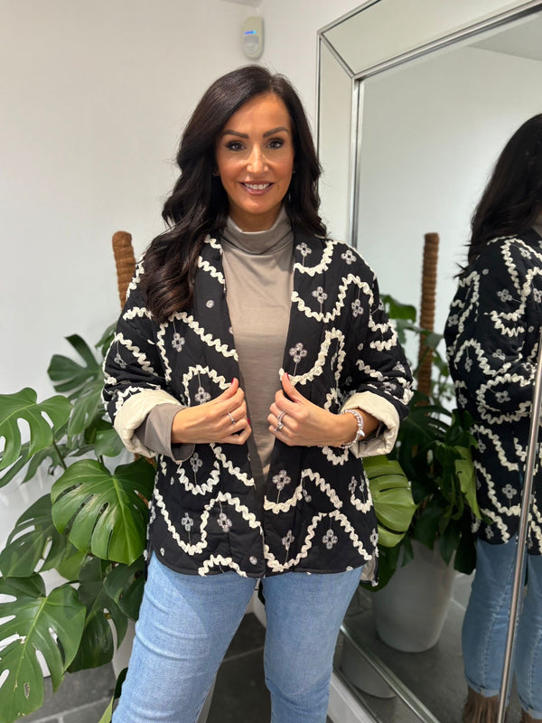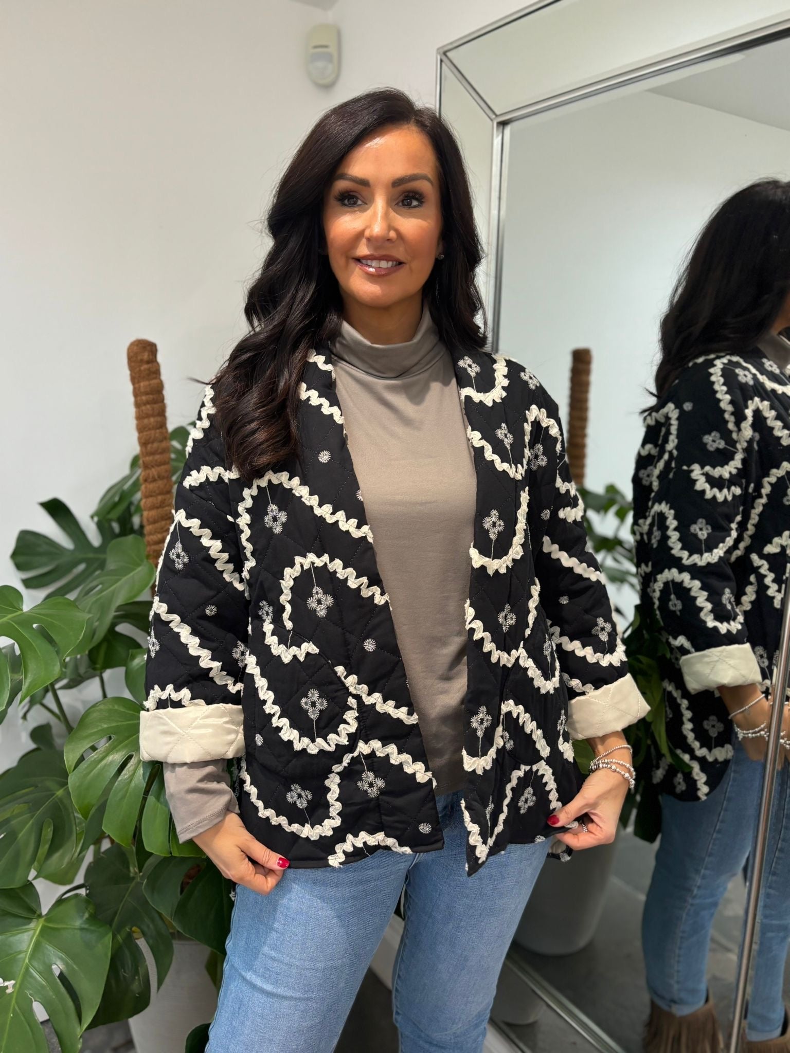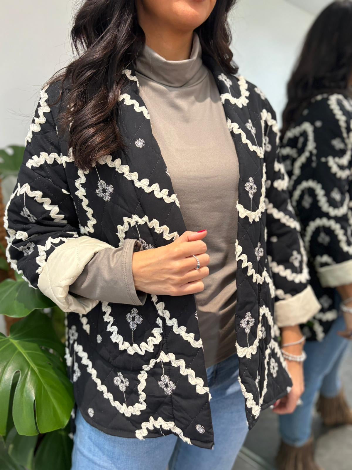 Elevate your winter wardrobe with this stunning black quilted jacket, where timeless elegance meets contemporary style. The luxurious quilted design provides warmth and structure, while intricate applique detailing adds a touch of sophistication to every wear. Fully lined for comfort and durability, this jacket transitions effortlessly from casual outings to more refined occasions. Perfect for those who appreciate quality craftsmanship and refined aesthetics, it's a versatile piece that deserves a place in your everyday collection.
