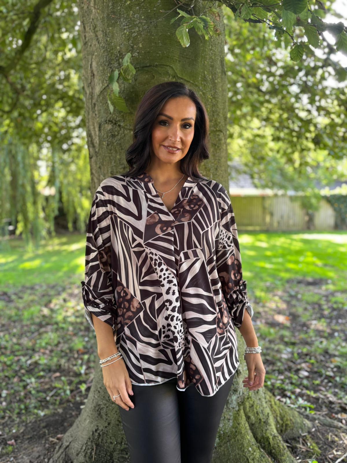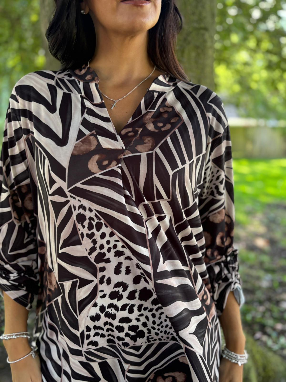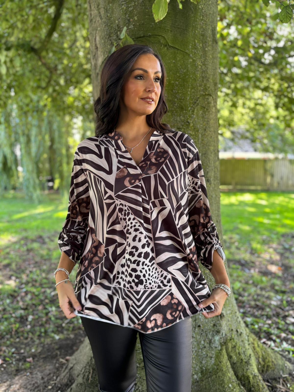 Crafted from soft fabric, the Multi Print Blouse Isabella features a flattering length and a refined V-neckline. Its long sleeves include a subtle button detail, allowing them to be effortlessly adjusted to a chic 3/4 length. Perfect for layering or wearing alone, this blouse offers versatile elegance for any sophisticated wardrobe.
