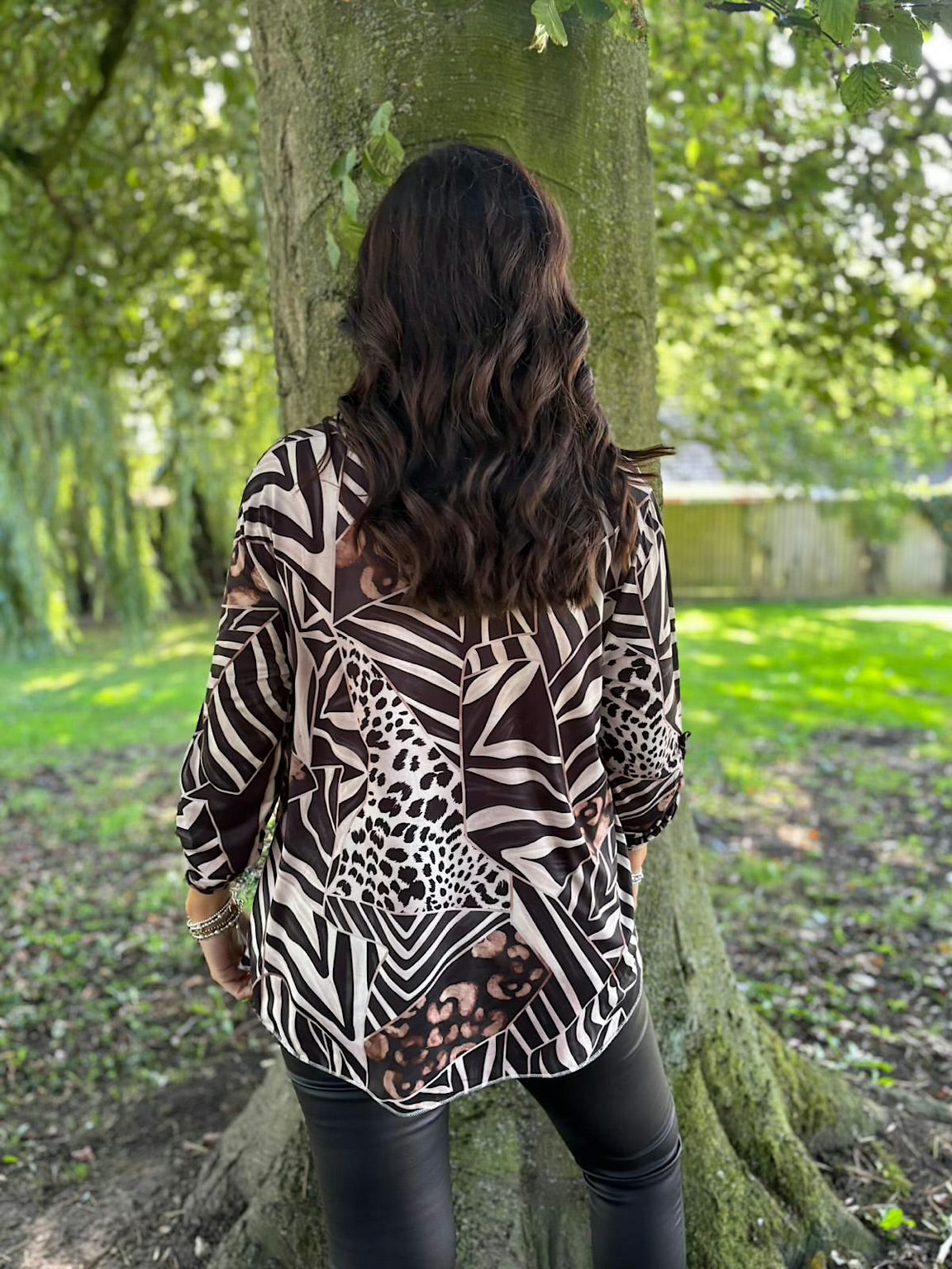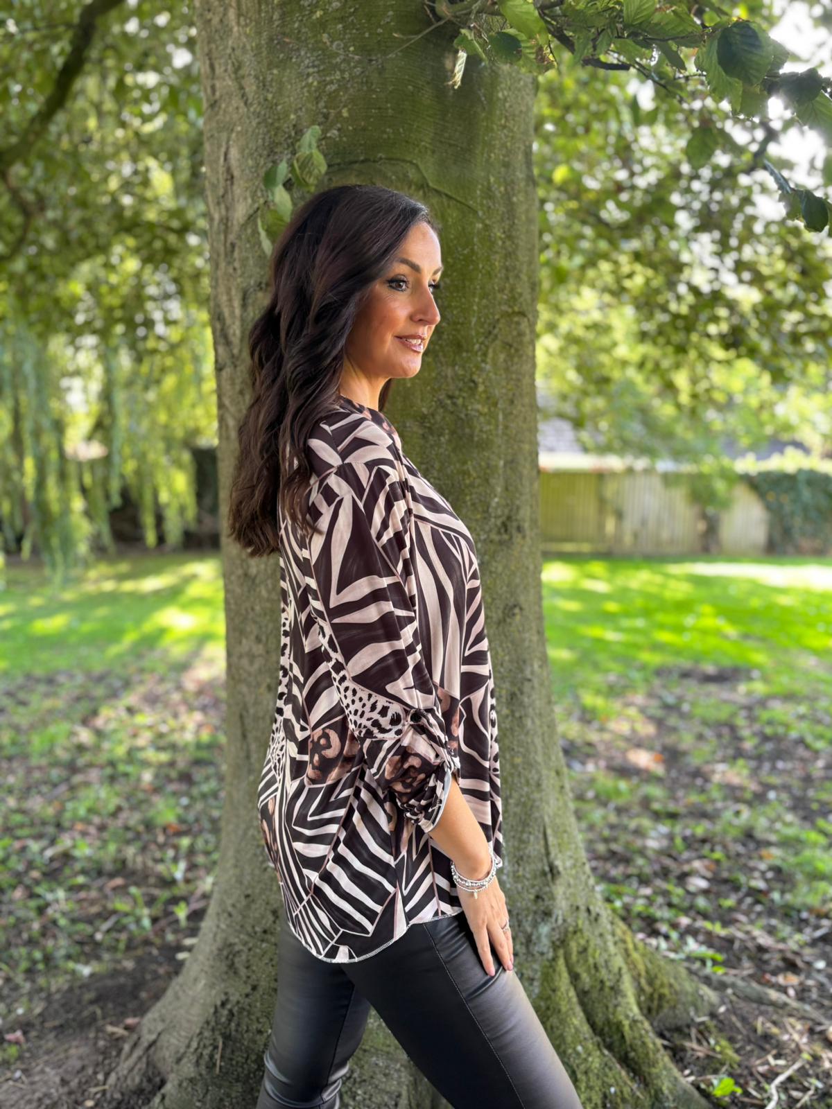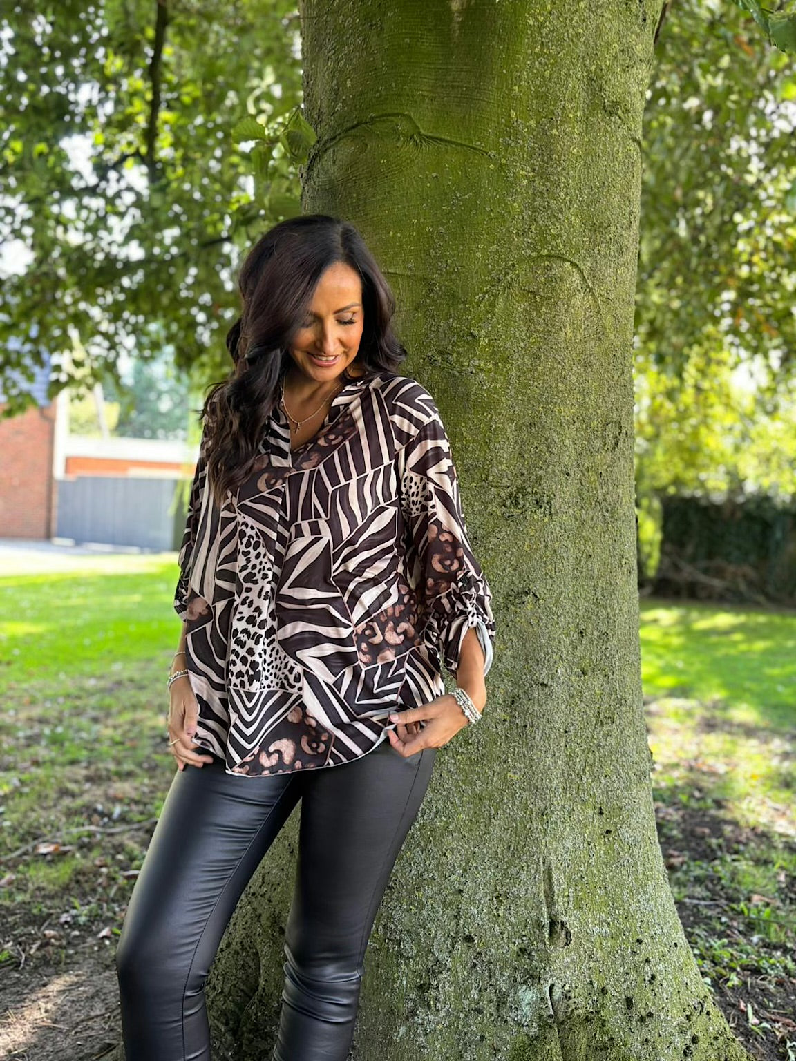 Crafted from soft fabric, the Multi Print Blouse Isabella features a flattering length and a refined V-neckline. Its long sleeves include a subtle button detail, allowing them to be effortlessly adjusted to a chic 3/4 length. Perfect for layering or wearing alone, this blouse offers versatile elegance for any sophisticated wardrobe.
