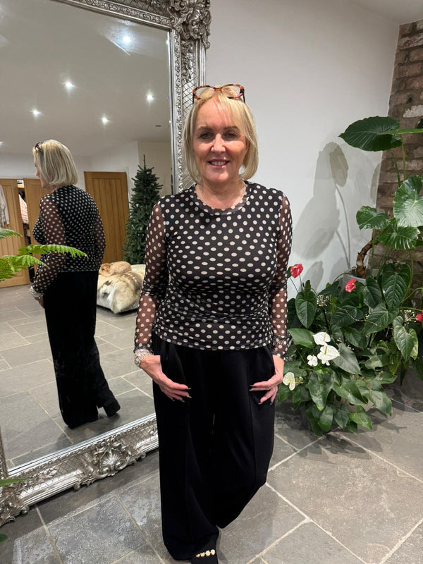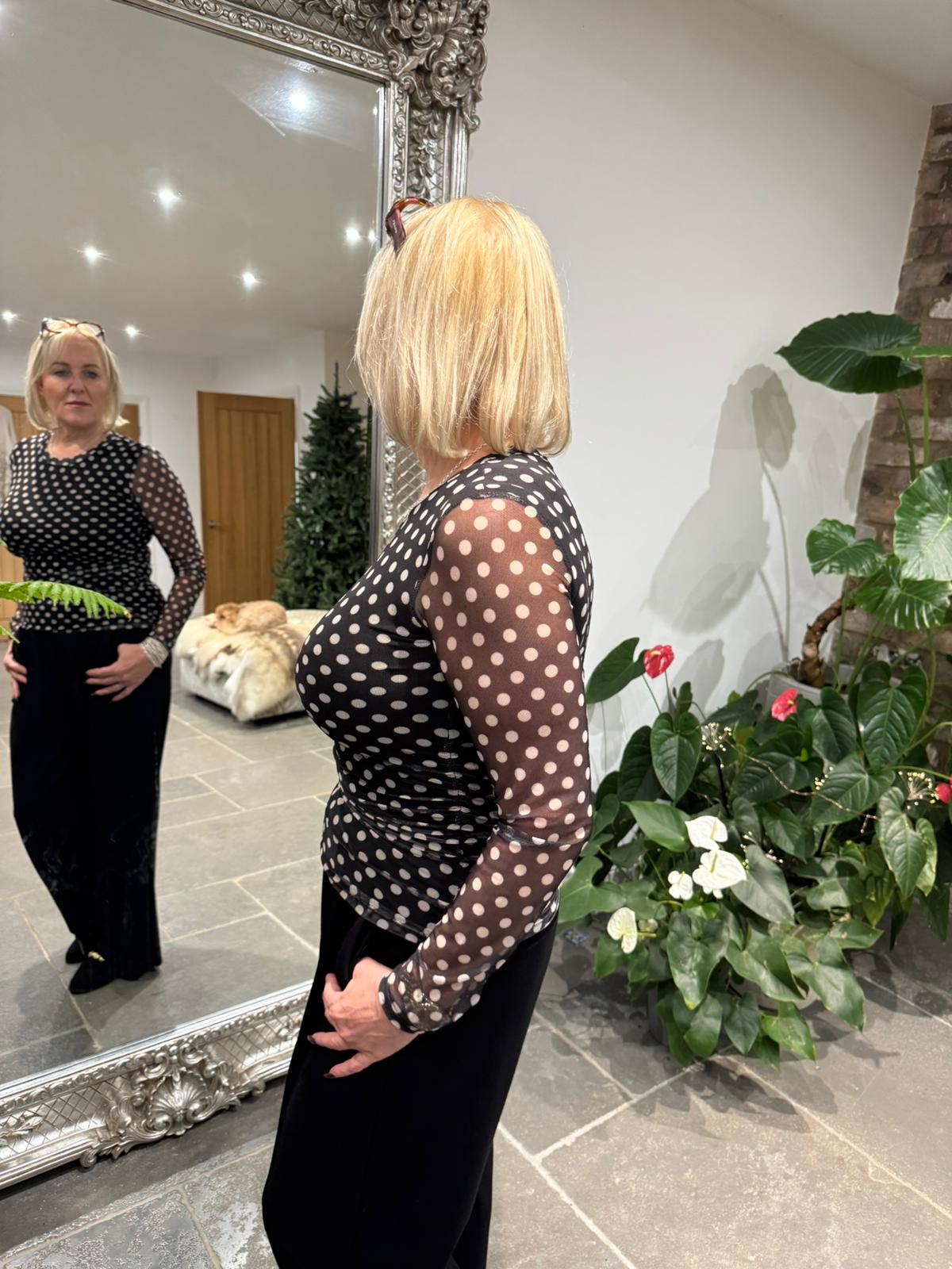 Discover the Mesh Top Sofia—a sophisticated take on our beloved Sofia silhouette. This stunning mesh top showcases polka dot print that adds instant character to any outfit, while the thoughtful lining underneath provides the comfort and coverage you deserve. Whether you're dressing up for an evening out or elevating your everyday look, this piece offers the perfect balance of style and wearability. A versatile addition that celebrates your confidence.