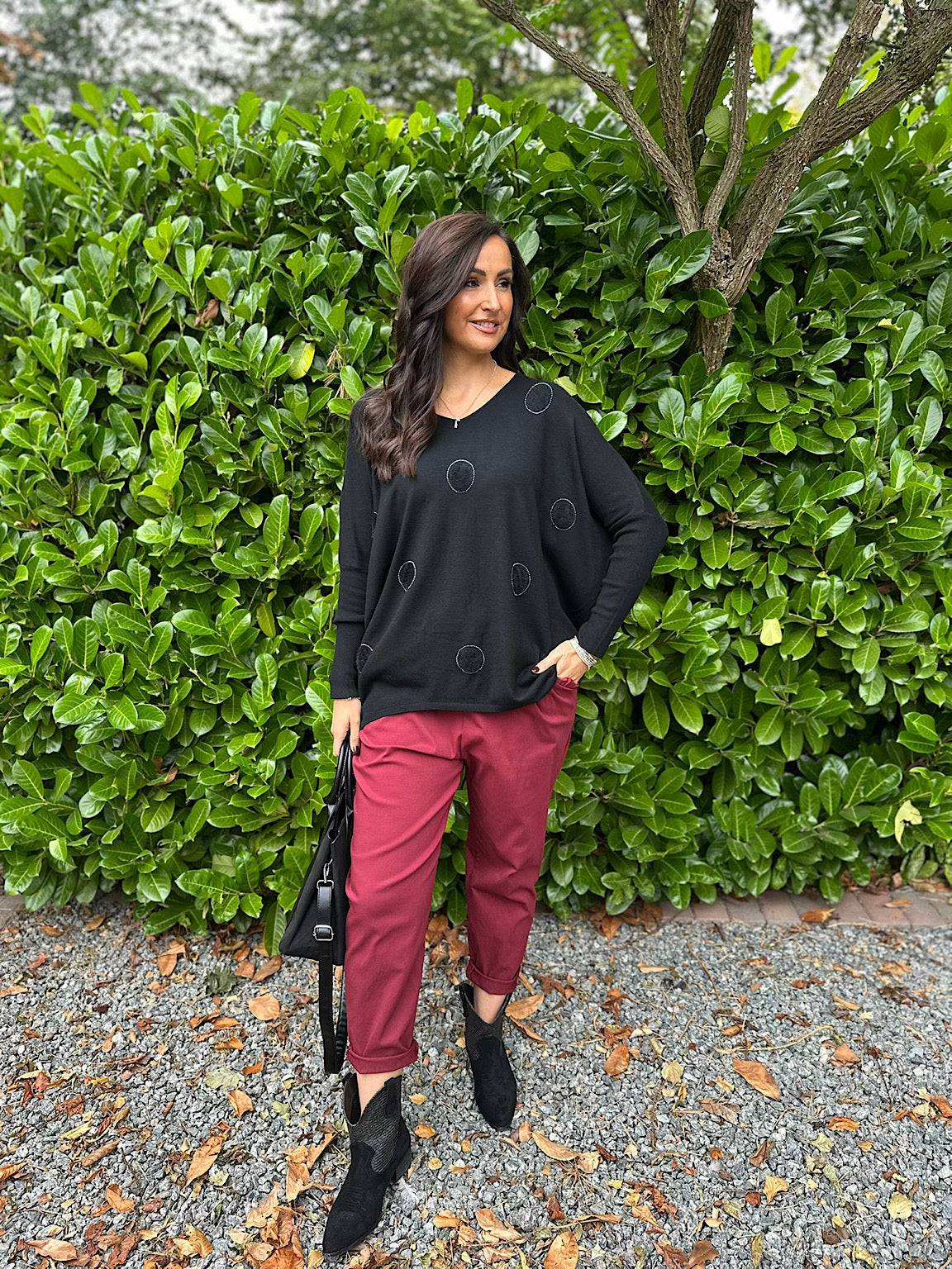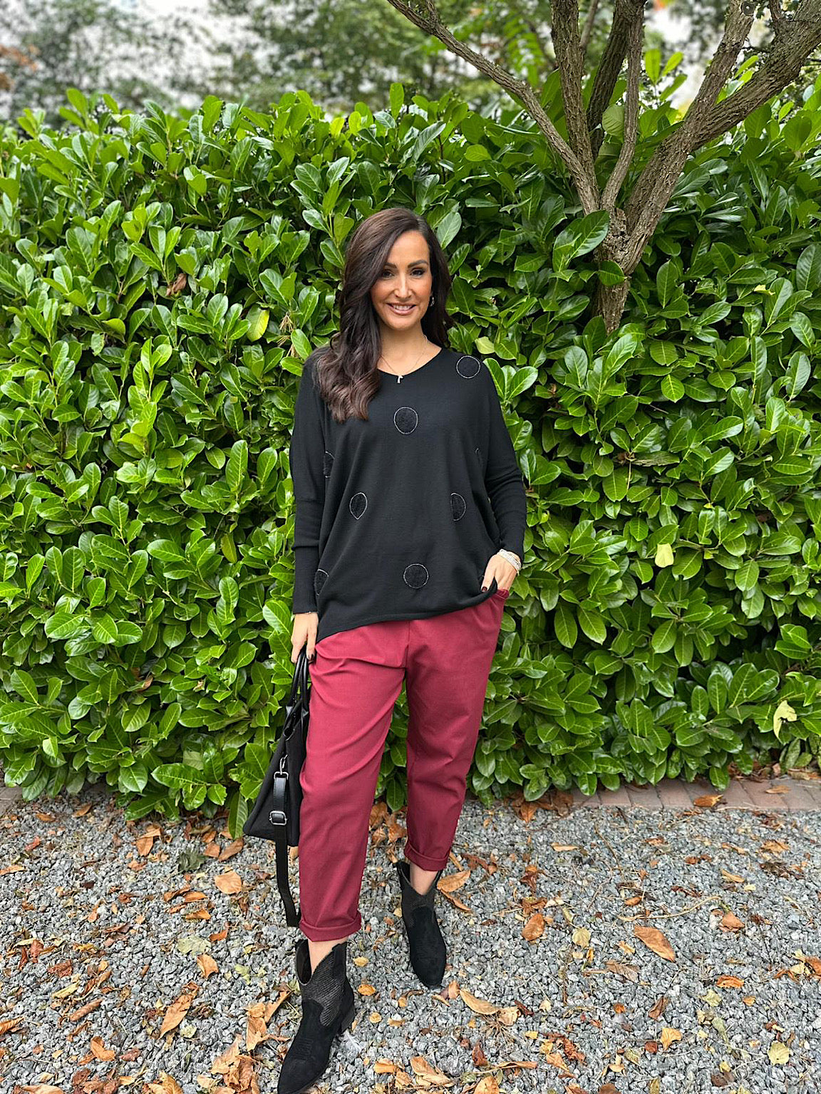 Styled with.....> Black Multi Fabric Handbag/ Black Weaved Panel Western Boots/ Wine Frill Pocket Trousers Sasha