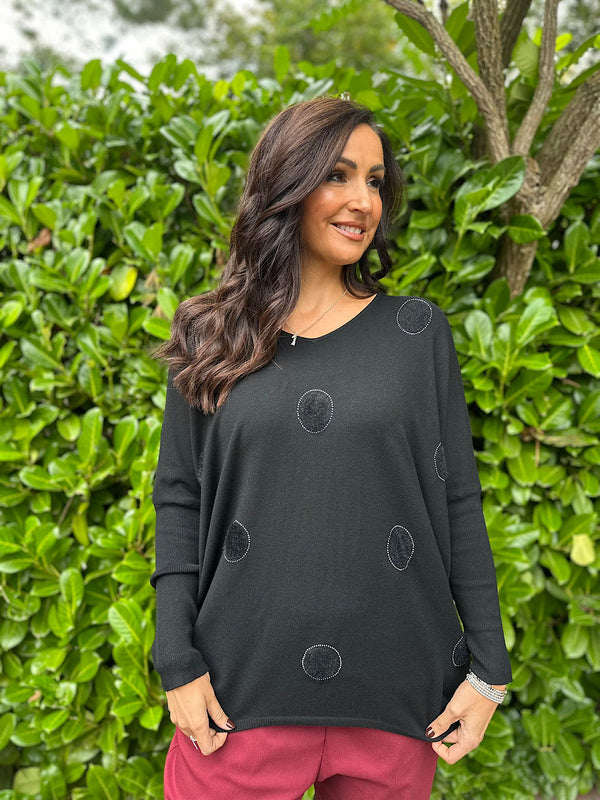This Polka Dot Tube Sleeve Knit Katy combines soft knit comfort with elegant design. Featuring tube sleeves and a striking faux fur circle embellished with sparkling diamantes, it offers a refined look perfect for adding a touch of sophistication to your winter wardrobe.