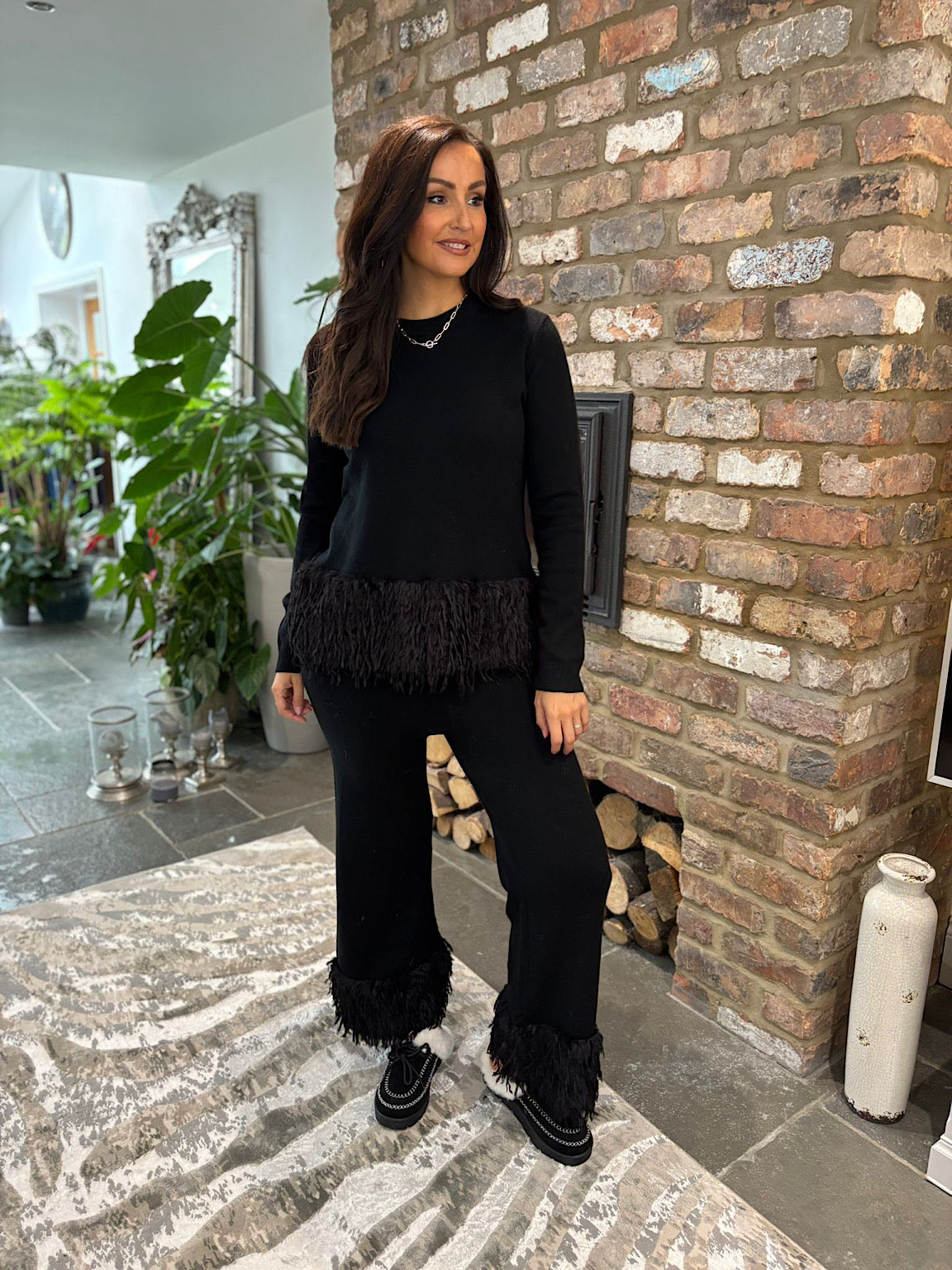 Experience warmth and comfort with the Premium Faux Feather Trouser Set Teya. Crafted from high-quality fabric, this set features a playful faux feather trim that adds a unique touch. The elasticated waist on the trousers ensures a secure yet comfortable fit, making it perfect for cosy days.