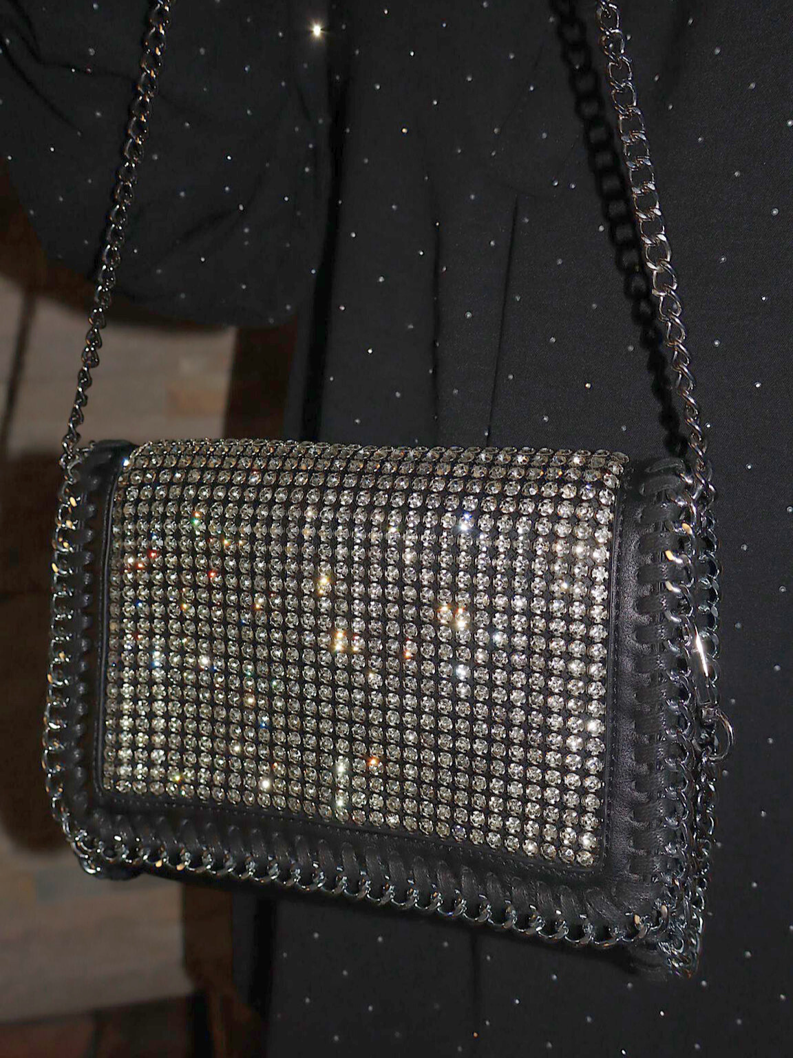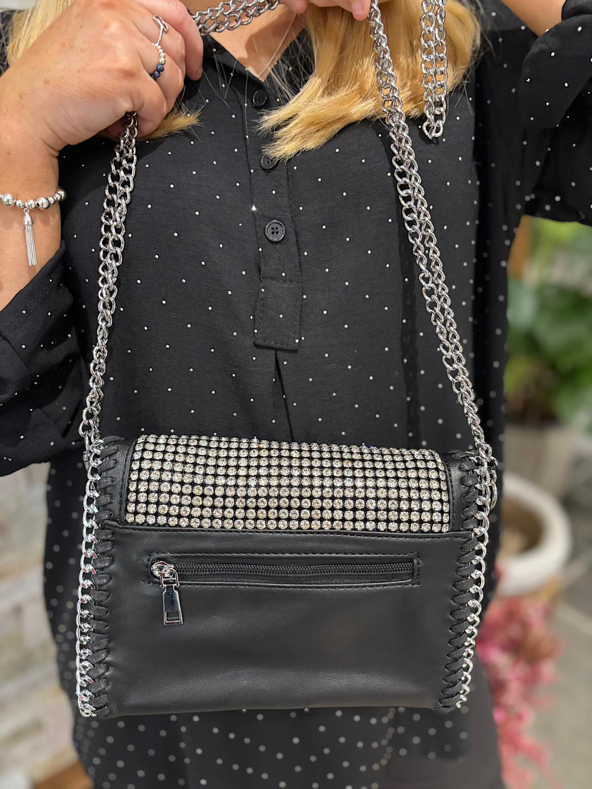 This Rhinestone Chain Shoulder Bag combines style and practicality with its faux leather construction and durable chain strap. The unique woven link detailing around the edges adds a sophisticated touch, while the diamante embellishment on the front offers subtle sparkle. Designed for versatility, it includes two chain lengths to switch up your look effortlessly. Secure your essentials with the main zip closure and an inner zip compartment for added organization. Perfect for adding a chic, reliable accessory to your wardrobe.