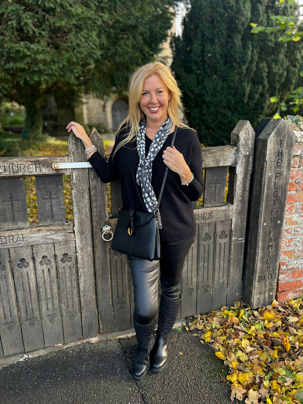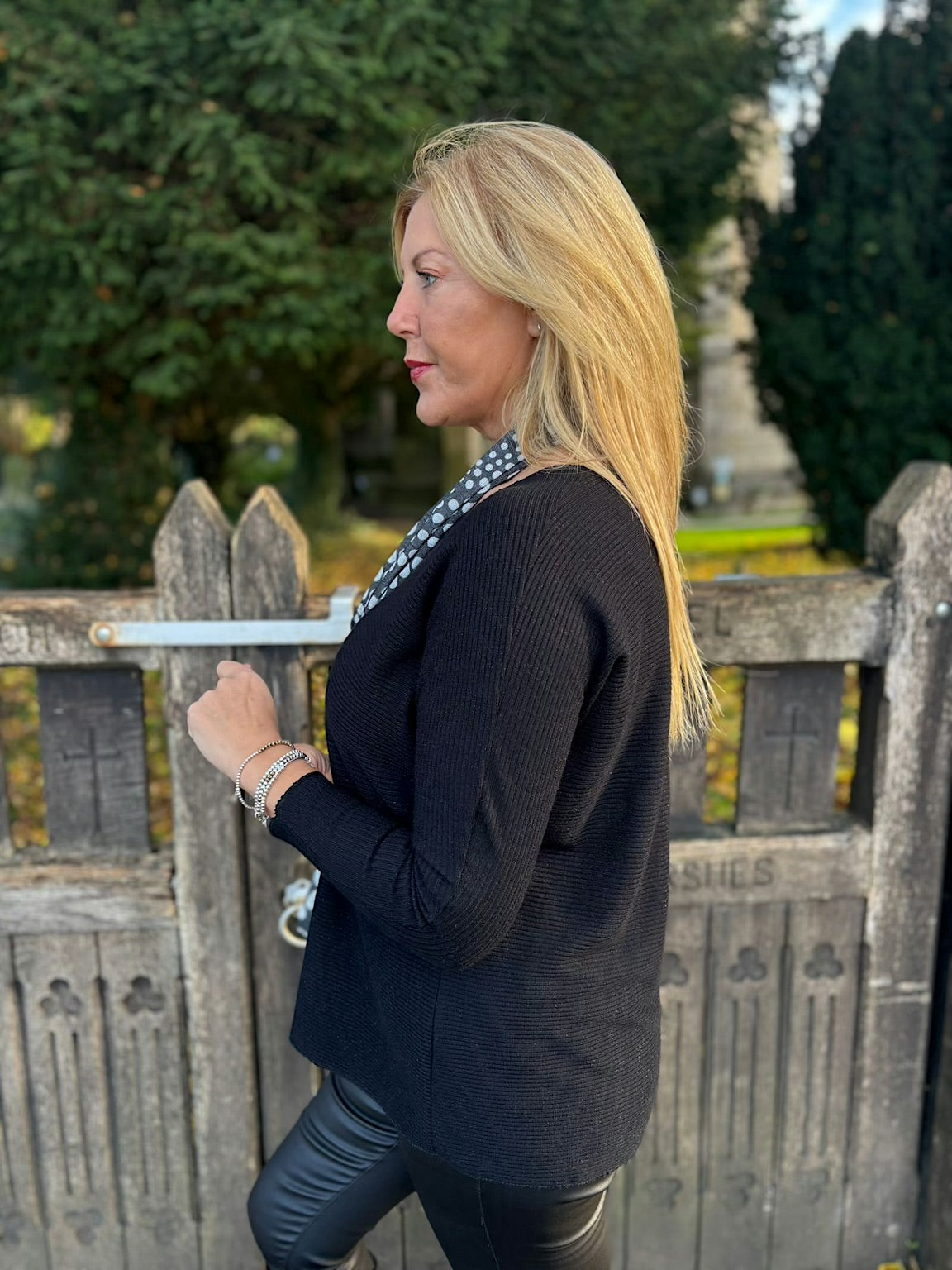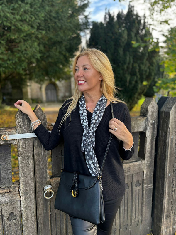 Ribbed Knit Scarf Two Piece Jo combines luxurious texture with eye-catching sparkle. The ribbed lurex shimmer knit creates an elegant foundation, while the detached polka dot shimmer scarf adds a playful finishing touch that perfectly complements the look. Layer them together for maximum impact or wear separately for versatile styling options. Perfect for elevating everyday outfits with a touch of glamour and sophistication.