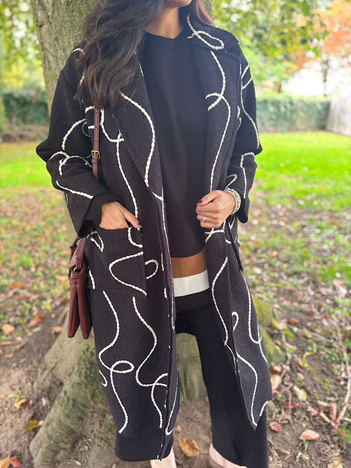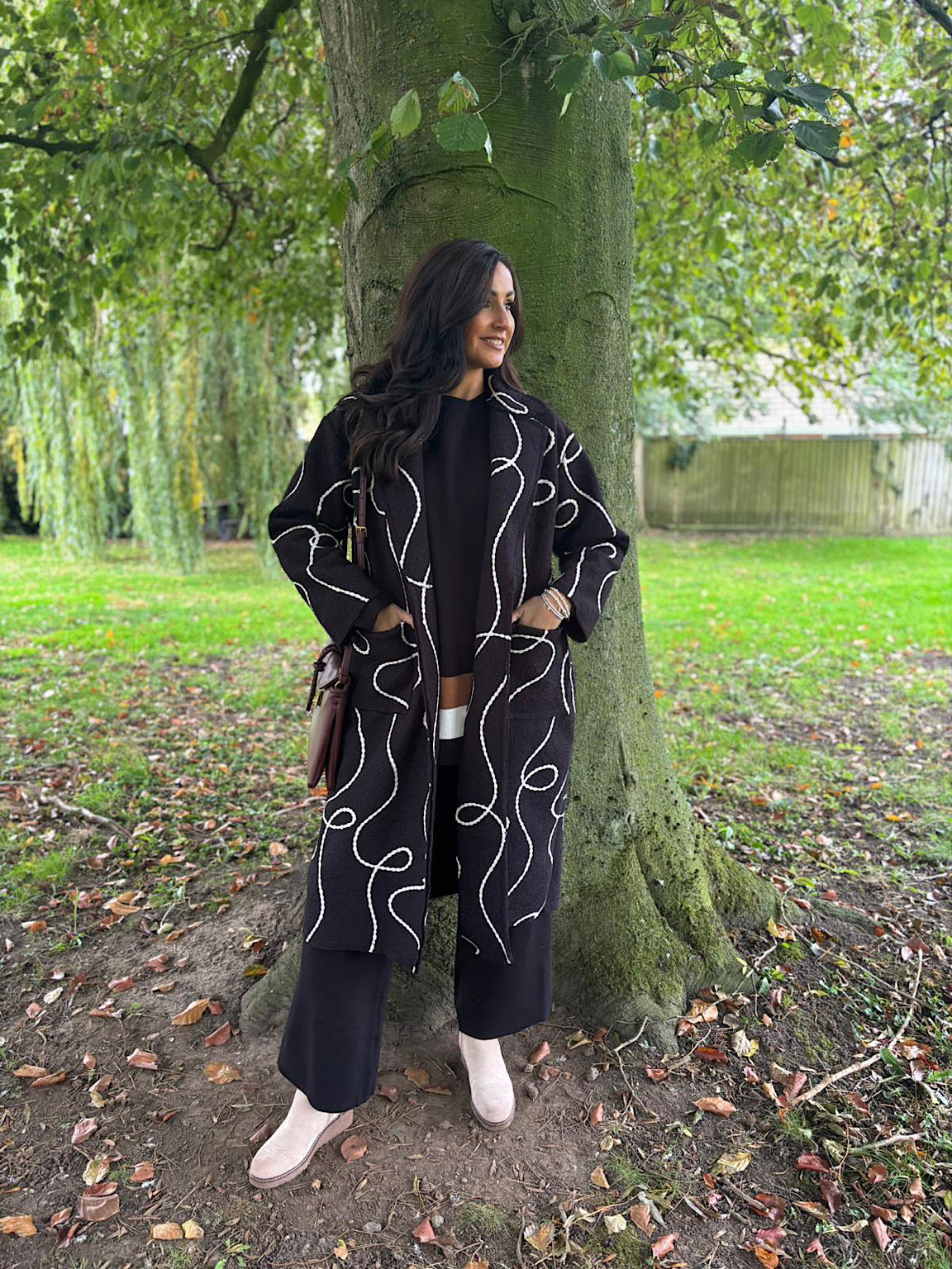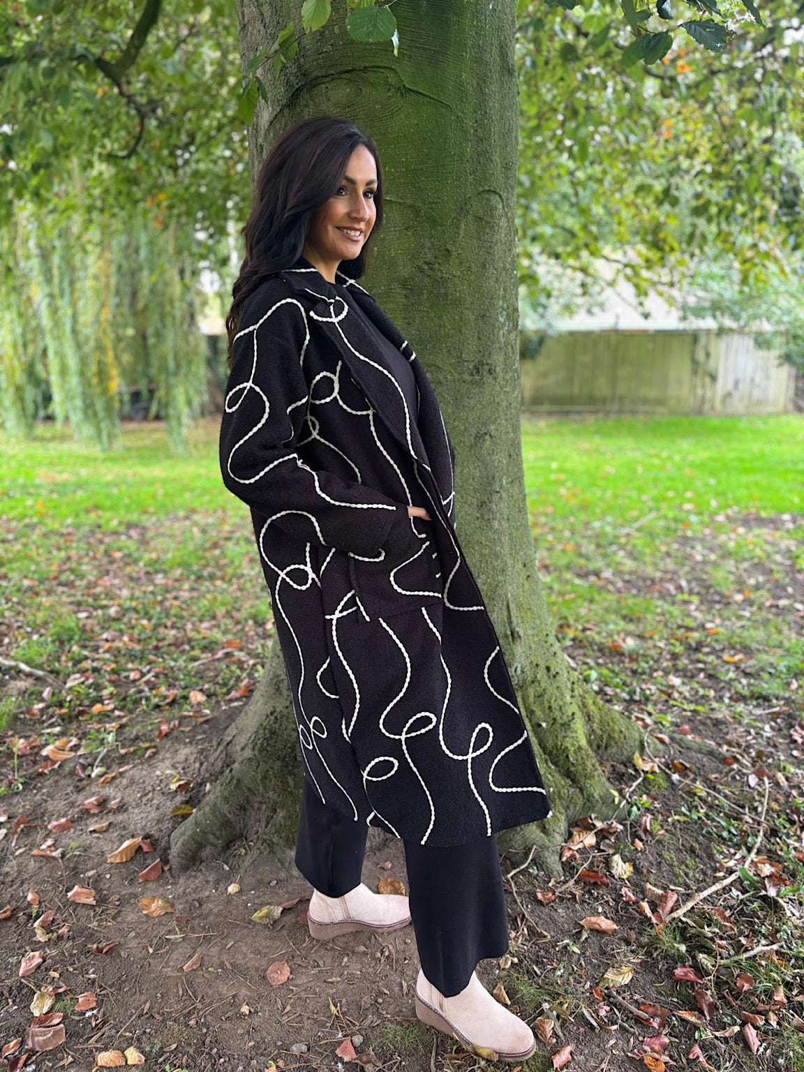 This longline coat combines a brushed wool feel with a distinctive rope-inspired weave, creating a standout design. Its unique texture adds warmth and style, making it perfect for layering in cooler weather while offering a flattering, elongated silhouette. Practical yet elegant, it's an ideal choice to elevate your wardrobe with comfort and character.