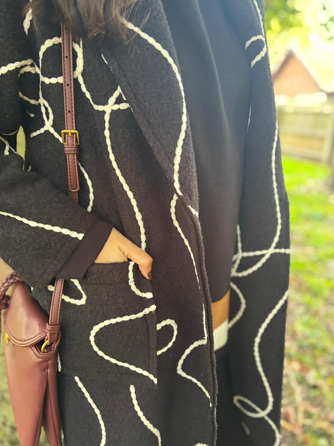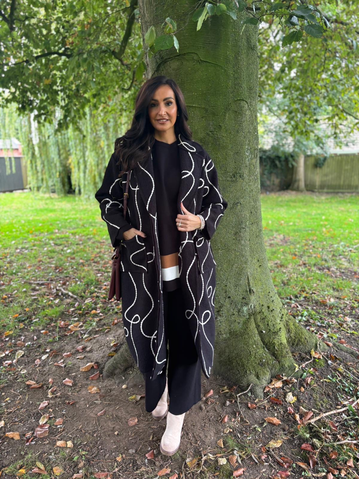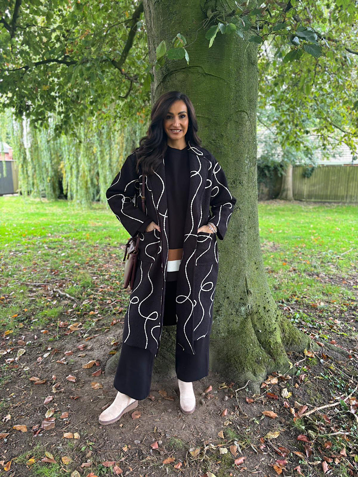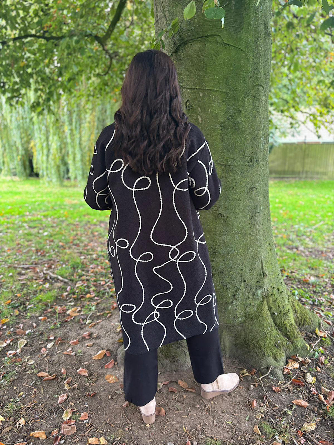 This longline coat combines a brushed wool feel with a distinctive rope-inspired weave, creating a standout design. Its unique texture adds warmth and style, making it perfect for layering in cooler weather while offering a flattering, elongated silhouette. Practical yet elegant, it's an ideal choice to elevate your wardrobe with comfort and character.