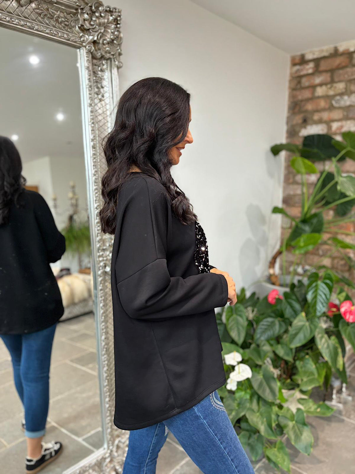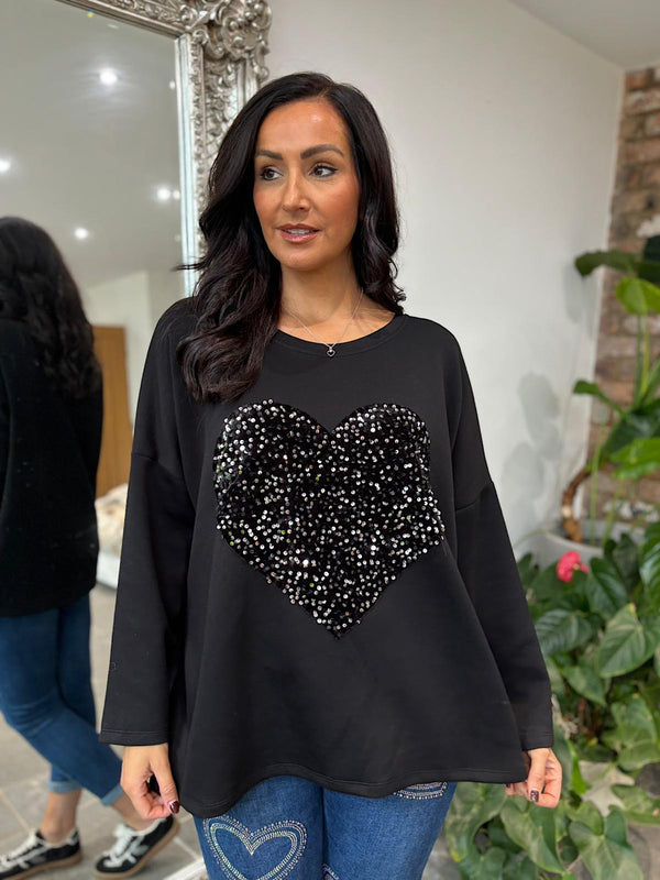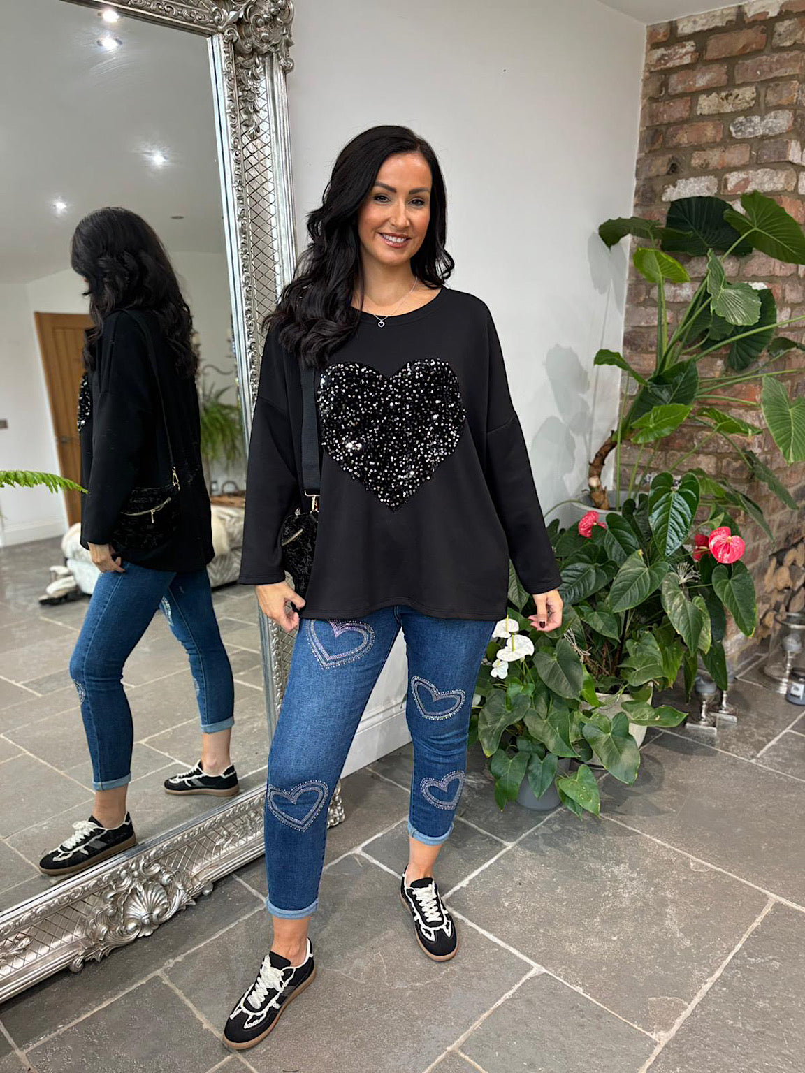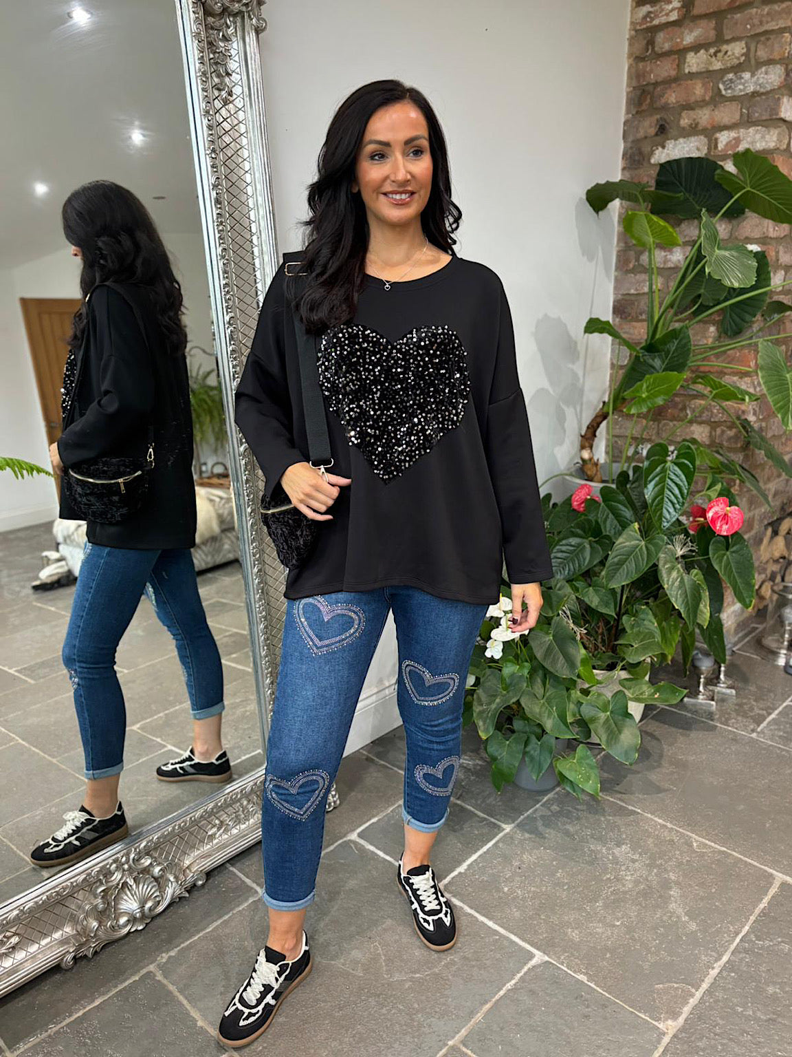 The Sequin Heart Sweat Top Sara offers cosy comfort with a soft velour heart embellished with delicate sequins, adding a touch of sparkle. Inspired by the Esme collection, this sweat top brings warmth and subtle glamour to your everyday look, supporting both style and ease.