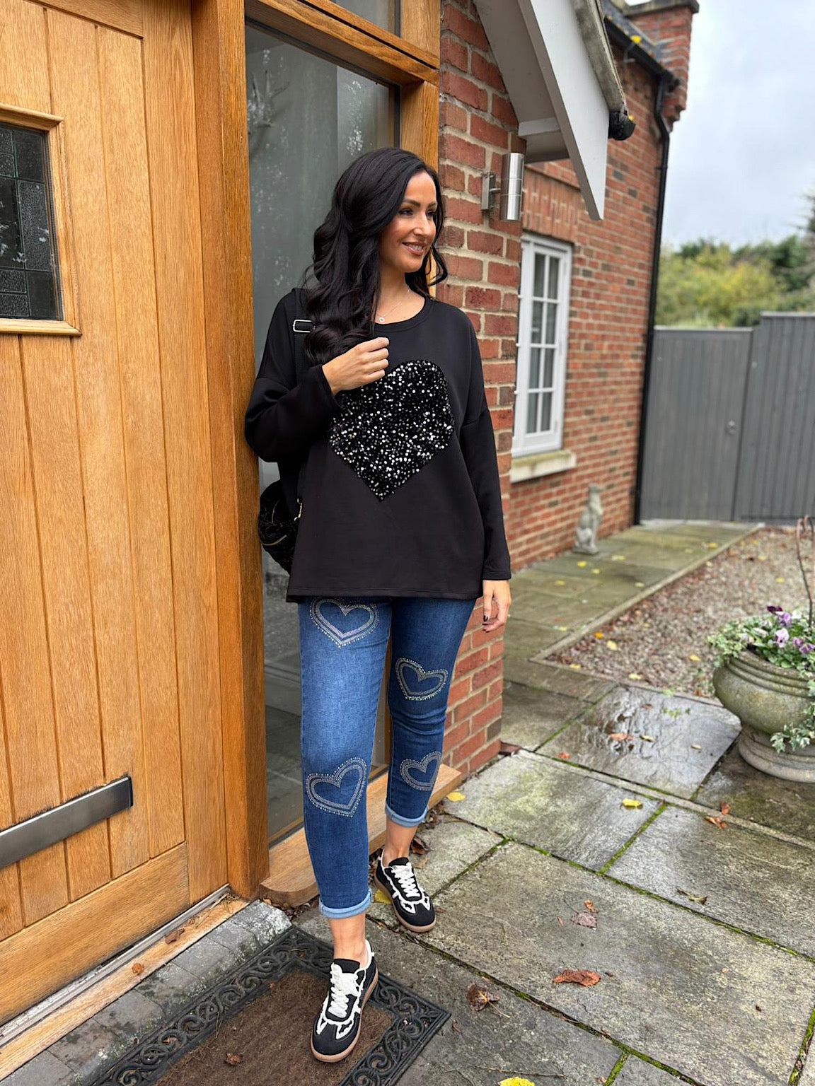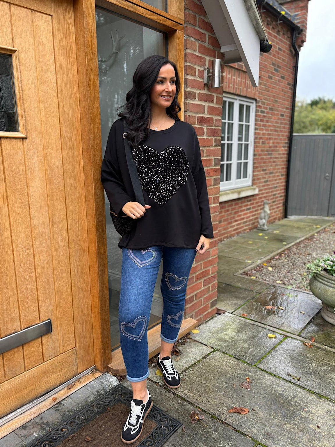Styled with.....>Denim Embellished Multi Heart Jeans/ Black Harper Lace Detail Trainer