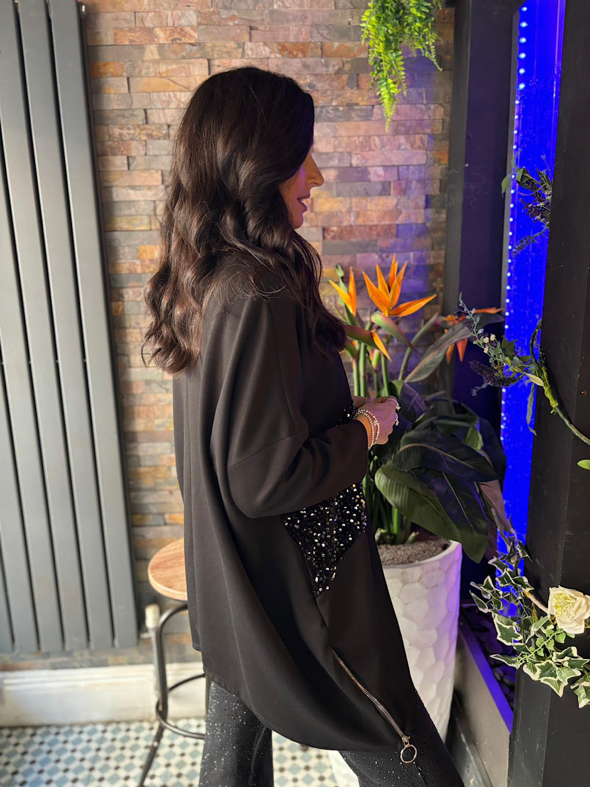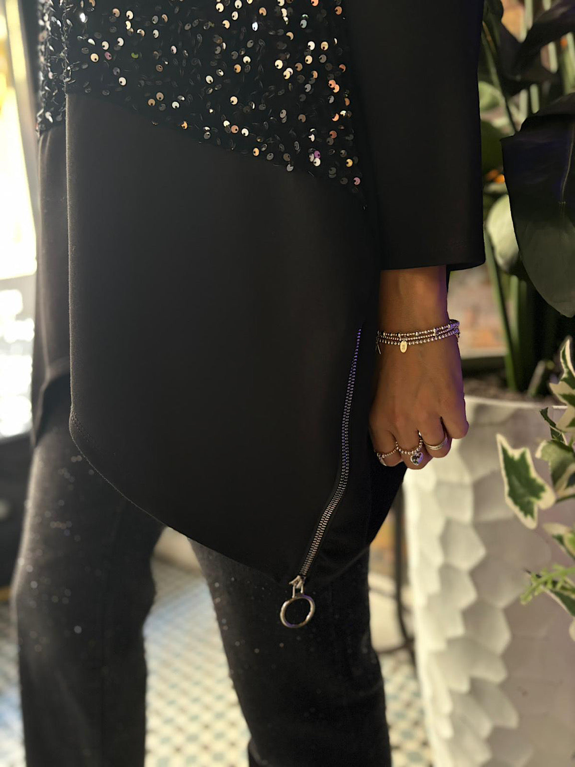 Elevate your casual wardrobe with the Sequin Panel Sweat Top Mandy, featuring a luxurious velour panel adorned with delicate sequins for a refined touch. Crafted from fabric reminiscent of the elegant Esme collection, this top combines comfort with understated glamour. Side zips add a subtle detail, enhancing both fit and style for a sophisticated look.