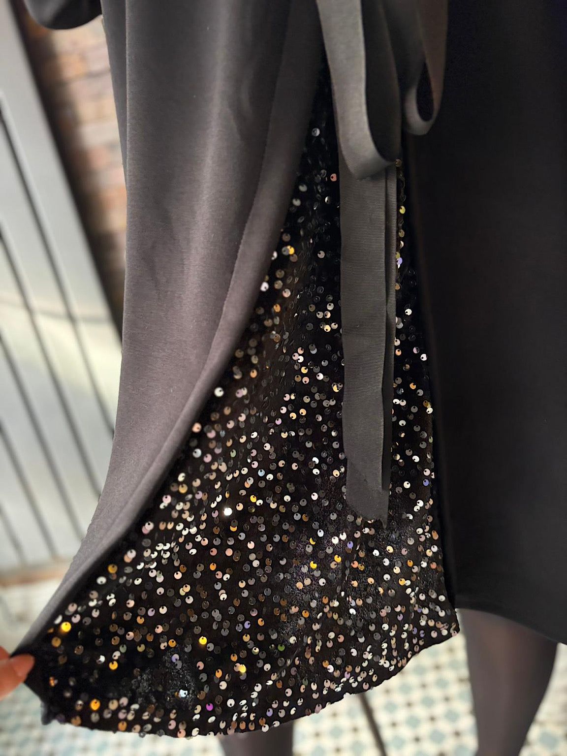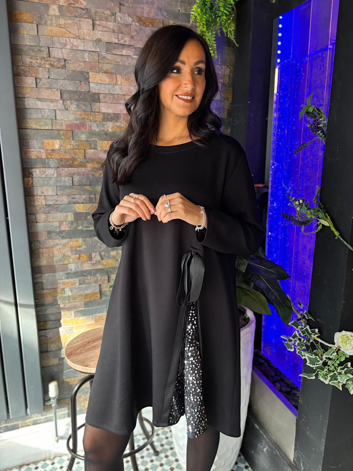 This Sequin Panel Sweatshirt Dress Olive features a smooth, soft fabric reminiscent of our Esme Collection. Its standout detail is a delicate ribbon accent set against a velour sequin panel, offering subtle sparkle and texture. Designed for comfort and style, this dress is perfect for those seeking a cosy yet refined look.