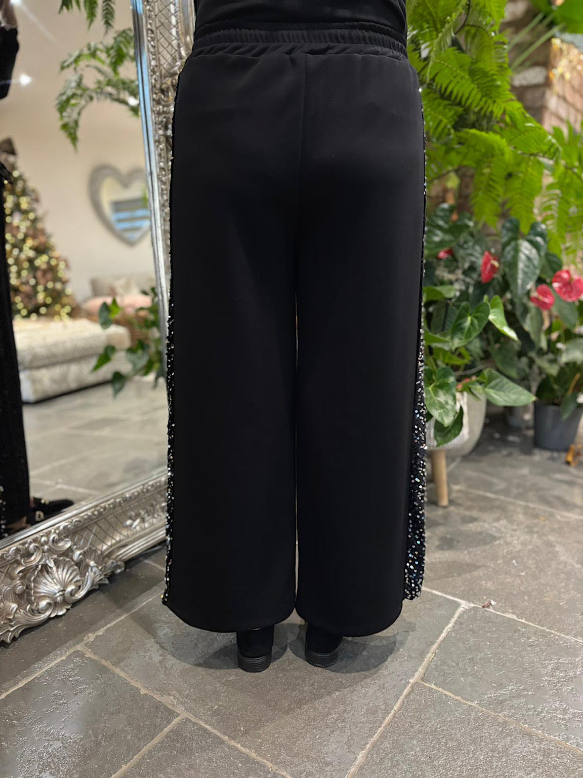 Elevate your loungewear with these Sequin Velour Trim Joggers Trixie. Crafted from the same soft, comfortable material you love from our Esme collection, these joggers feature a striking sequin velour panel running down each side for a touch of glamour. The adjustable drawstring waist ensures a perfect fit for all-day comfort, whether you're relaxing at home or stepping out in style.