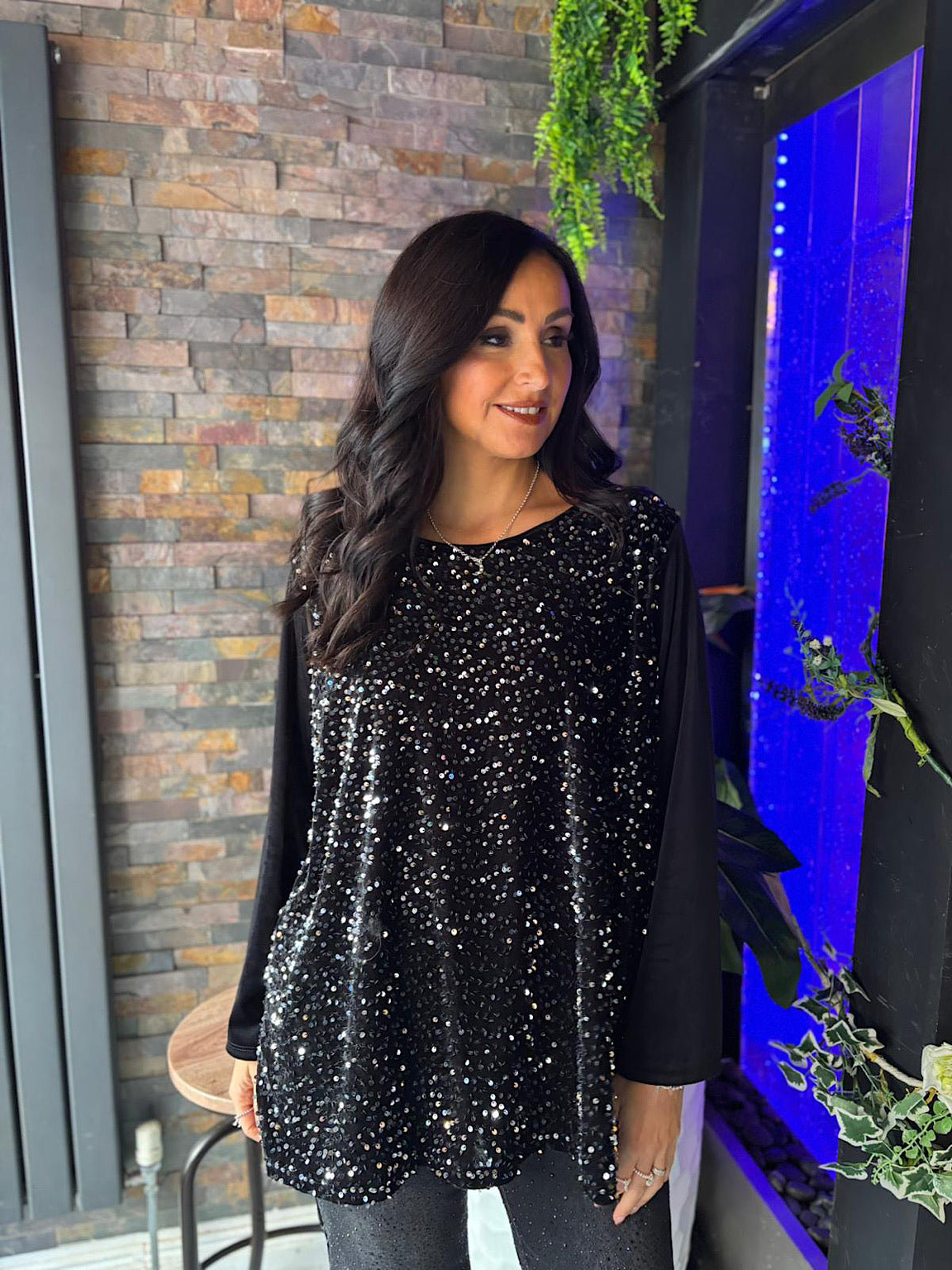 Elevate your wardrobe with this striking Velour Sequin Panel Top. The luxurious velour front pairs beautifully with eye-catching sequin detailing, creating a piece that's perfect for special occasions or when you want to feel confident and glamorous. The Raven colourway offers timeless sophistication, while the textured combination adds depth and visual interest. Whether you're dressing up for an event or adding sparkle to your everyday look, this top delivers both comfort and style in one stunning design.
