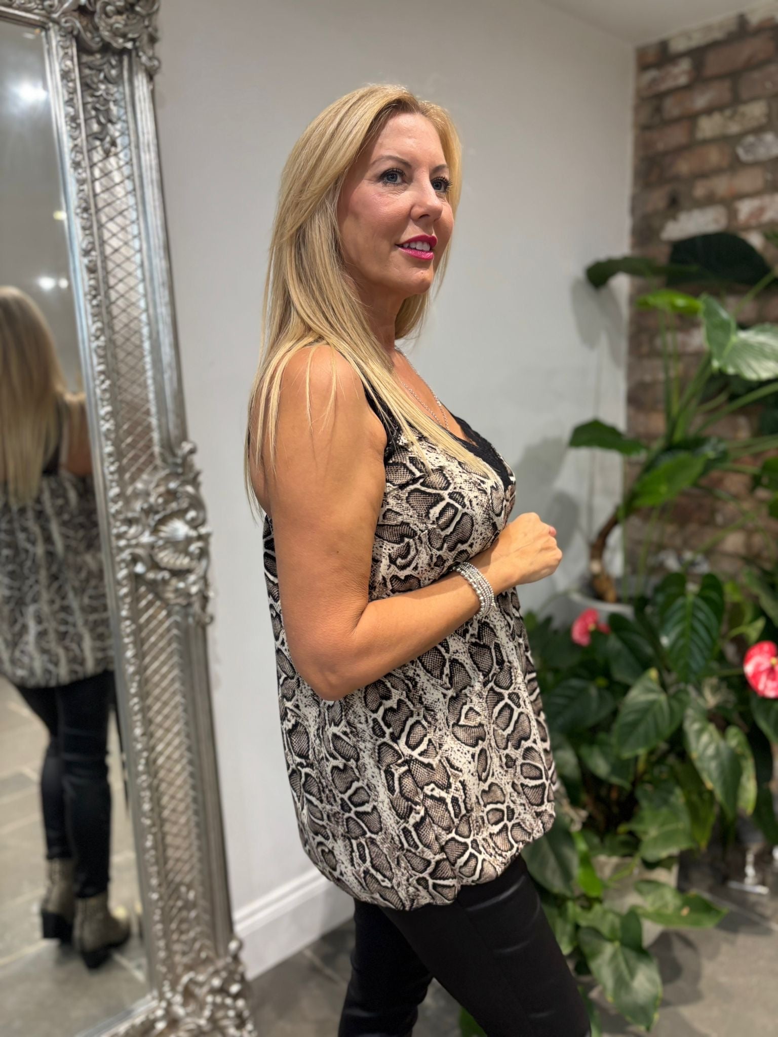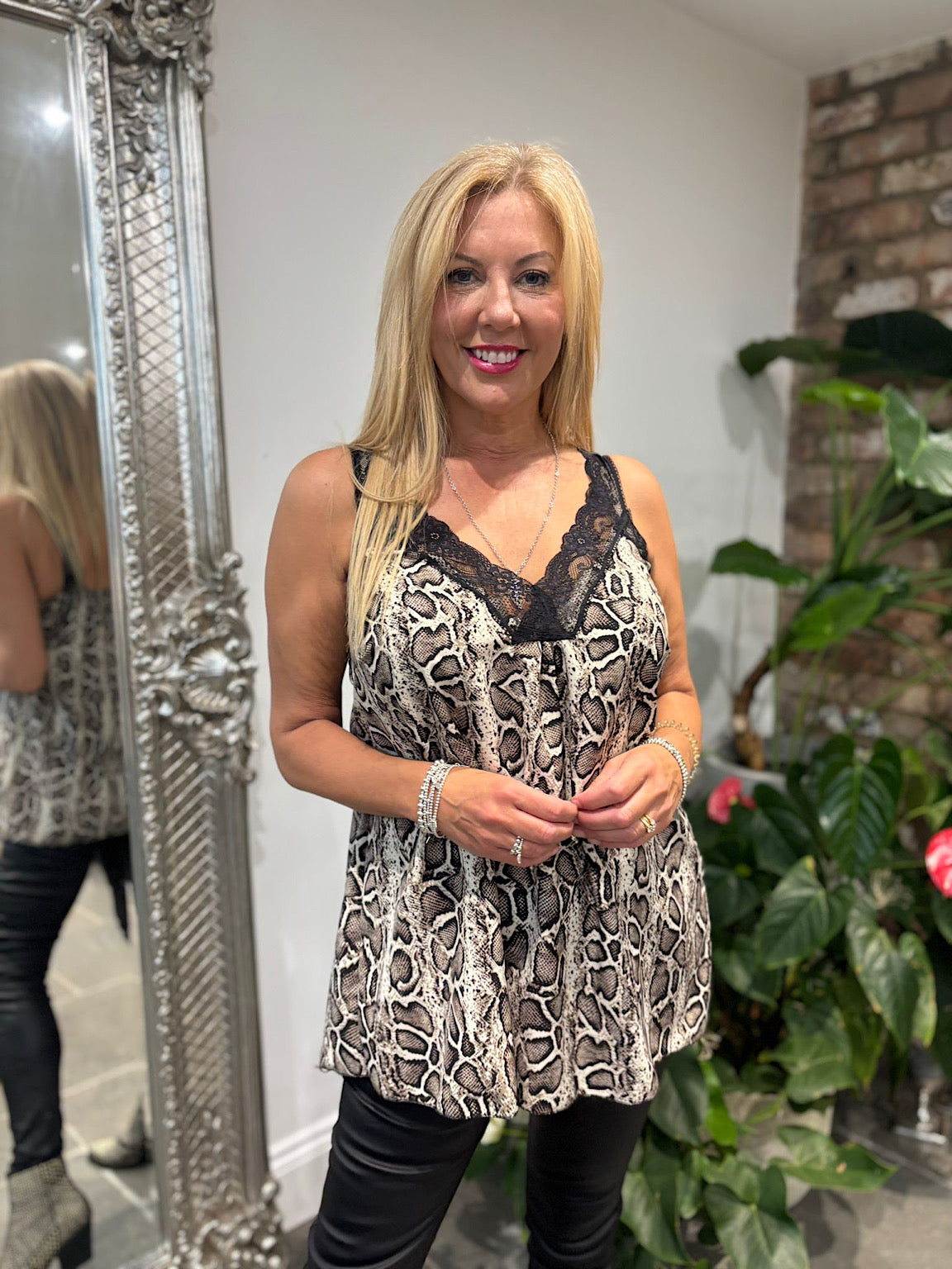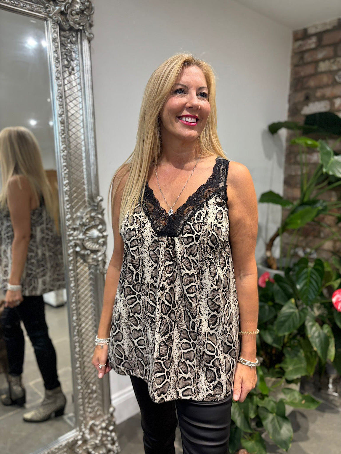 This Lace Trim Vest Megan features delicate lace detailing along the neckline and straps, adding a touch of elegance to your outfit. With an elasticated back, it ensures a comfortable and flexible fit throughout the day. Perfect for layering or wearing alone, this vest combines style and ease for everyday wear.