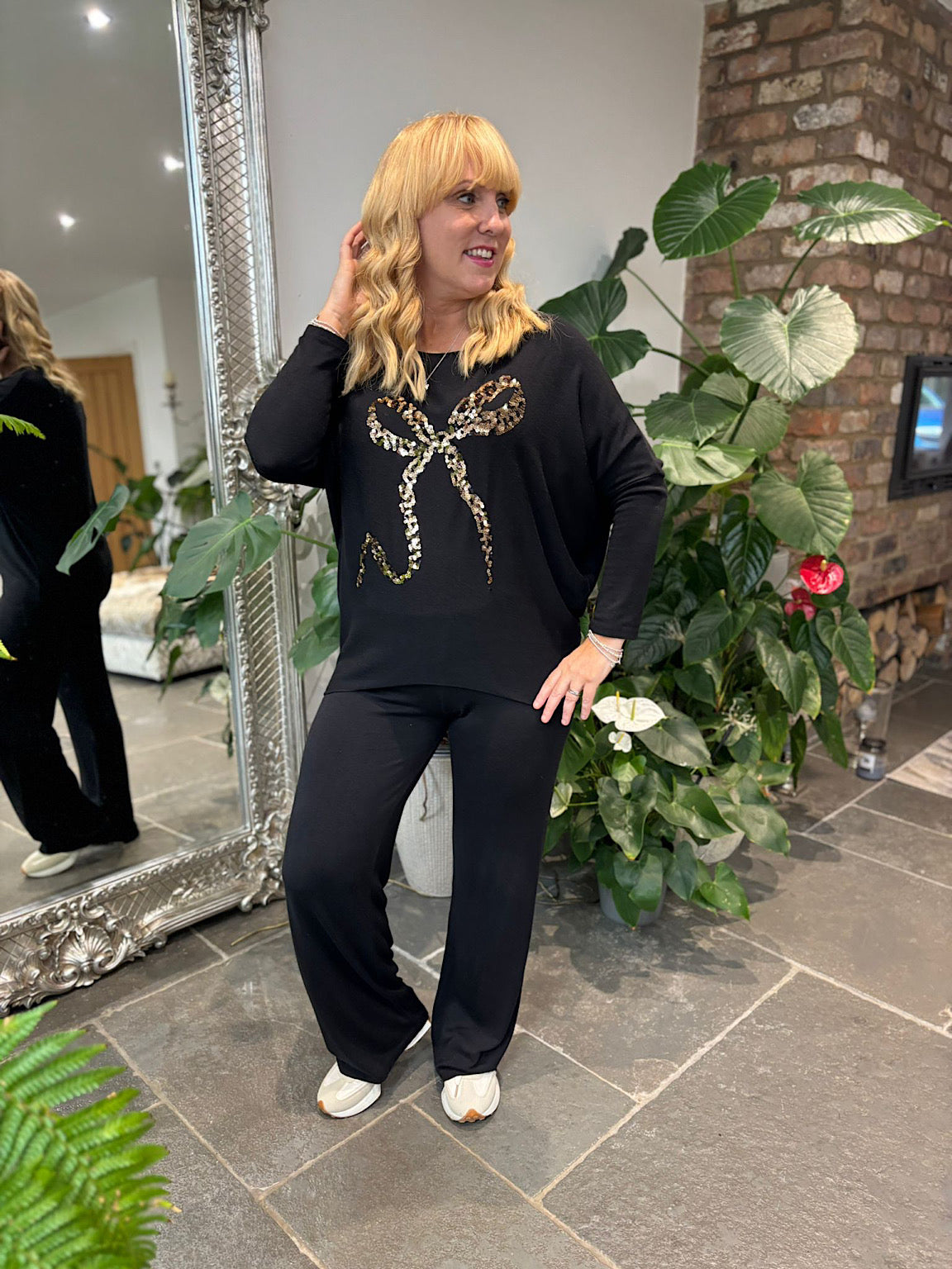 Styled with.....>Stone Ebony Trainer/ Black Striped Top Annie/ Black Sequin Bow Soft Knit Zoe