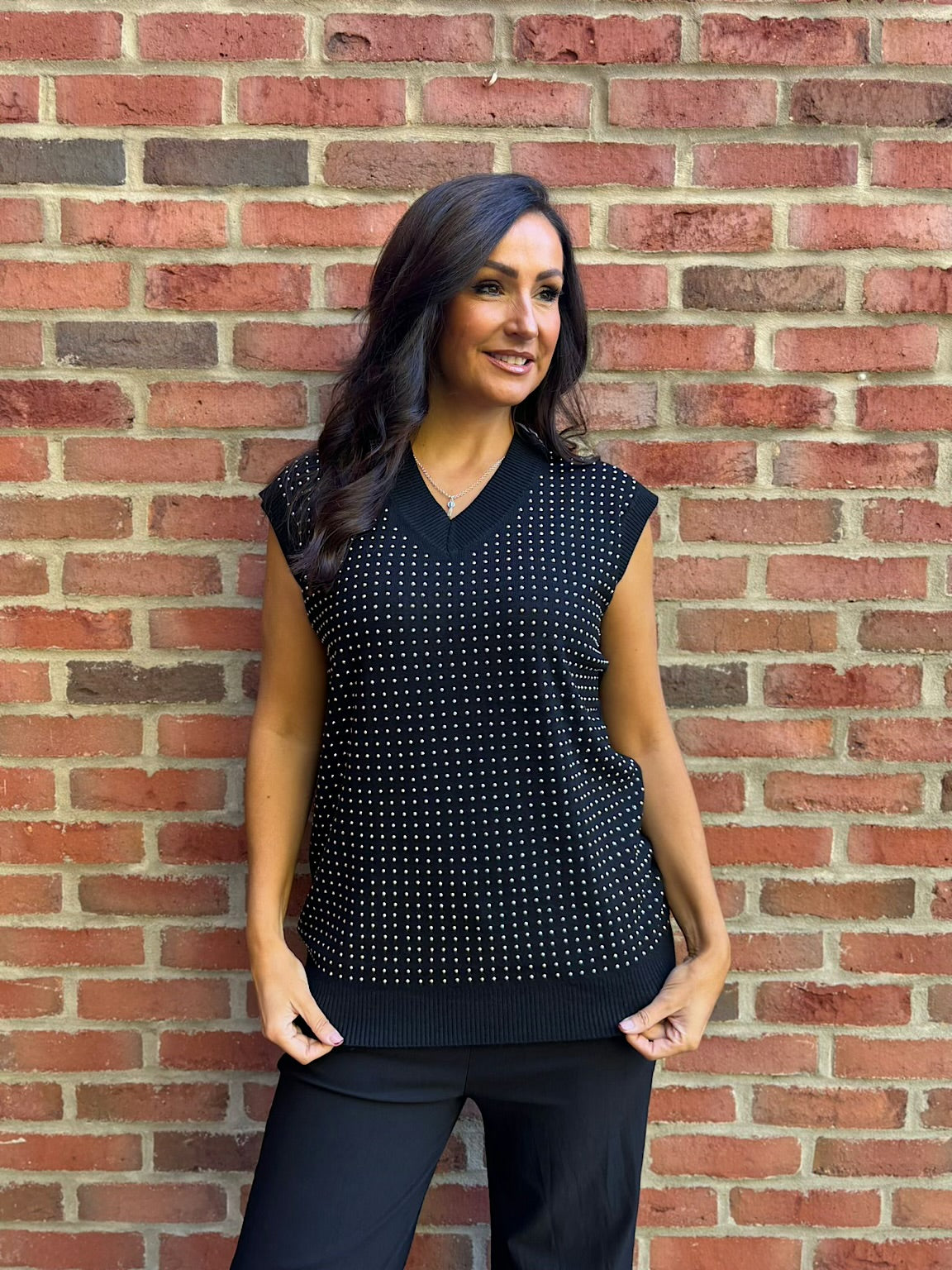 Crafted from high-quality fabric, the Studded V Neck Tank Top Serena offers both comfort and style. Its delicate tiny stud detailing adds a subtle sparkle, perfect for enhancing your outfit with a touch of elegance. Ideal for layering or wearing alone, this tank top supports your look with understated sophistication.