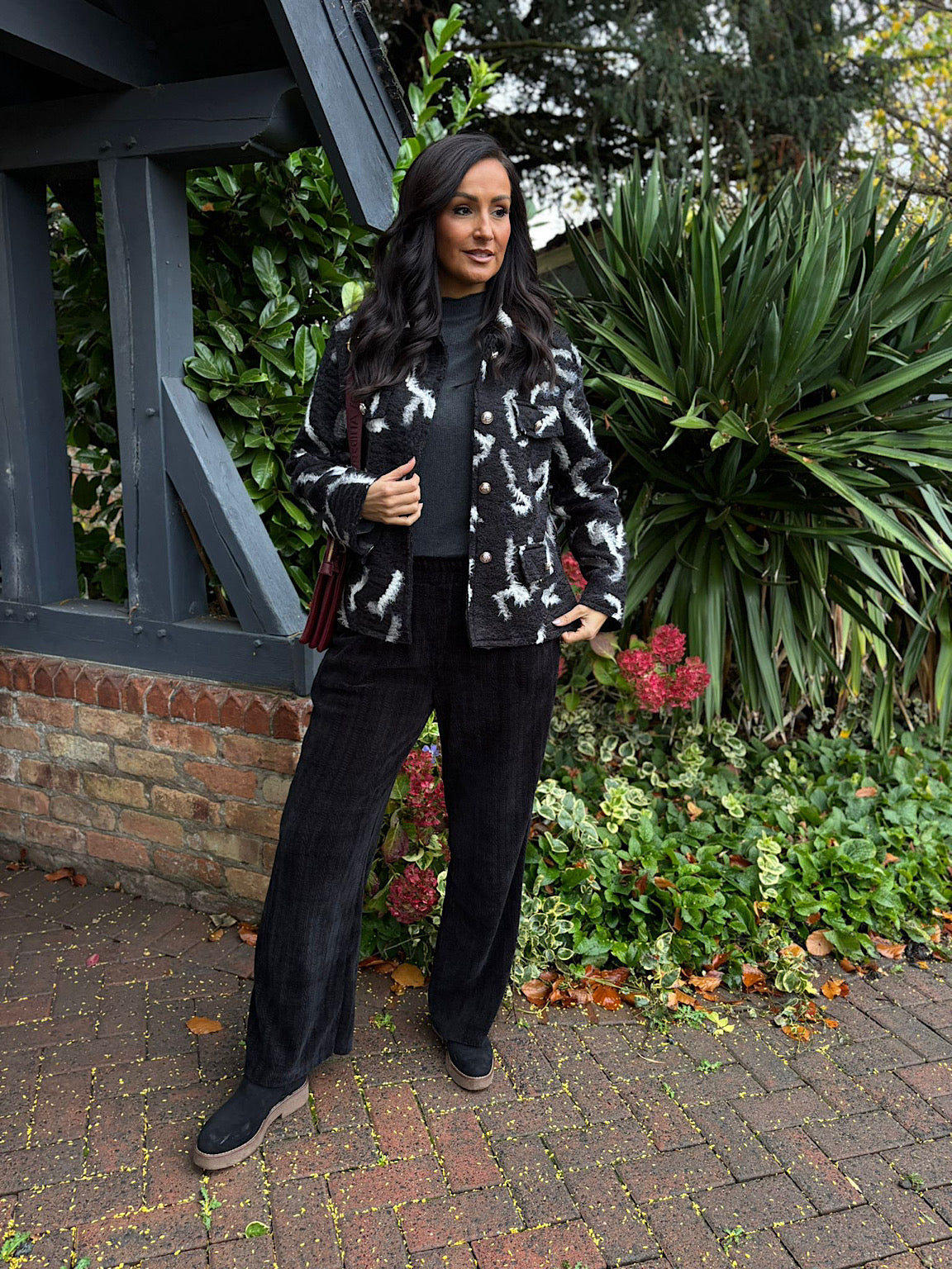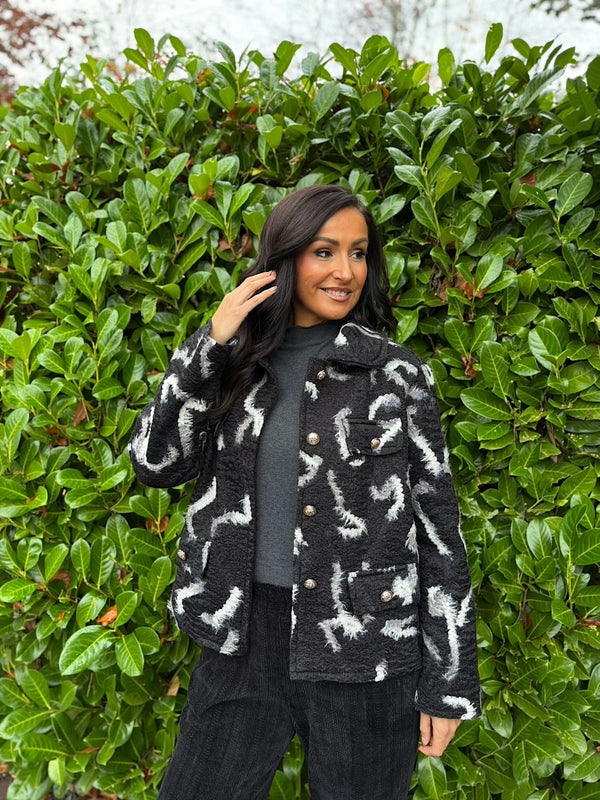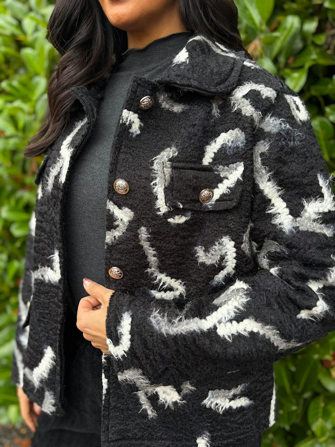 Meet the Swirl Pattern Coat Elsa—a timeless piece designed to elevate your everyday style. Featuring a beautifully soft fabric adorned with an elegant swirl pattern, this coat offers both visual appeal and tactile comfort. The thoughtfully designed false pockets create a streamlined look, whilst distinctive gold button accents provide a sophisticated finishing touch. Versatile enough for any occasion, this coat supports your personal style with quality construction and enduring elegance.