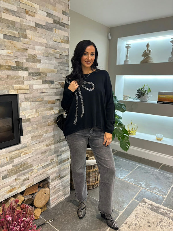 Styled with.....>Black Textured Velour Crossbody Bag/ Black Stud Embellished Ankle Boots/ Grey Wide Leg Diamante Heart Jeans
